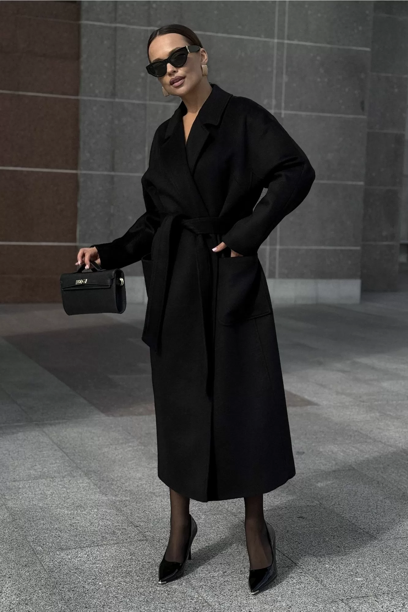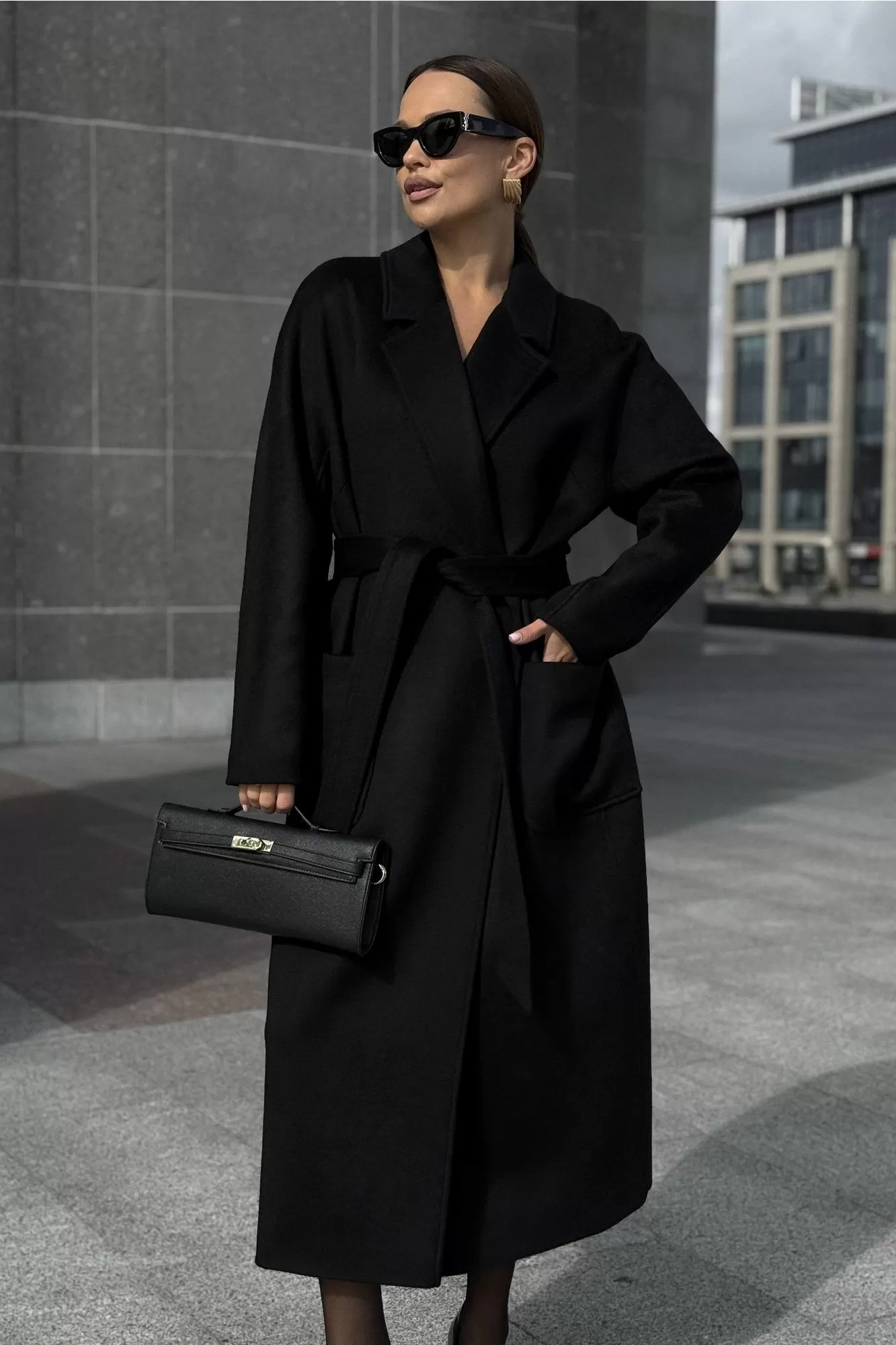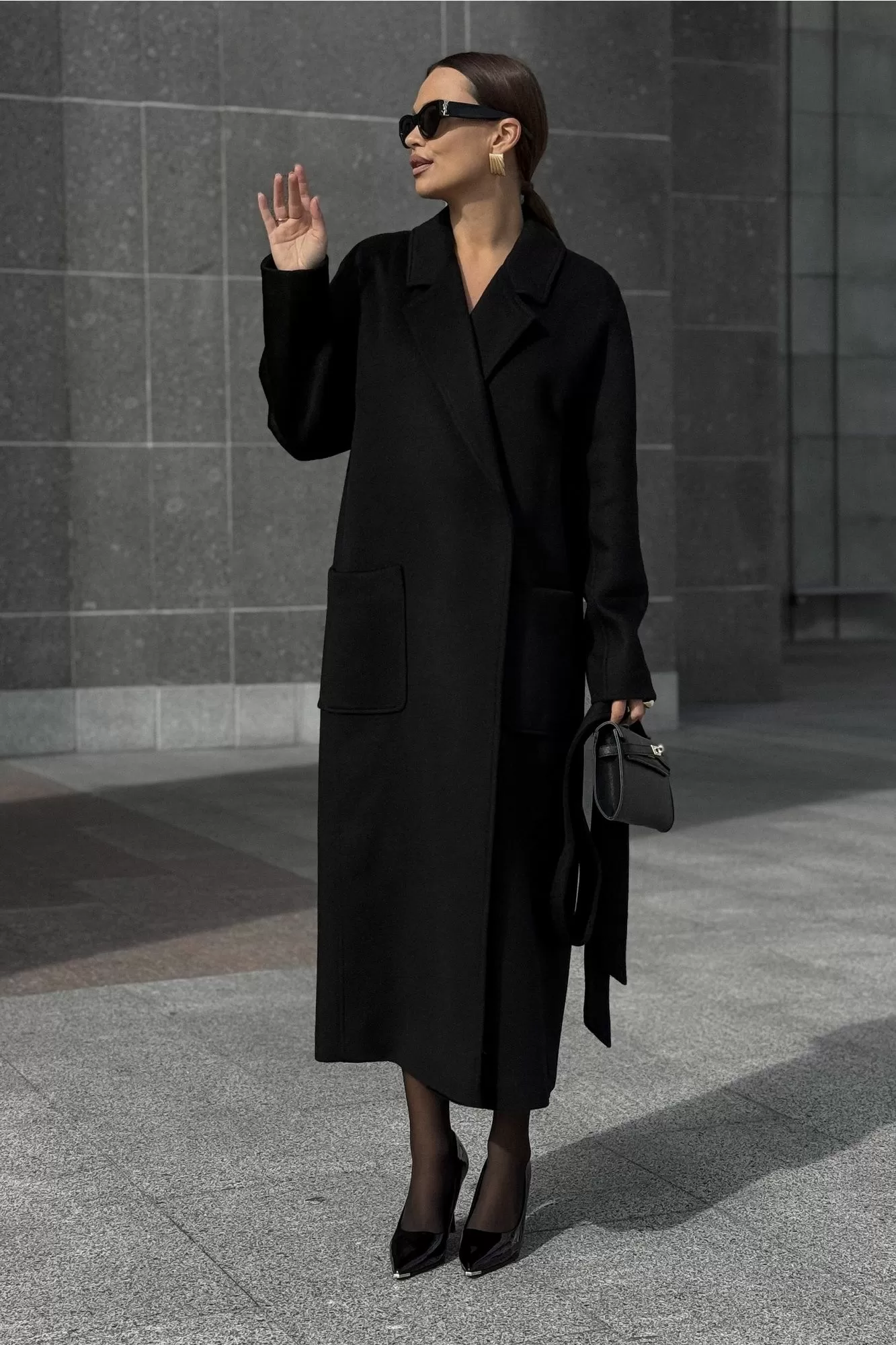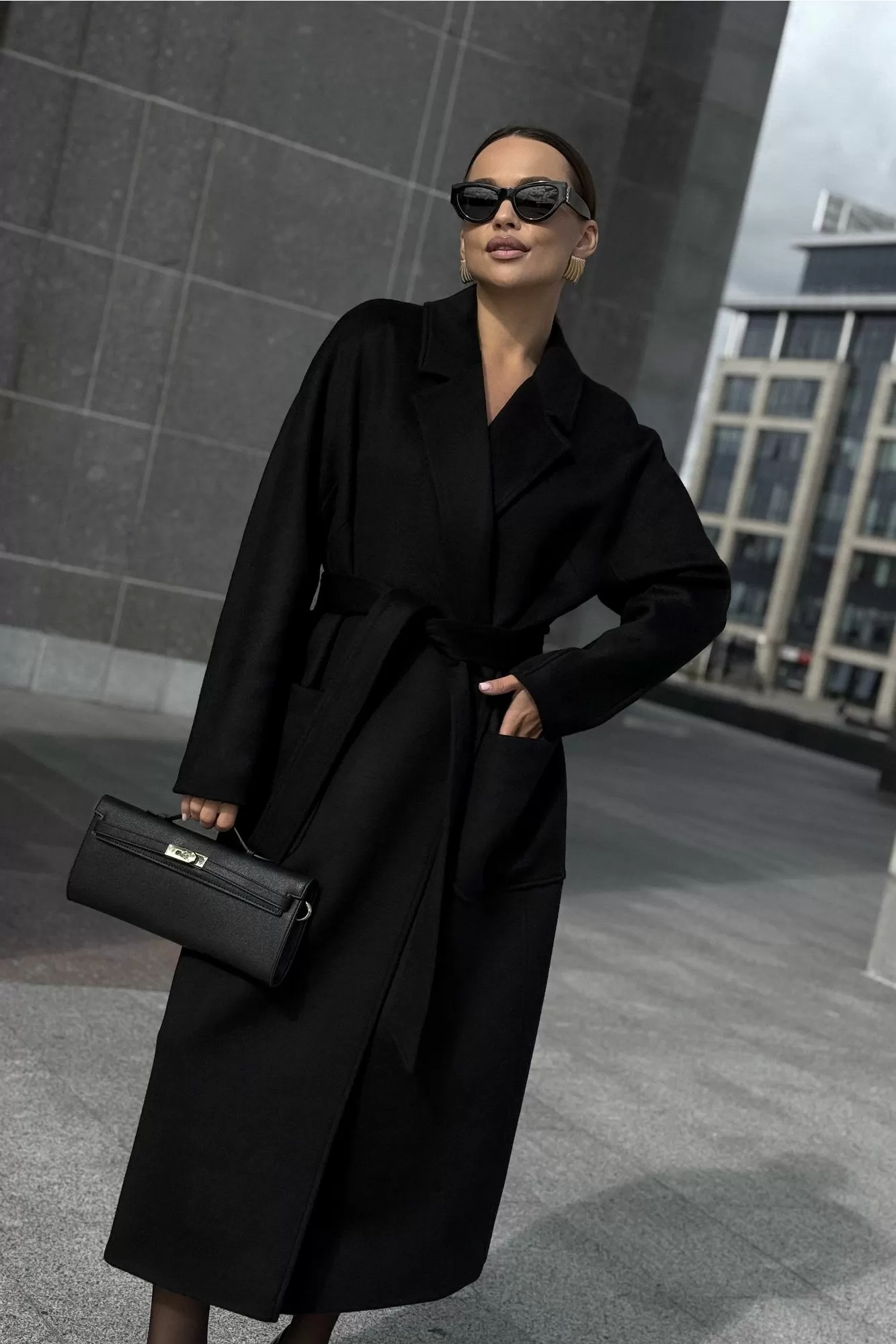 Пальто женское двубортное , выполнено из пальтовой ткани великолепного качества . Рукав спущенный , воротник стояче-отложной с отворотами лацканов . По переду накладные карманы , в комплекте пояс из основной ткани .