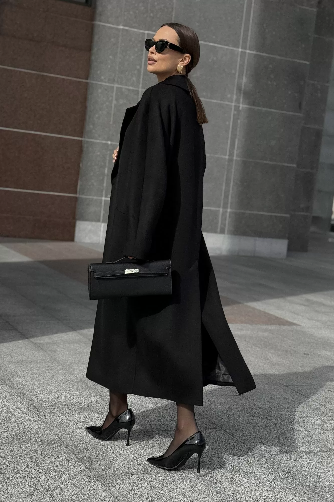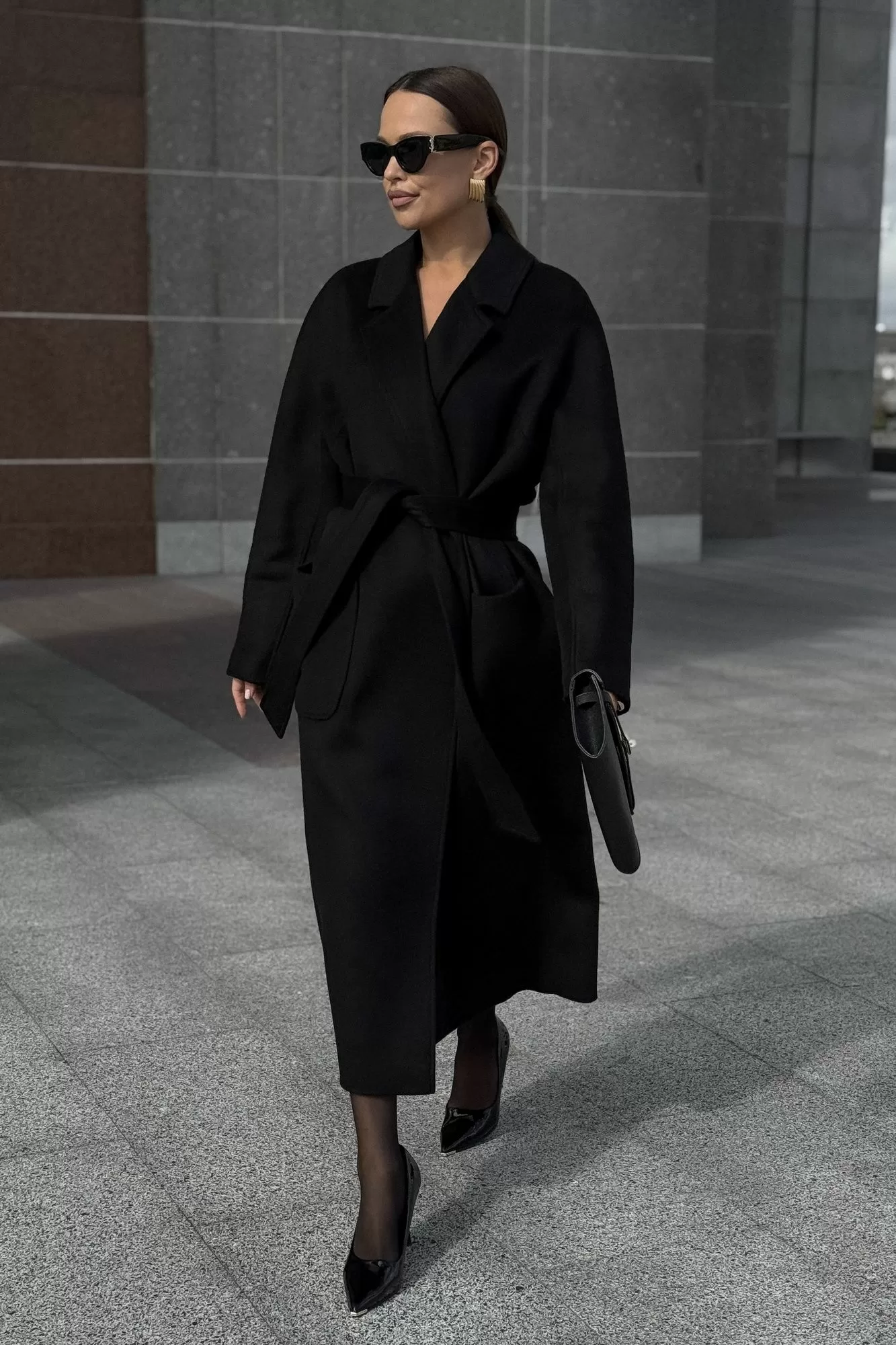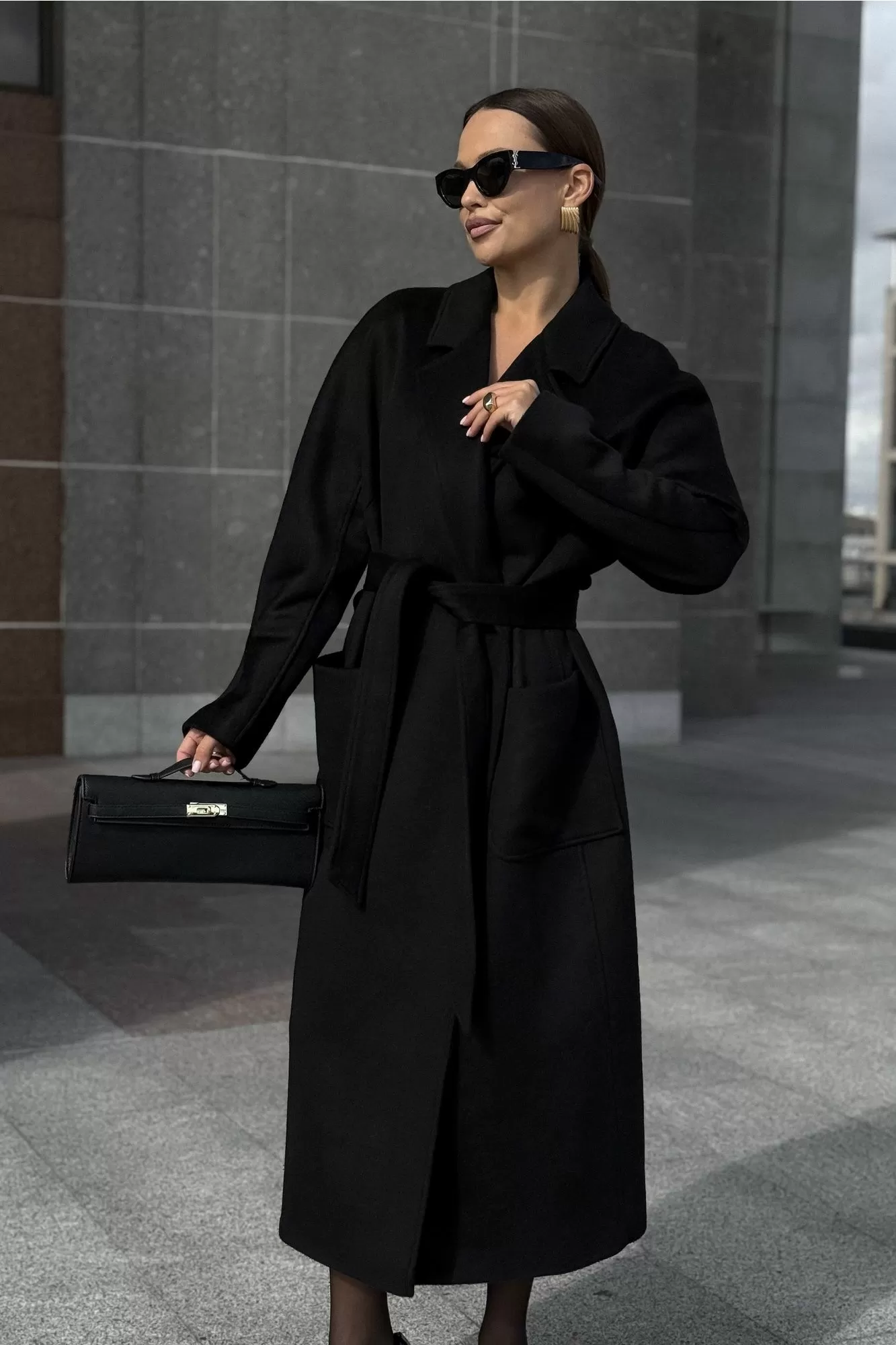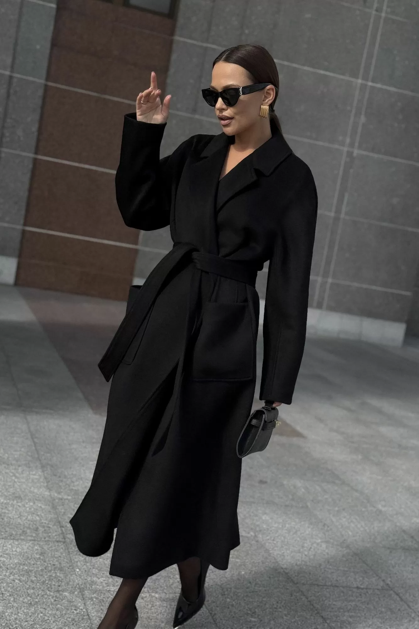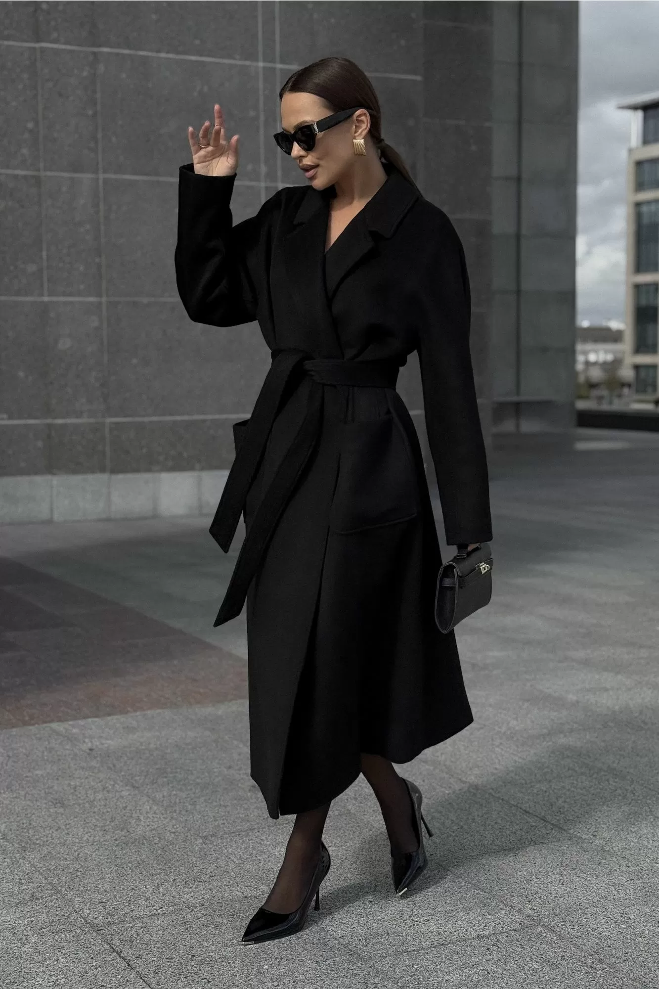 Пальто женское двубортное , выполнено из пальтовой ткани великолепного качества . Рукав спущенный , воротник стояче-отложной с отворотами лацканов . По переду накладные карманы , в комплекте пояс из основной ткани .