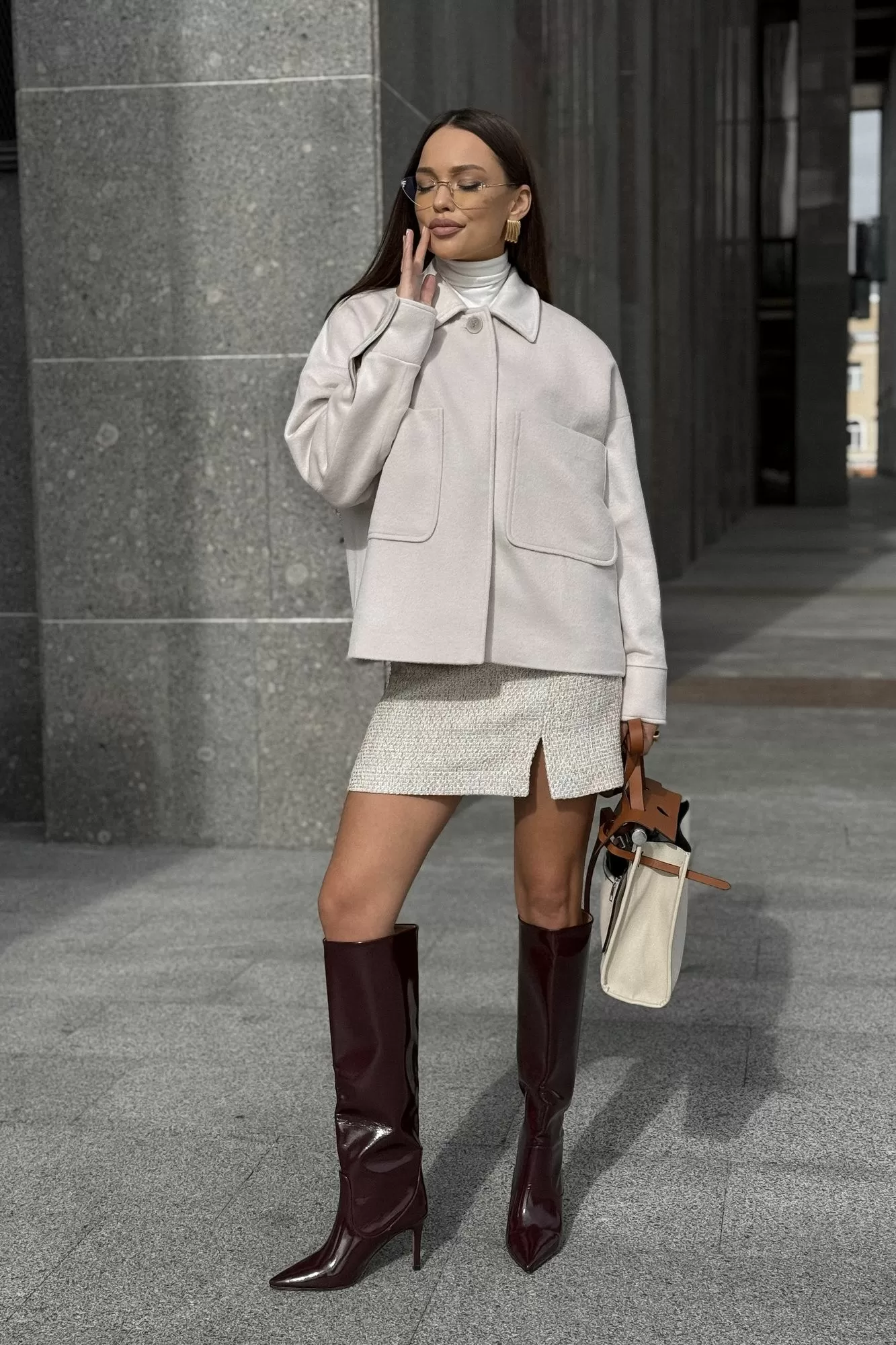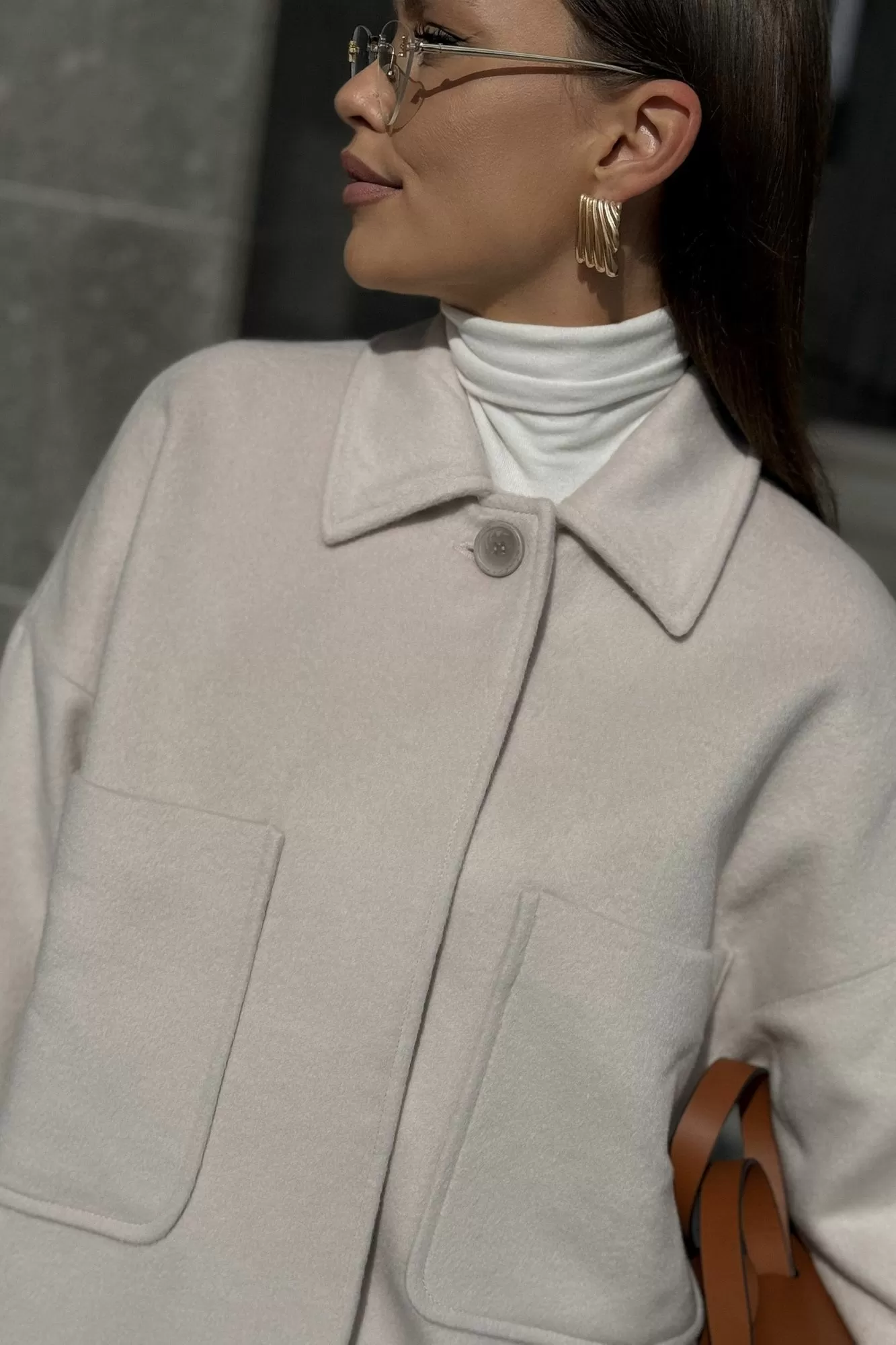 Пальто женское , укороченное выполнено из пальтовой ткани хорошего качества . Застежка центральная , потайная на петли и пуговицы . Рукав спущенный , низ рукава обработан притачной манжетой .Воротник стояче -отложной . По переду накладные карманы.