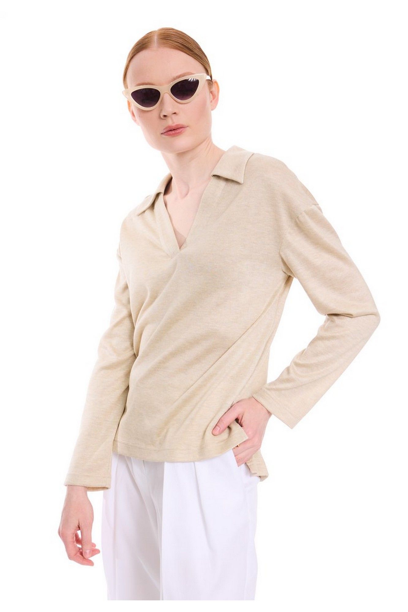 Свободный прямой лонгслив из премиального трикотажного полотна природного оттенка. Отложной воротник-поло и V-образный вырез горловины с планкой -неотъемлимый тренд этого сезона. Спинка с ассиметричным низом и разрезами в боковых швах. Лаконичный дизайн делает этот джемпер уместным в любой ситуации, обеспечивая комфорт и стиль в течение всего дня.