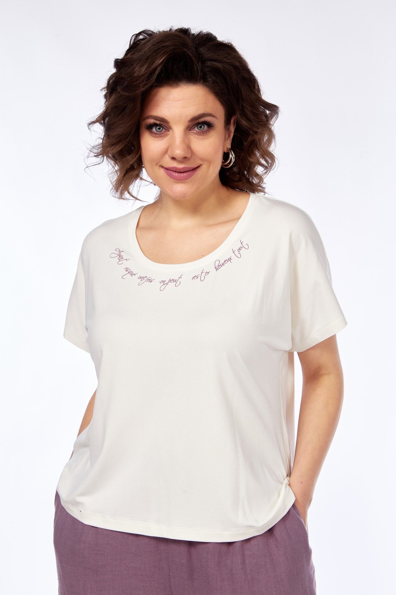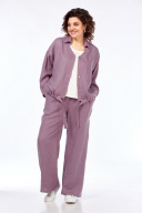 Комплект брючный состоит из кардигана, майки и брюк. Кардиган свободного кроя с застежкой на петли и пуговицы. Перед с кулисой и завязками по низу. Спинка с округлой формой низа и ассиметричным передом. Рукав одношовный, длиной 3/4 со спущенной линией плеча. Горловина V-образной формы с воротником. Брюки прямые, пояс на резинке, с боковыми карманами. Майка трикожная со спущенной линией плеча. Горловина округлая.