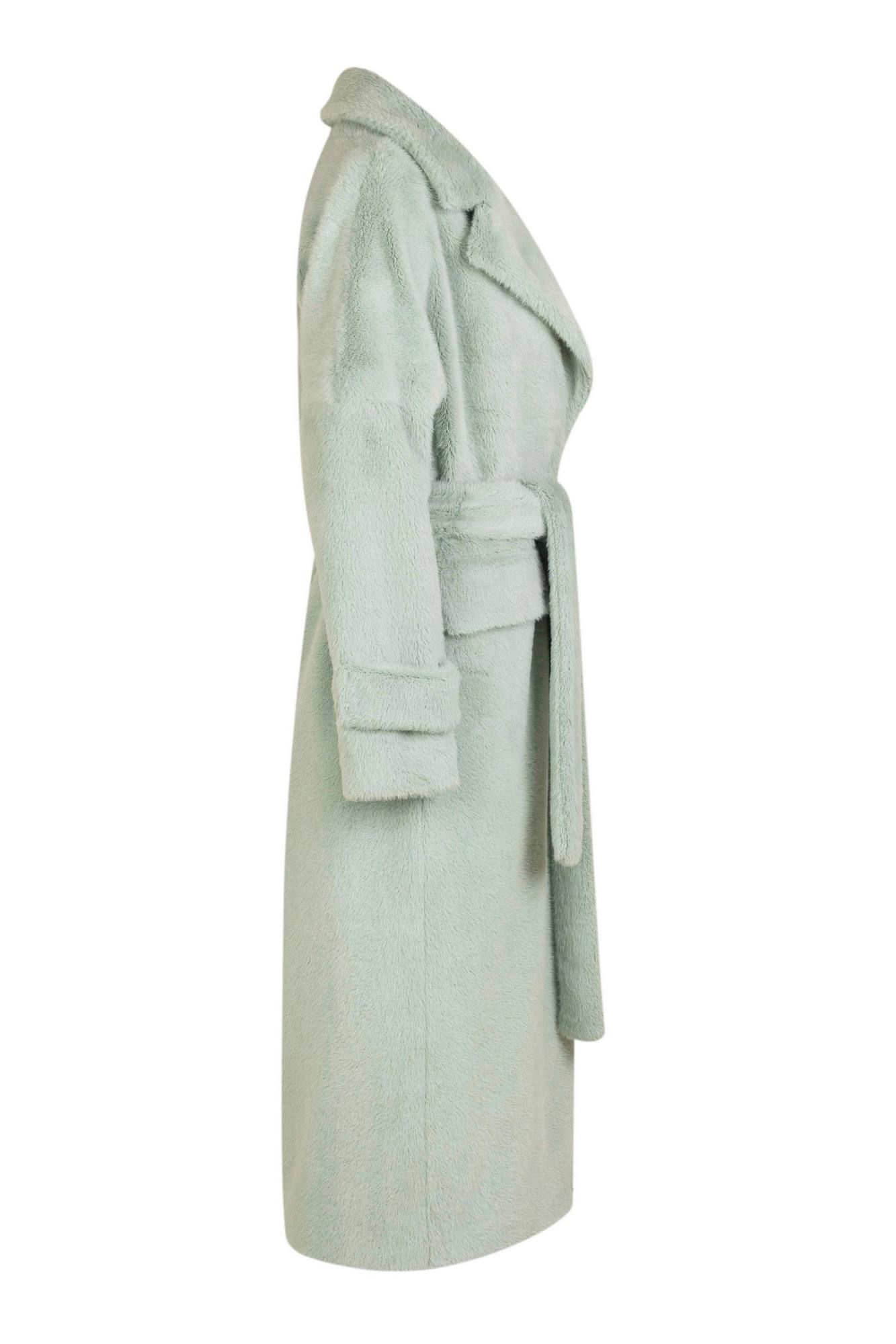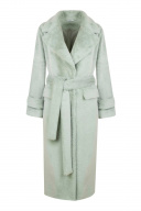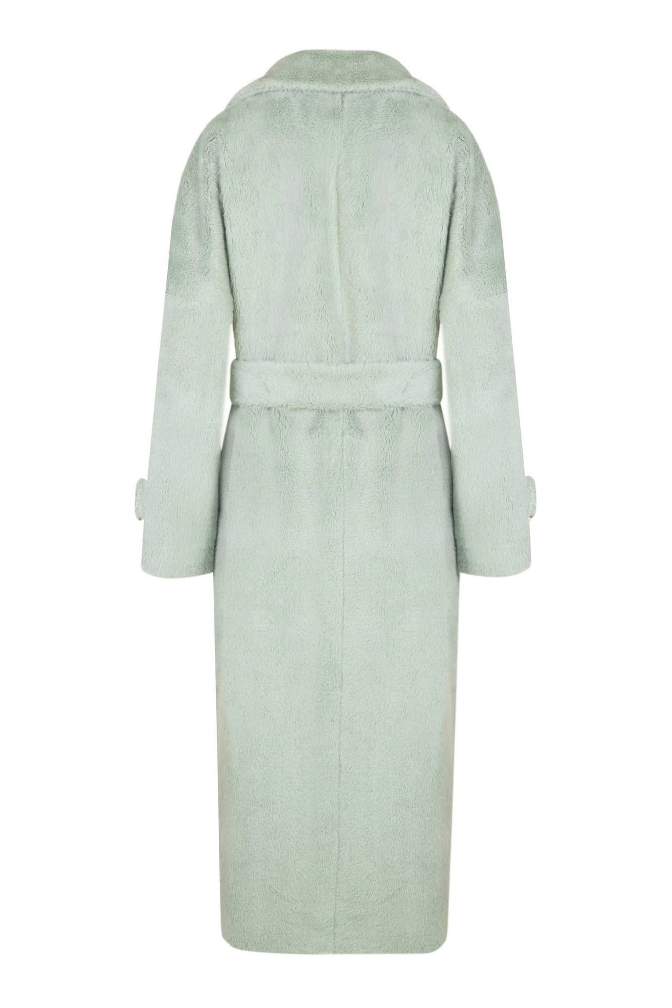 Пальто женское демисезонное, прямого силуэта, однобортное, длиной ниже колена, на подкладке. На переде карманы с клапаном, застежка на пришивные кнопки. Воротник и лацкана отложные. Рукава длинные с патами по низу. В комплекте пояс.