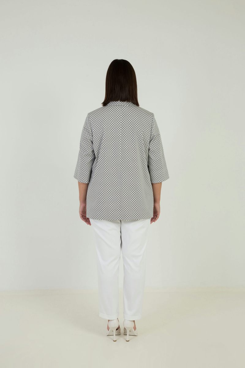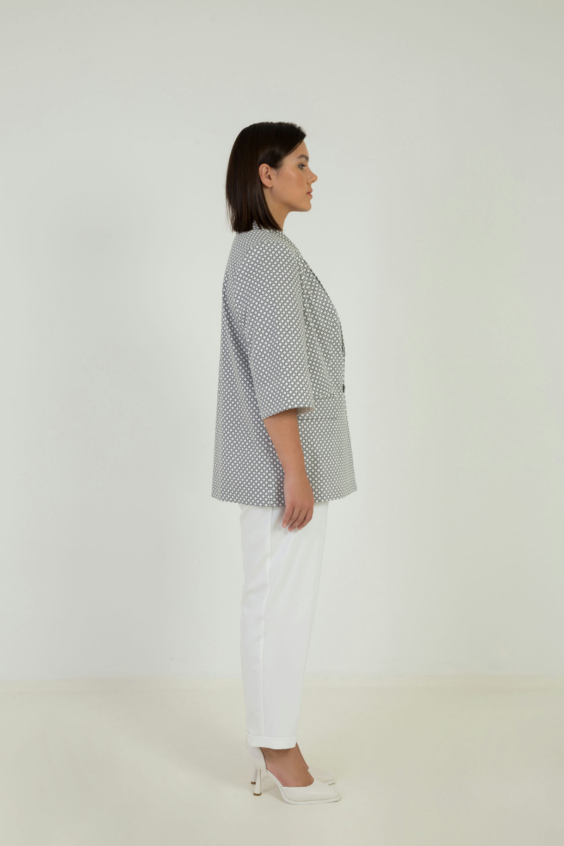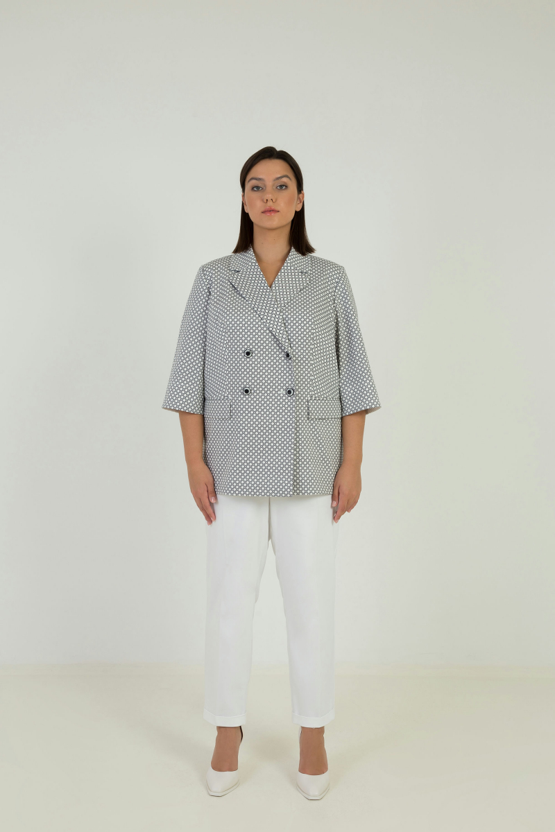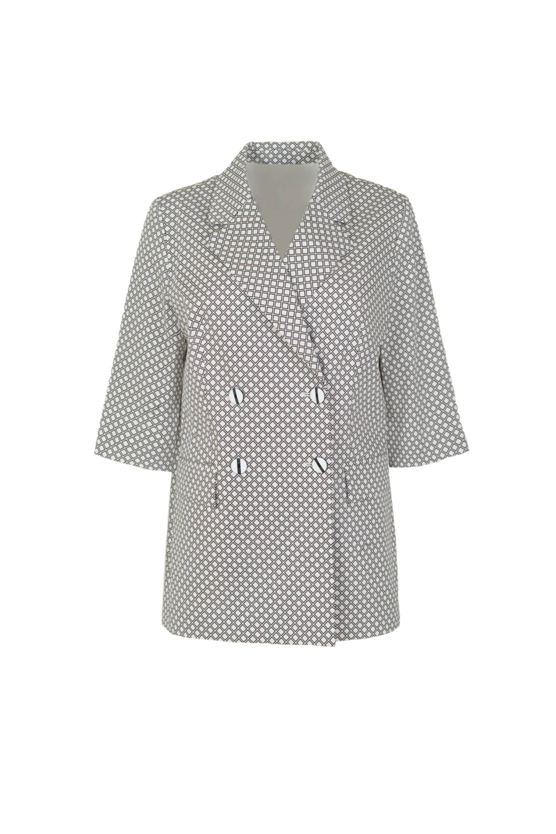 Жакет женский, прямого силуэта, двубортный. Перед с функциональными карманами с клапаном и двумя обтачками. Рукав втачной, одношовный, с отворачивающейся манжетой. Воротник и лацкана отложные. Жакет на подкладке.
