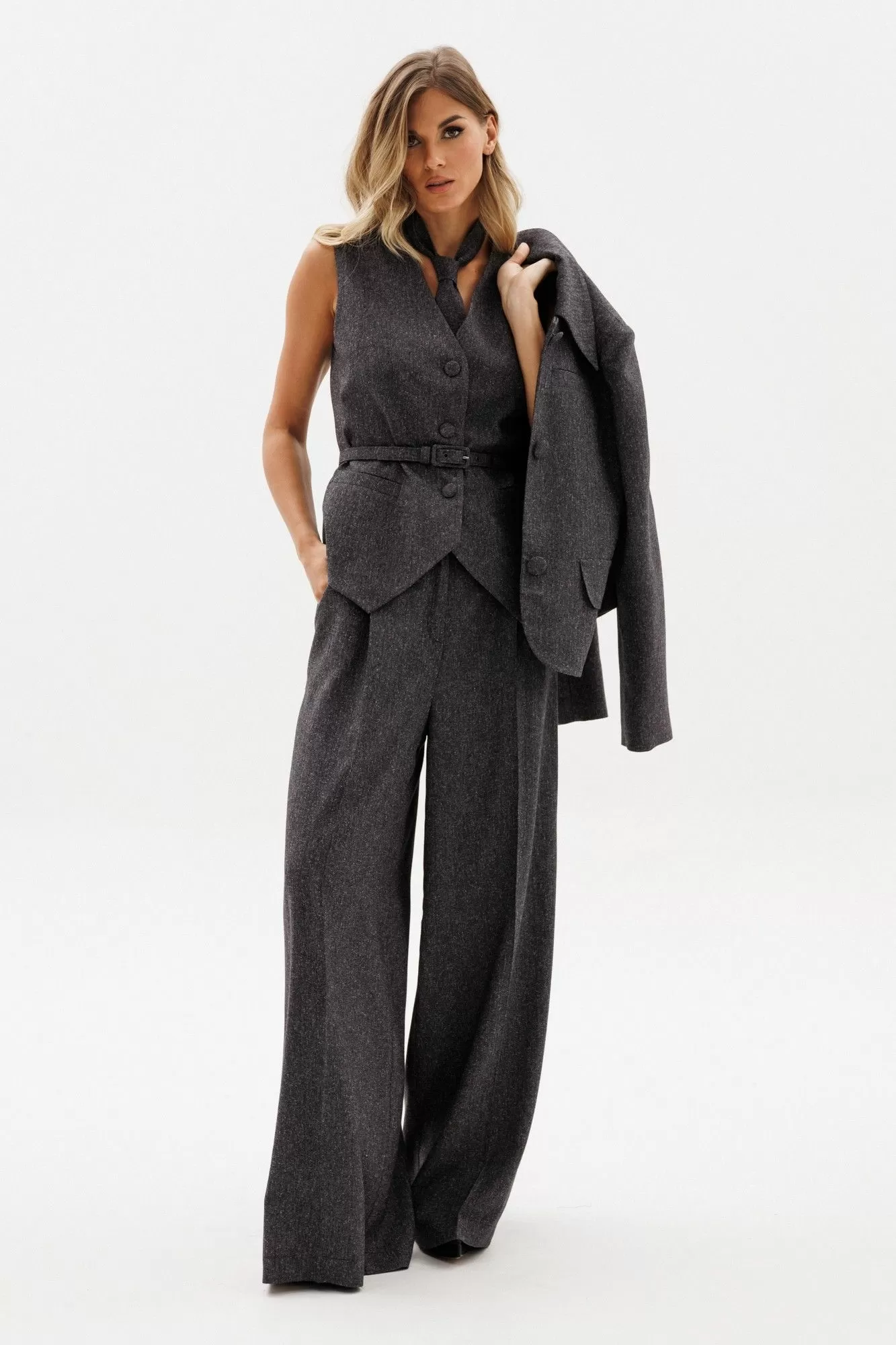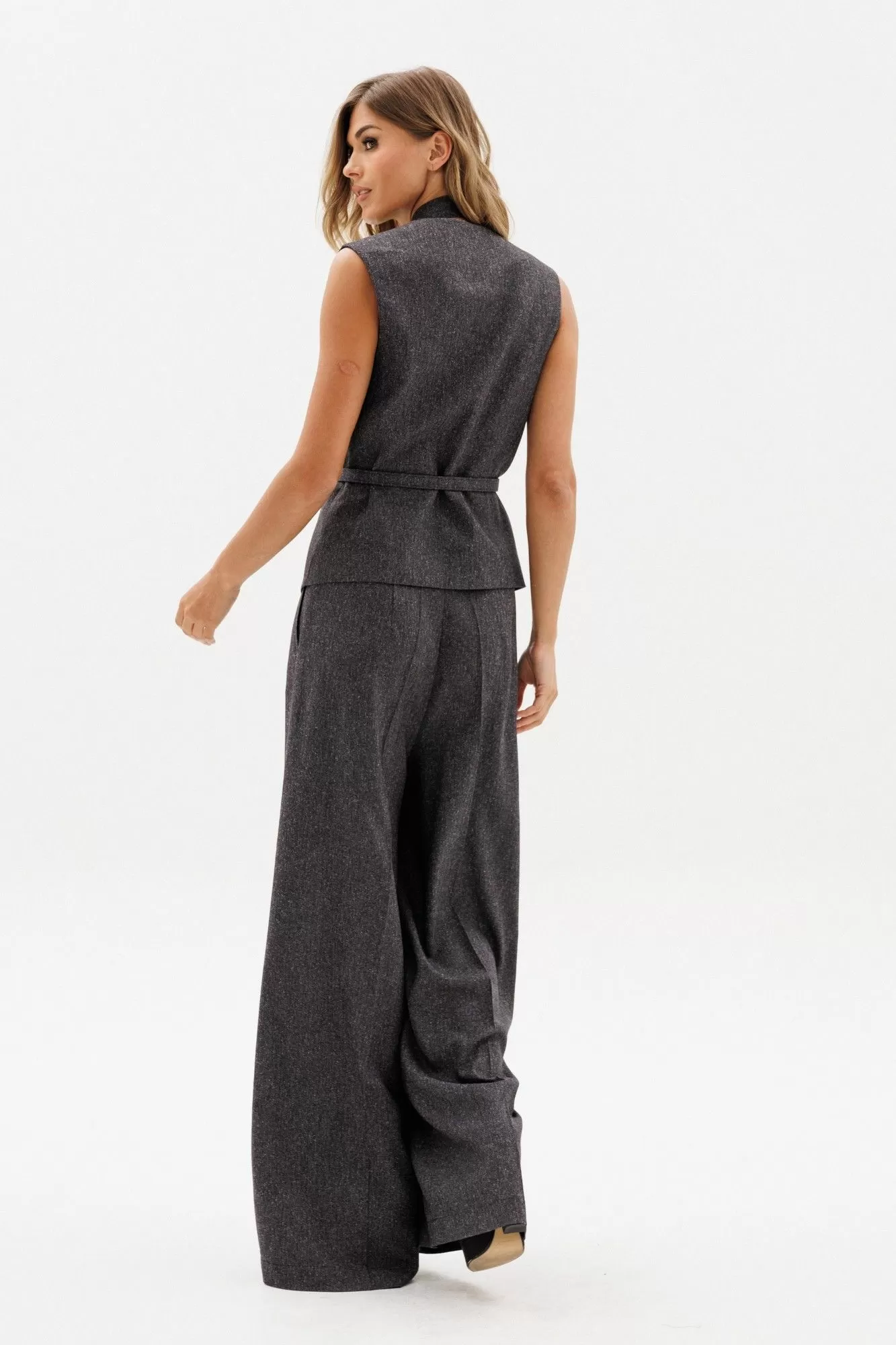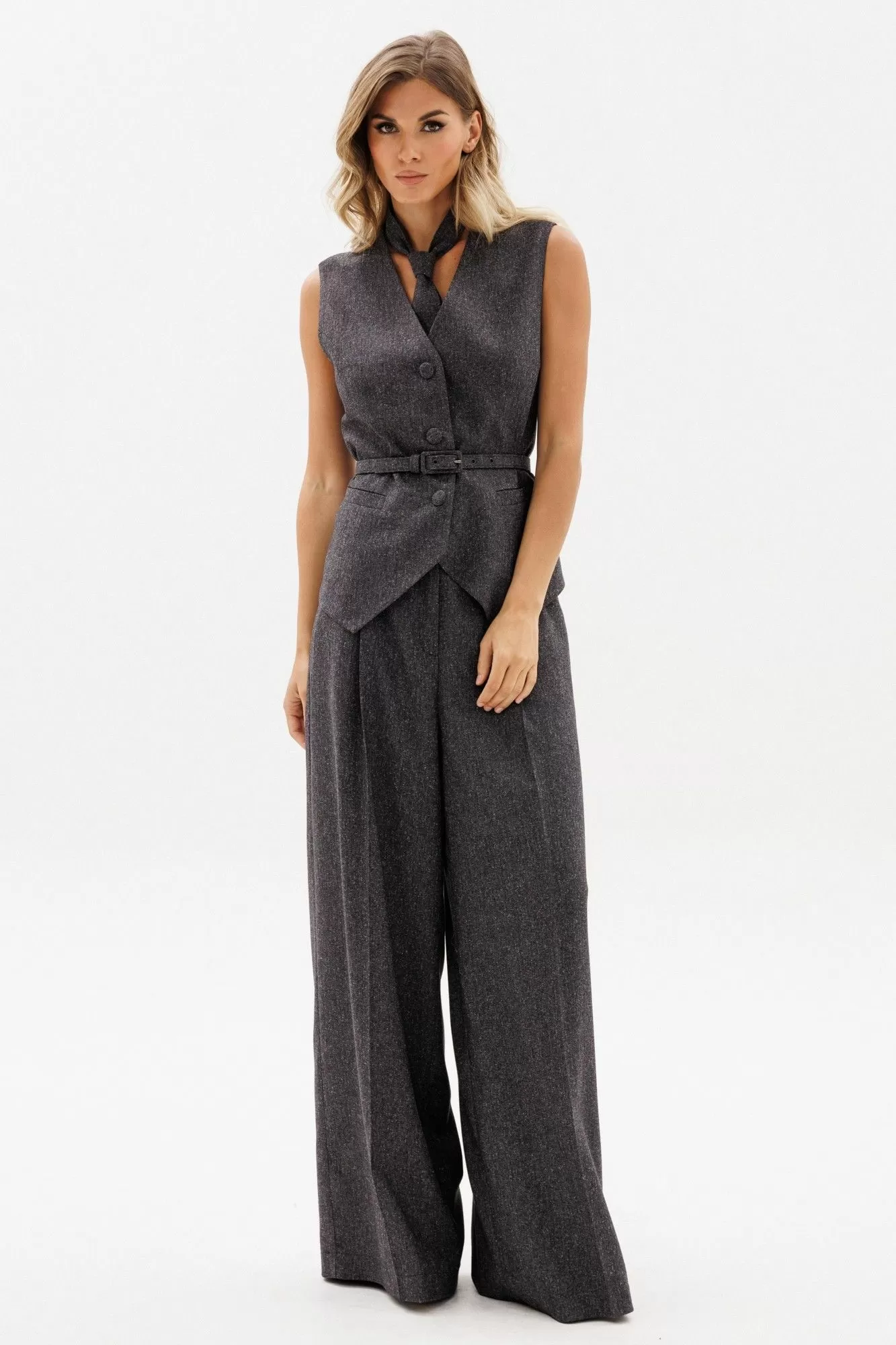 Жилет выполнен из костюмной ткани меланж. Жилет полуприлегающего силуэта, длиной до линии бедер. Низ жилета фигурной формы. Спереди декоративные карманы и центральная застежка на пуговицы. Горловина переда V-образной формы. Жилет на притачной по низу подкладке. В комплект входит ремень из основной ткани с обтяжной пряжкой.
