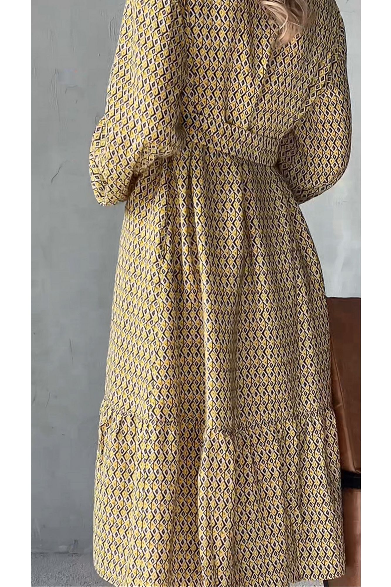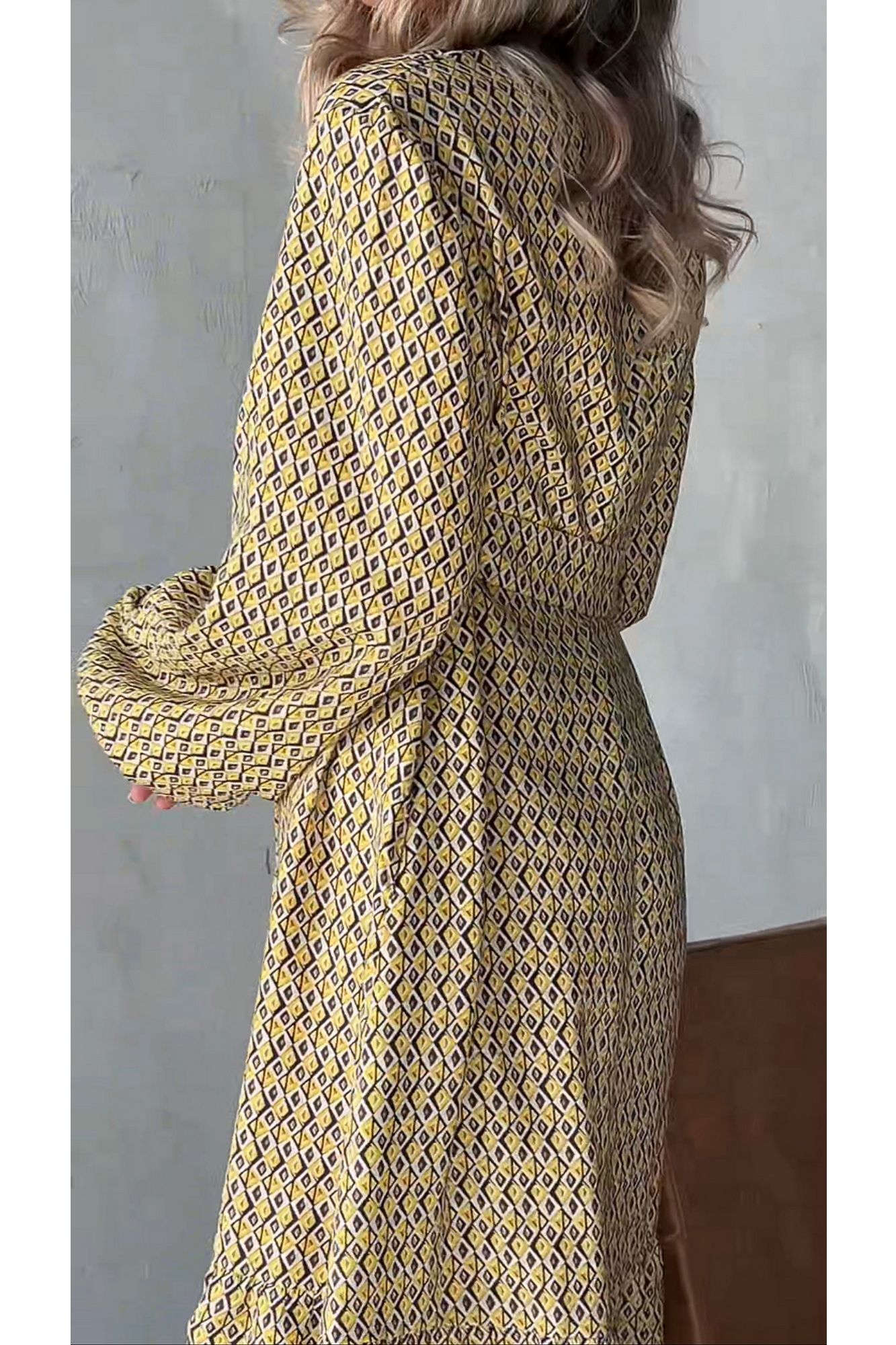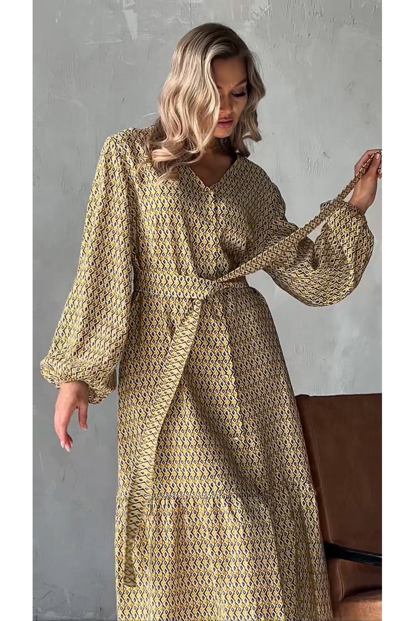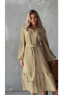 "Платье-рубашка с застежкой впереди на петли и пуговицы. Вырез платья V-образный, по низу оборка, рукава рубашечные, широкие с манжетой на резинку. Платье со съемным поясом. "