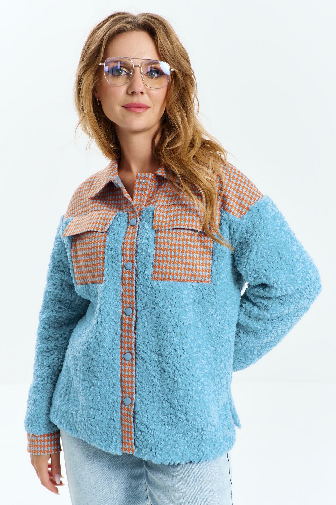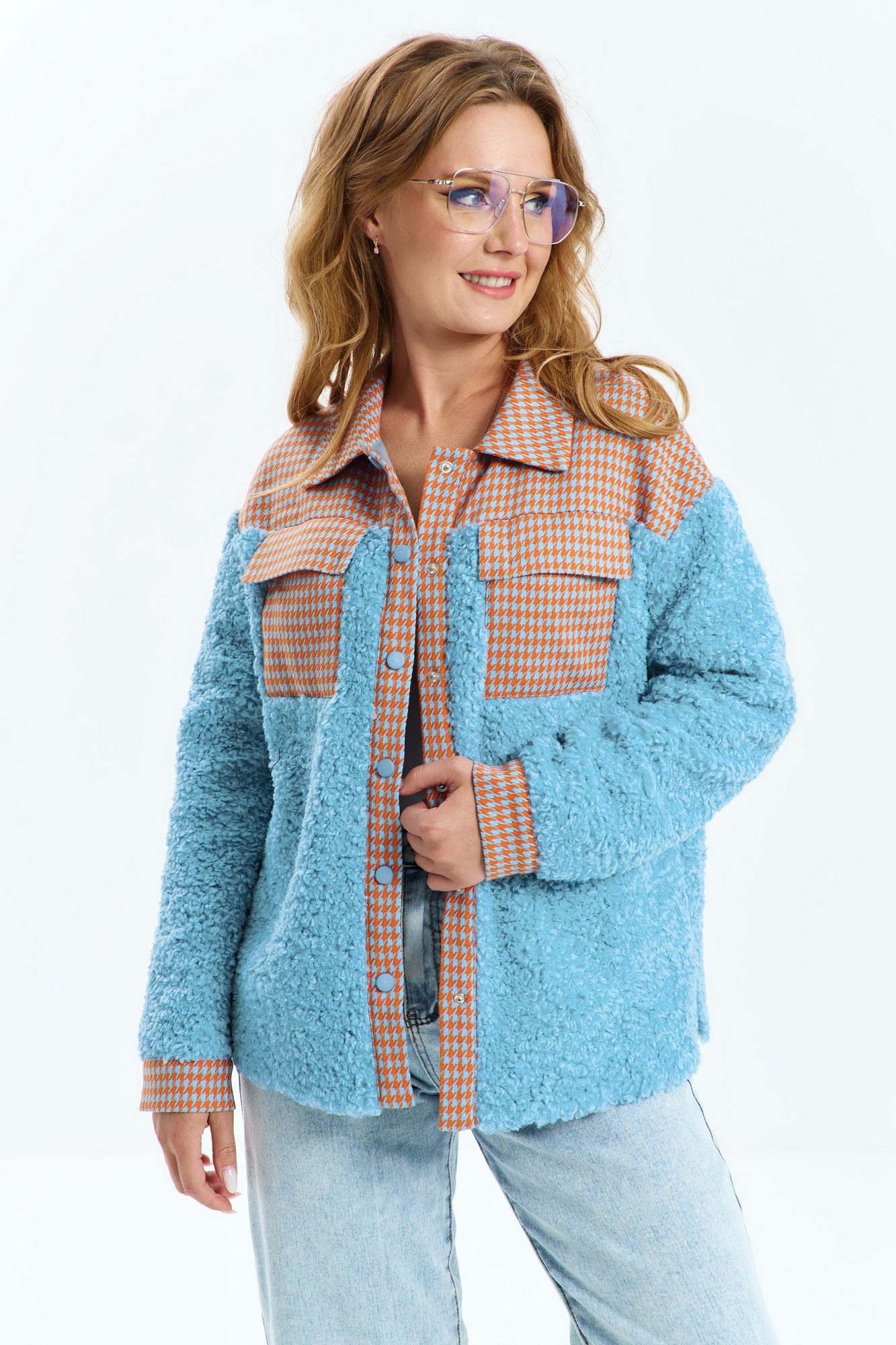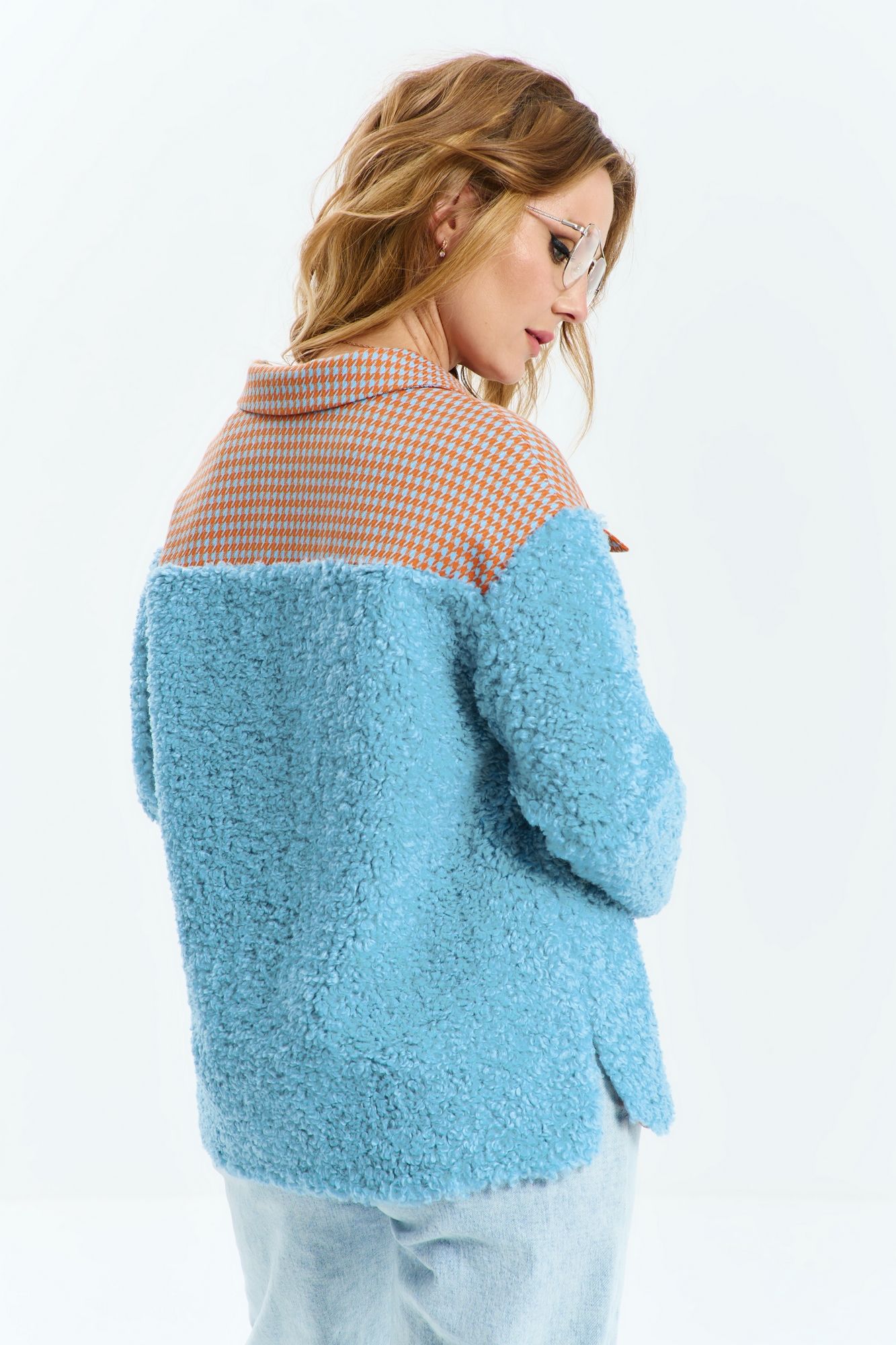 Жакет женский выполнен в сочетании костюмной ткани и искусственного меха, изделие свободного кроя . На полочке и спинке изделия расположена контрастная кокетка, рукав втачной длинный с манжетой по низу, горловина- отложной воротник на стойке. Застежка петли-пуговицы на планке. низ - фигурный.