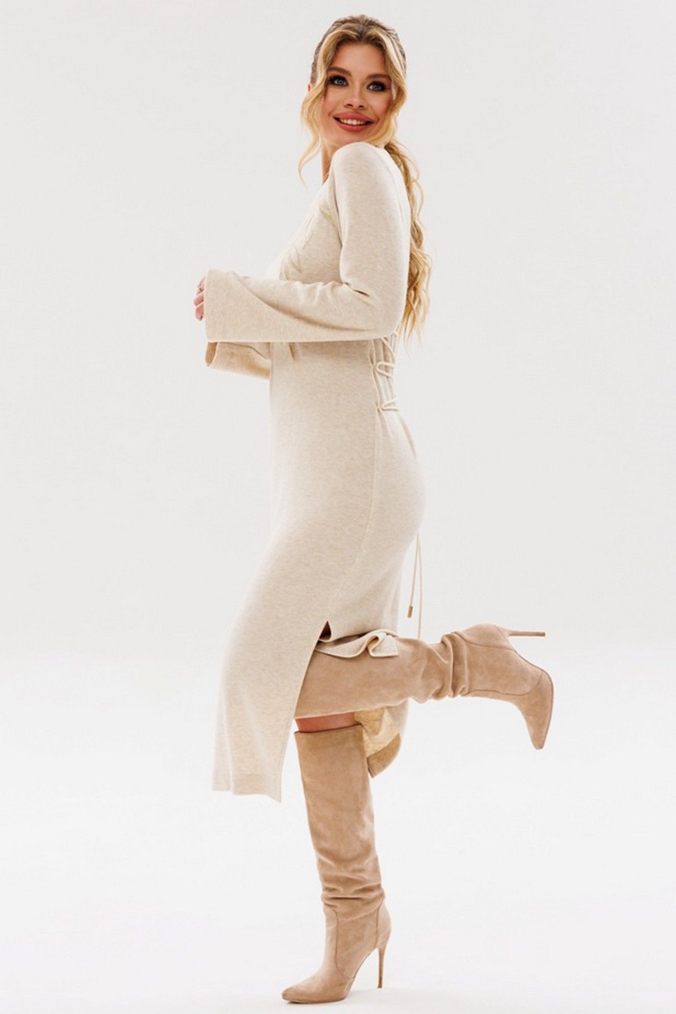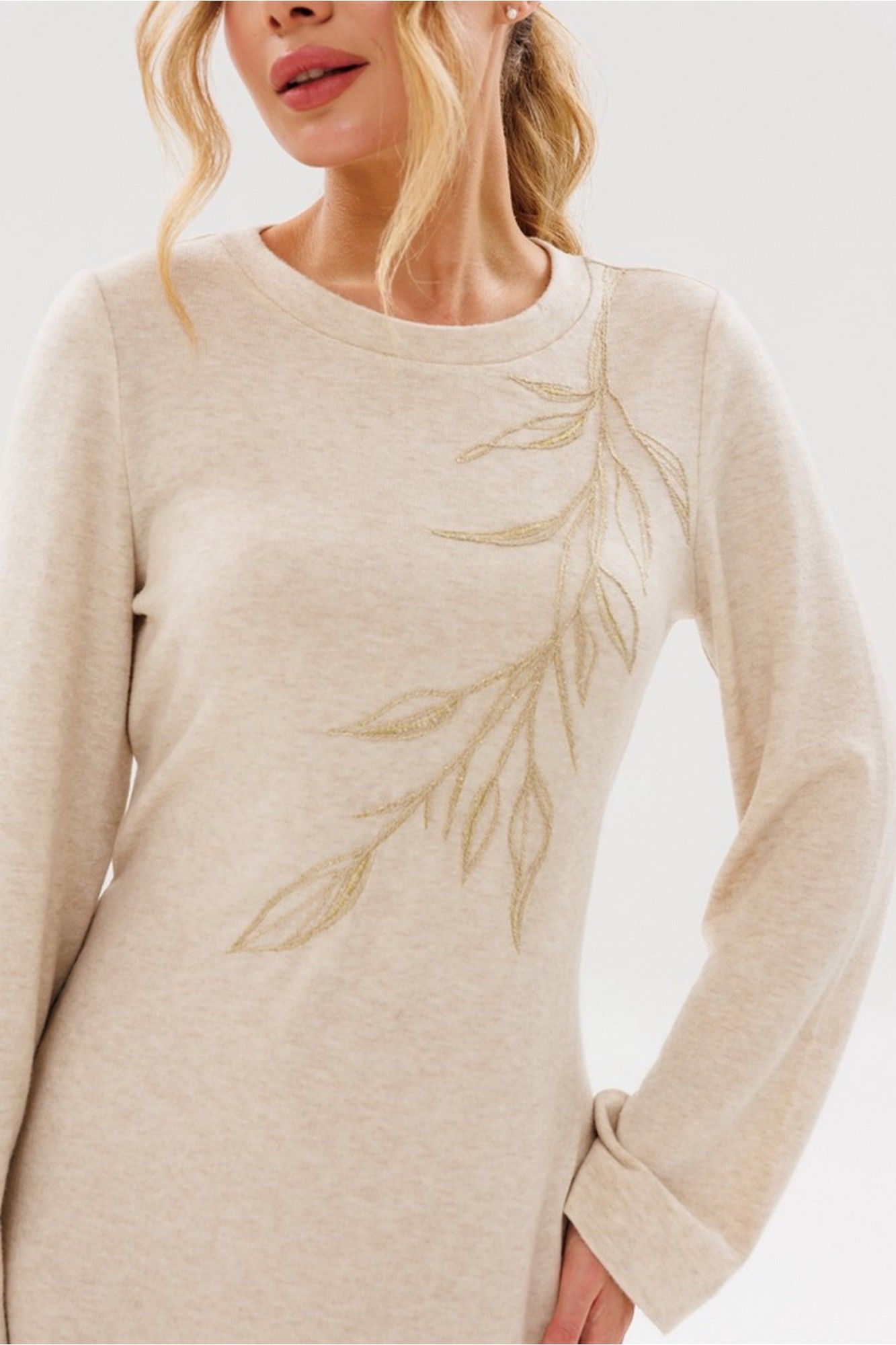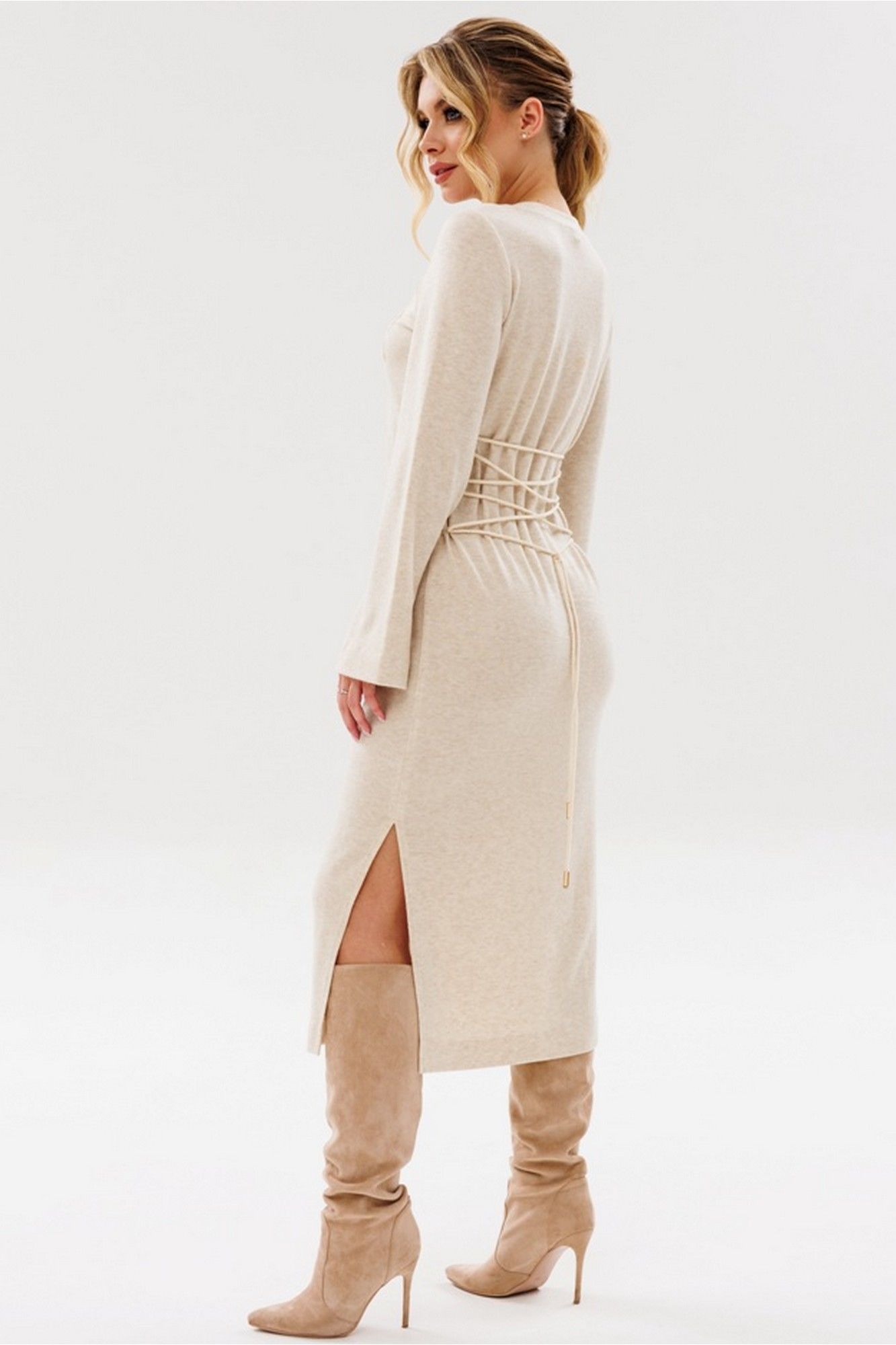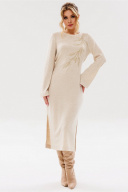 Силуэт: прилегающий. Вырез горловины: округлый. Длина изделия: по спинке - 116см. Длина рукава: 59см, рукав втачной. Спинка платья с пришивными петлями в боковых швах и регулируемой шнуровкой.По низу платья- разрезы. Декоративные элементы: декоративная вышивка золотистой нитью по полочке платья.