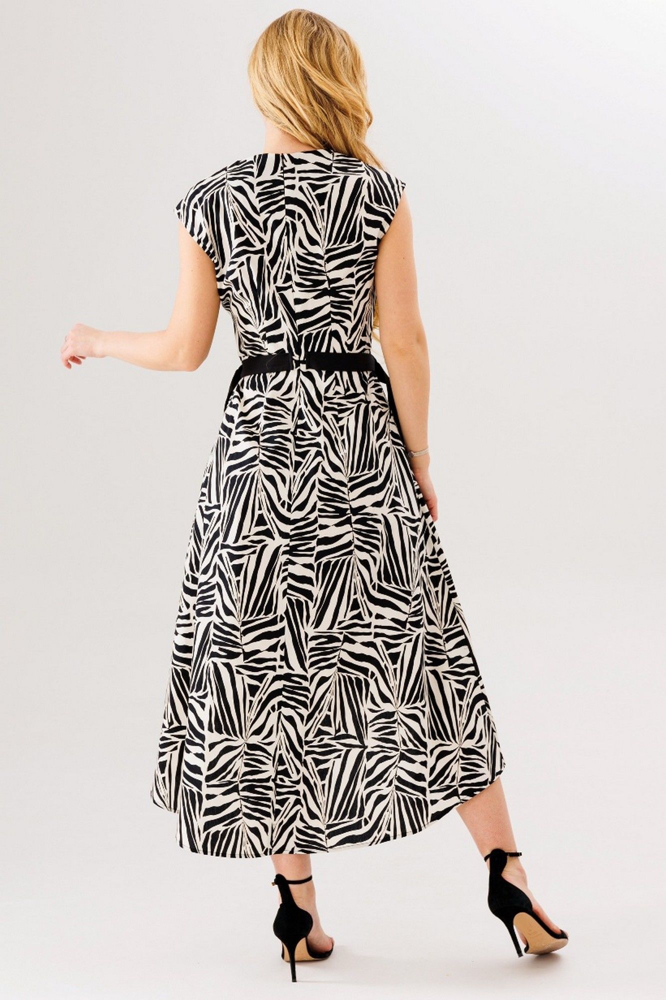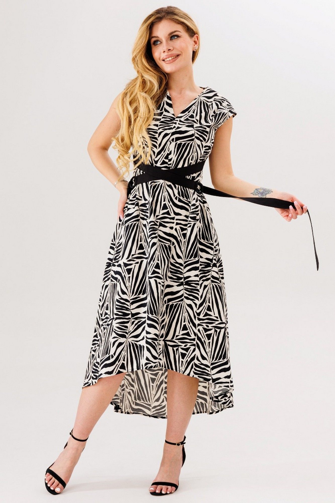 Вырез горловины: V-образный Длина изделия: по спинке - 125см Дополнительное описание: платье с карманами в боковых швах и пришивным поясом. Низ асимметричный. В среднем шве спинки -застежка-молния.