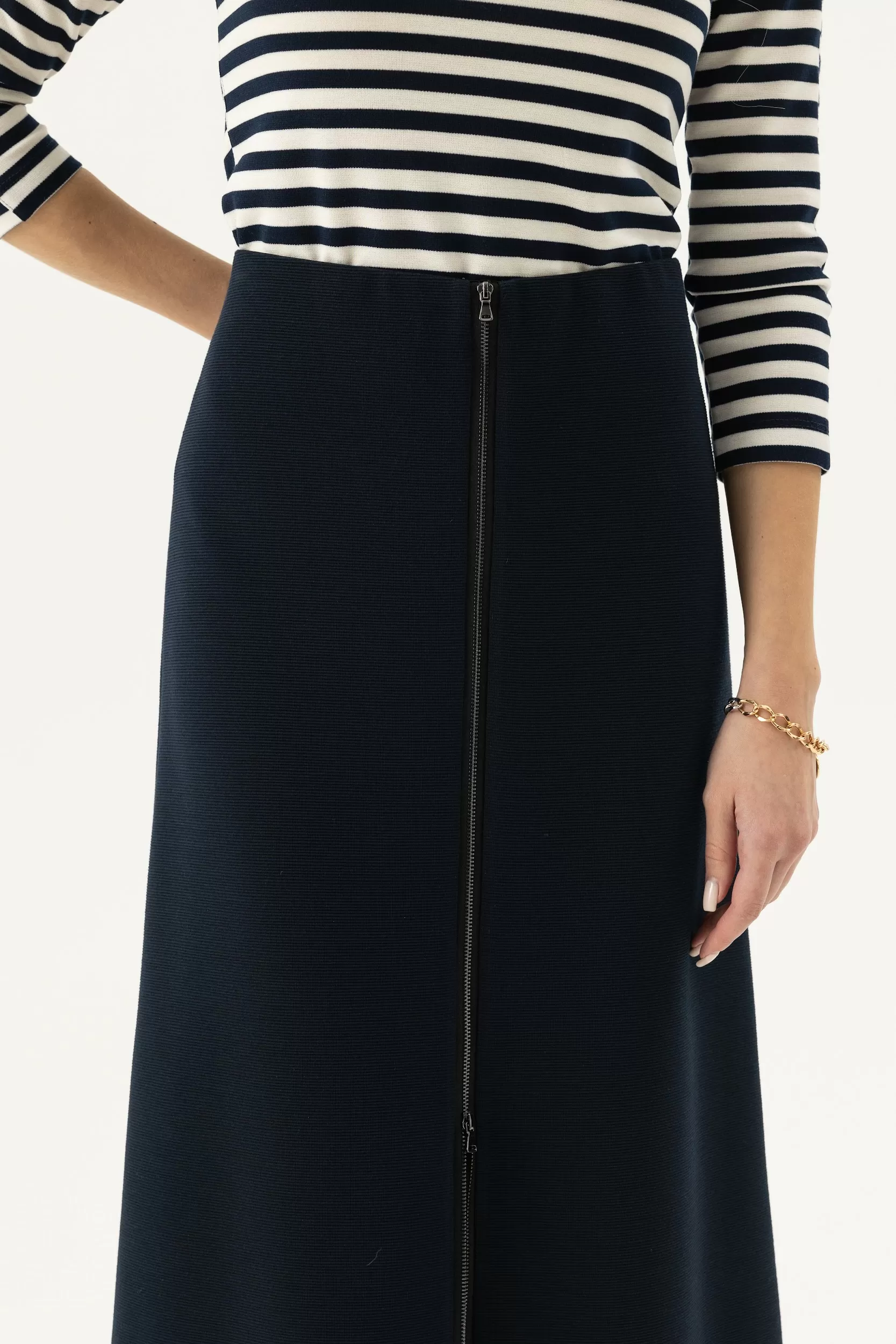 Стильная юбка миди на молнии расширенная книзу. Пояс у модели, обработан эластичной тесьмой 5 см с изнаночной стороны.Талиевые вытачки обеспечивают идеальную посадку по бёдрам и талии, а высокий вырез подчеркнет Вашу привлекательность.Черная юбка трапеция сочетается с любым верхом. Попробуйте комбинировать ее с джемпером из нашей коллекции в морcком стиле 30763.1.54F.