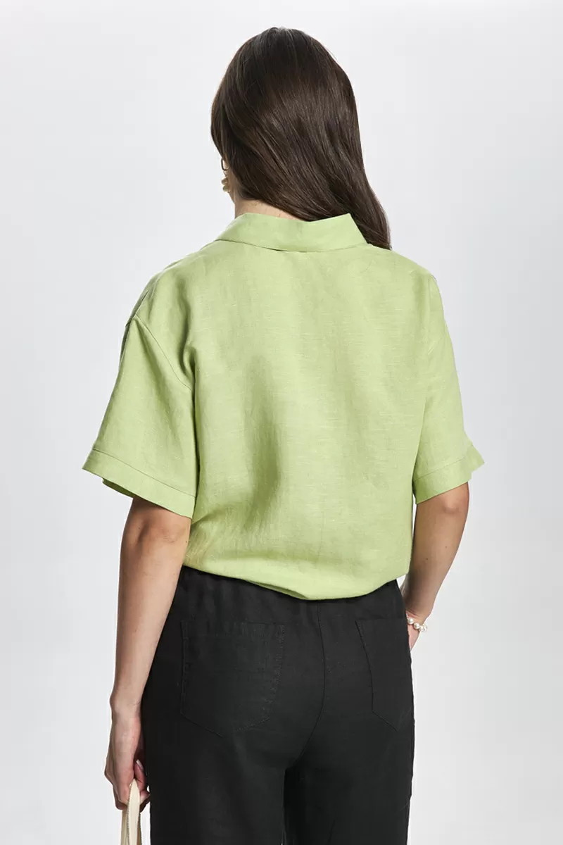 Элеганстная блузка с фигурным низом, переходящим в завязывающие пояса по переду, длиной выше уровня бедер. Вискозно-льняная ткань рубашки приятна к телу, цвета спелого авокадо, придаст изюминку Вашему образу. У модели прямой рубашечный рукав, длиной до локтя.Стильная блузка легко впишется в Ваш повседневный, деловой и вечерний стиль.