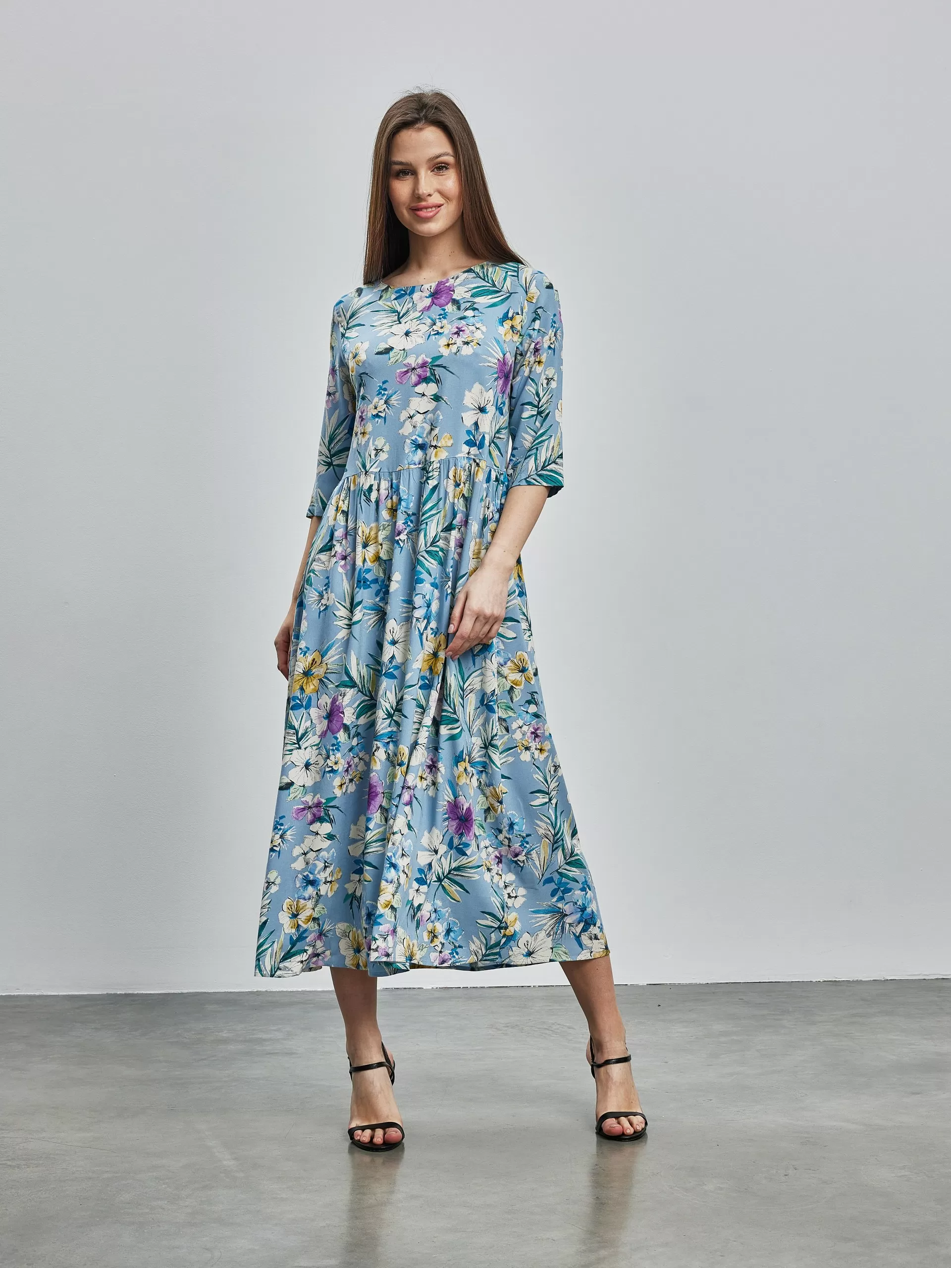 Силуэт платья свободный. Выше линии талии фигурный подрез, юбка присобрана по кругу. Спущенный рукав ниже локтя. Платье без подкладки. Платье выполнено из 100% рэвона (улучшенной вискозы) с сочным цветочным принтом.