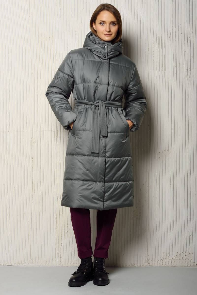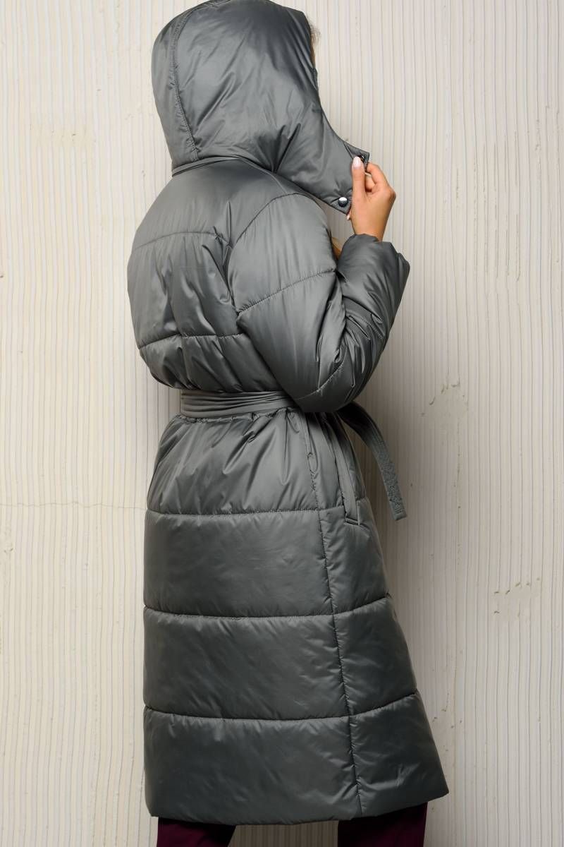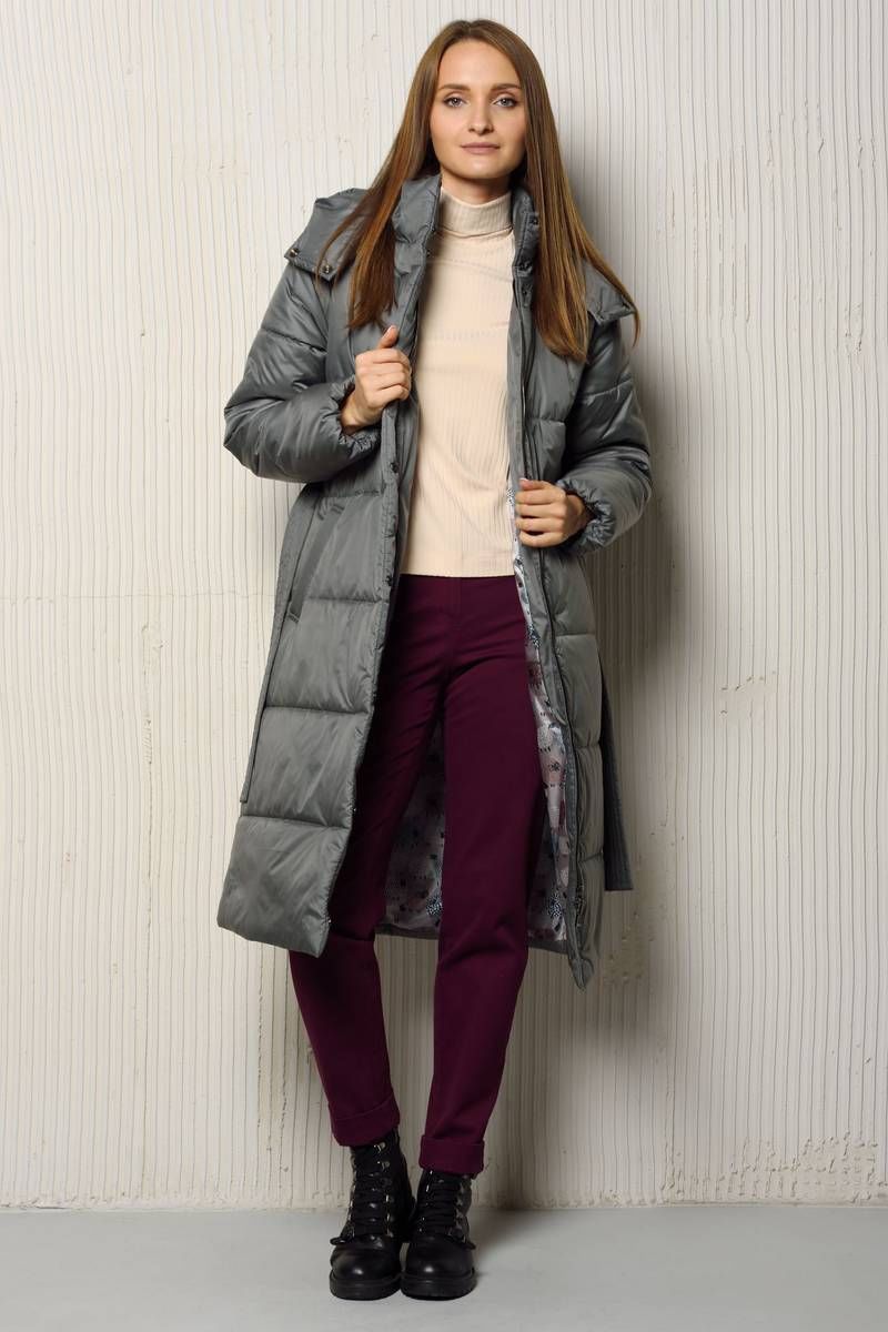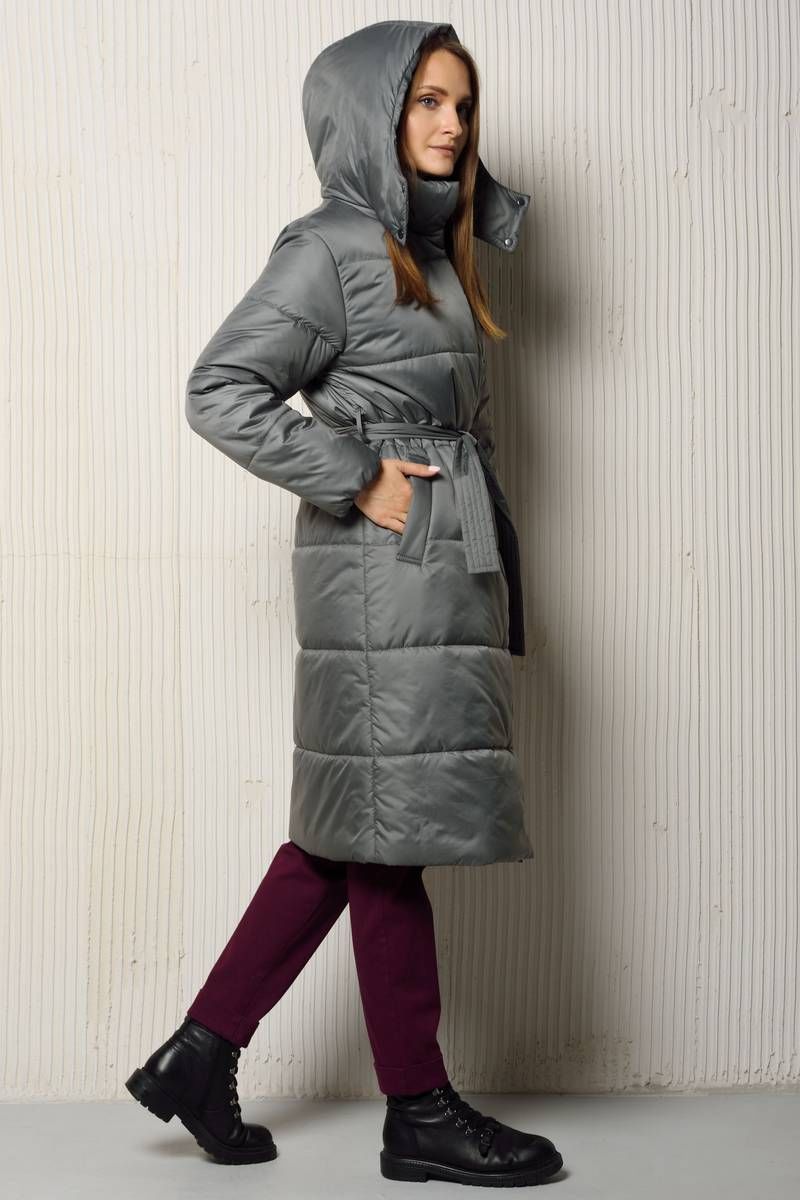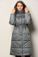 Женское пальто со съемным капюшоном свободного силуэта на утеплителе изософт плотностью 150 гр./м.кв. (умеренно морозная зима от 5° до -15° ) длиной ниже уровня колена.. Застегивается пальто на тесьму-молнию и потайные кнопки. Спереди имеются два кармана с листочкой шириной 4,5 см. Воротник в виде стойки. Теплое пальто на подкладке дополнено съемным поясом шириной 4,5-5 см.