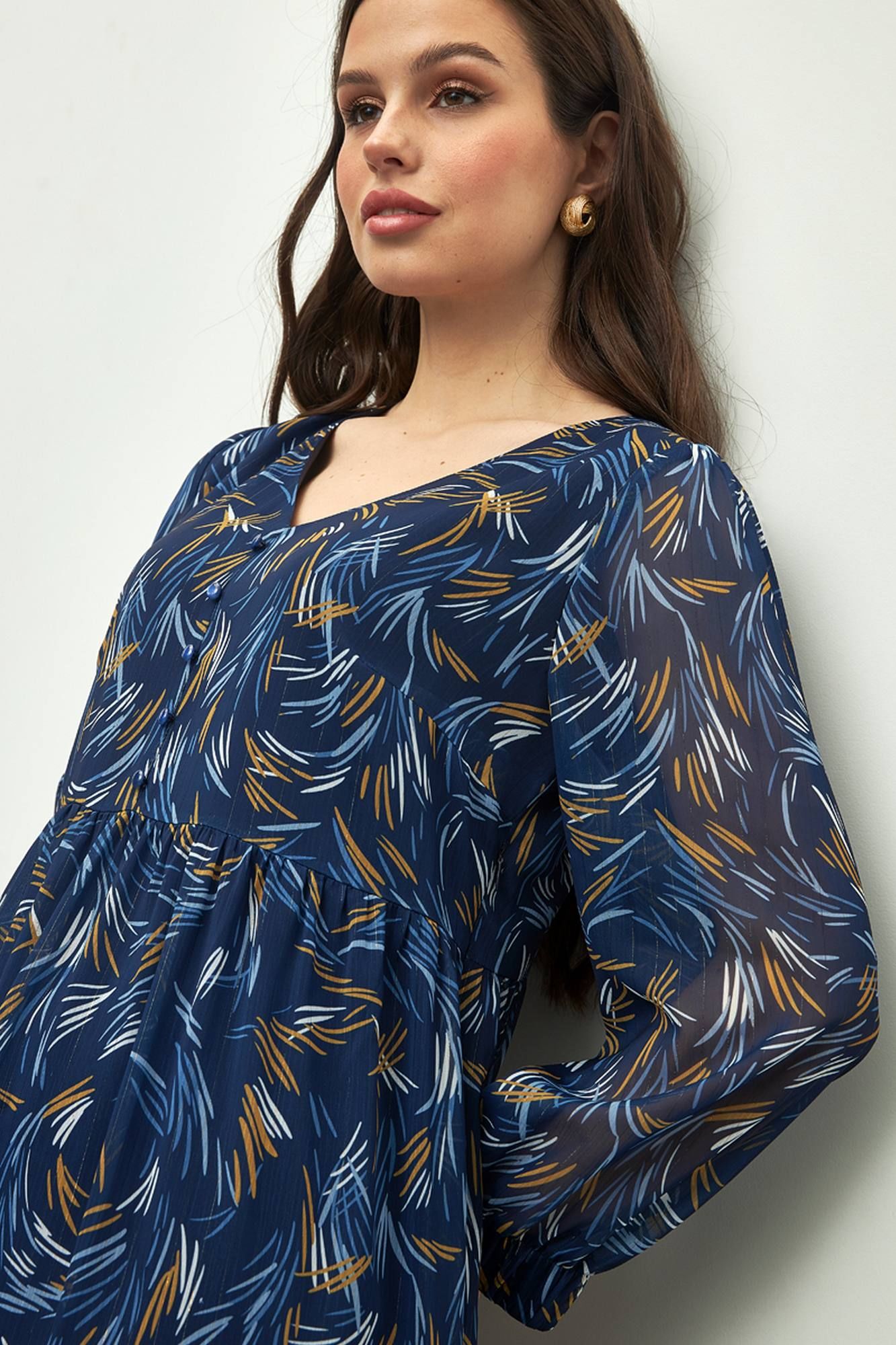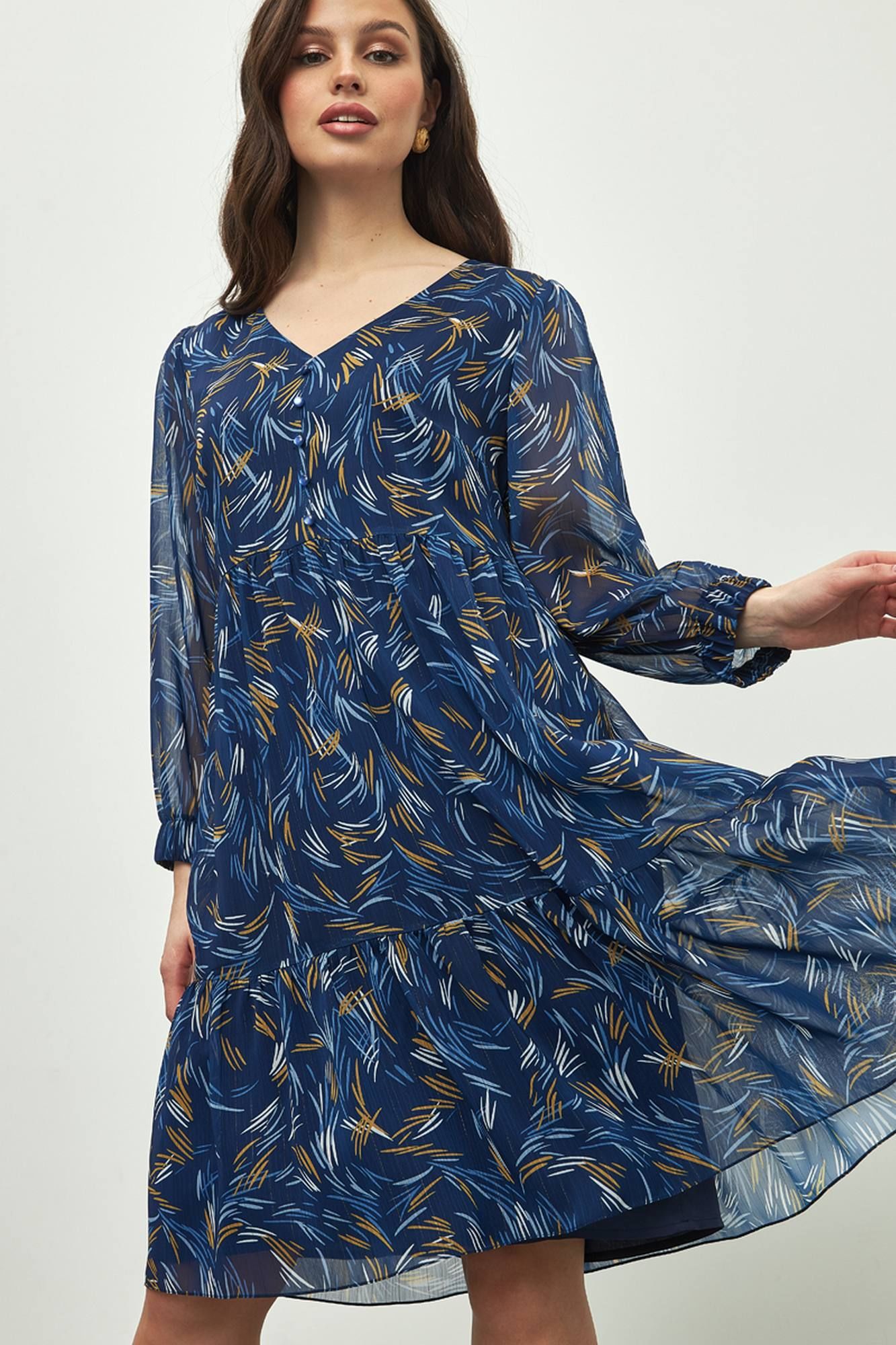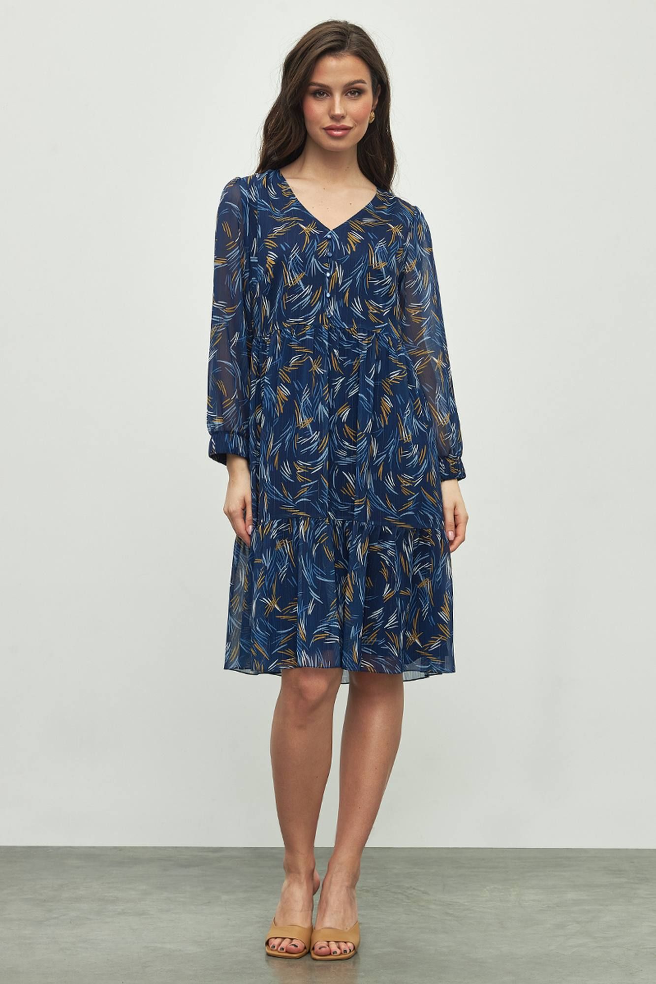 Шифоновое платье на подкладке приталенного кроя, подчеркивающее женственность - отличное решение на каждый день для современной стильной женщины. Такую элегантную модную вещь из струящейся ткани с расклешенной, в меру пышной юбкой можно также надеть на любой праздник: корпоратив, вечеринку по случаю юбилея, свадьбу или на выпускной. Пояс в виде сборки выделит тонкую талию и украсит любую фигуру.Объемные рукава-фонарики длиной 7/8 и меют сборку по низу на резинку 4 см. У платья красивый V- образный вырез горловины дополненный декором в виде пуговиц.Одежда из летящего шифона в таком стиле подходит для летних и осенних прогулок, офисной работы или вечеринки.