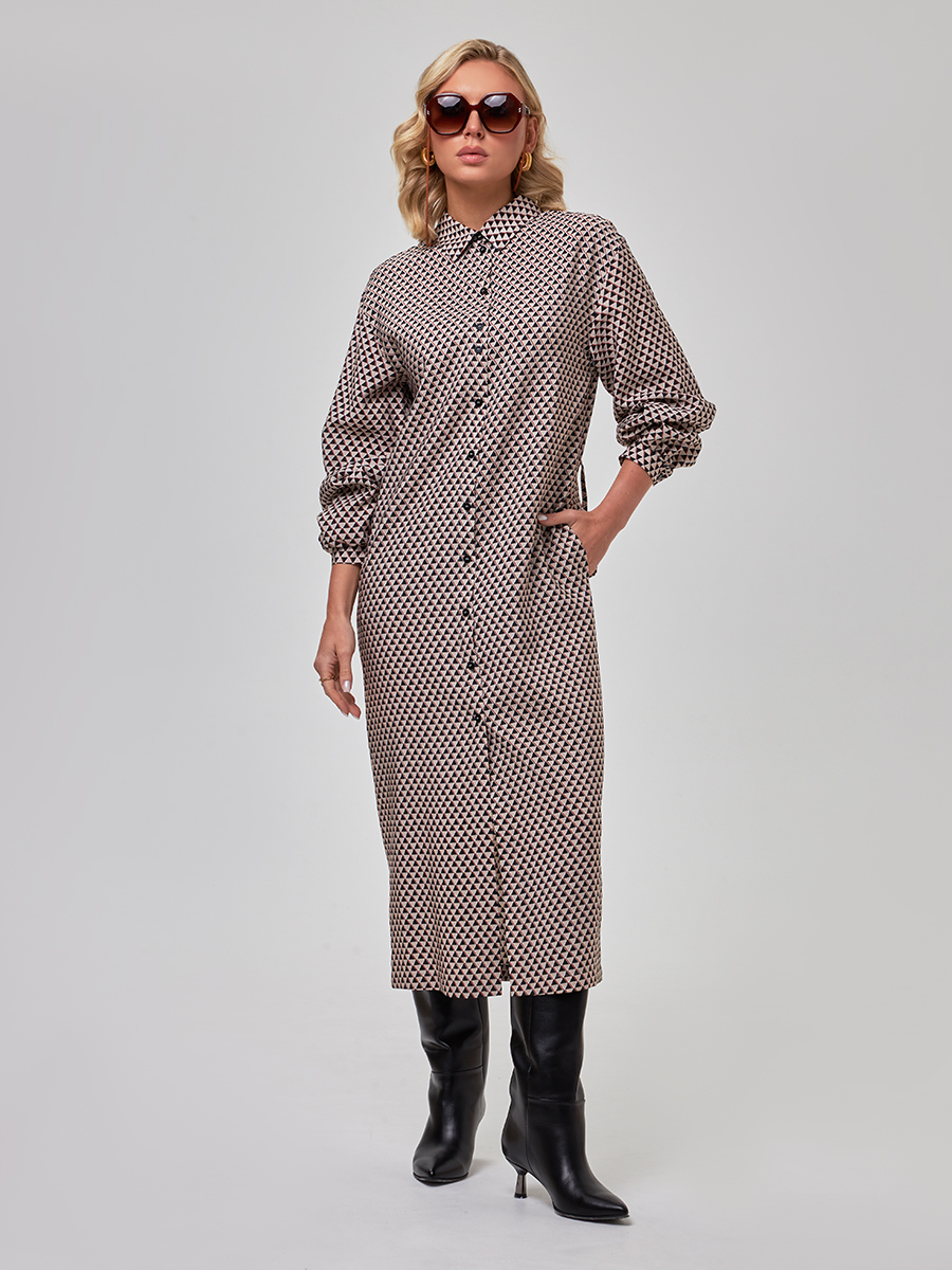 Женское платье-рубашка расширенного книзу силуэта длиной до середины икры. Универсальное, женское платье идеально подойдет как: на работу, в офис или для повседневной носки. Застегивается платье на пуговицы, а сзади имеется кулиса со шнурком. Воротник рубашечного типа. Рукава длинные со спущенным присобраны на резинку шириной 3 см. Данная модель платья обязательно должна быть в гардеробе девушки, предпочитающей стиль, удобство и женственность в любое время года.