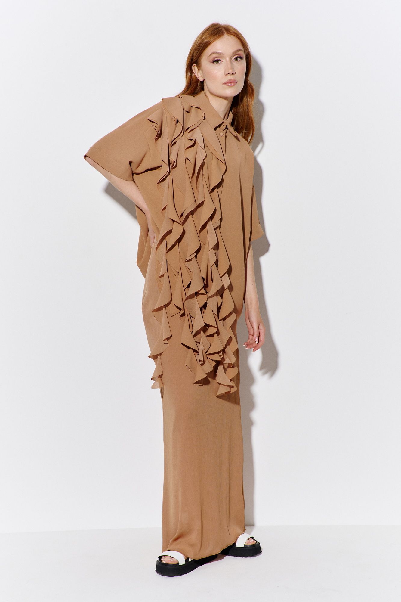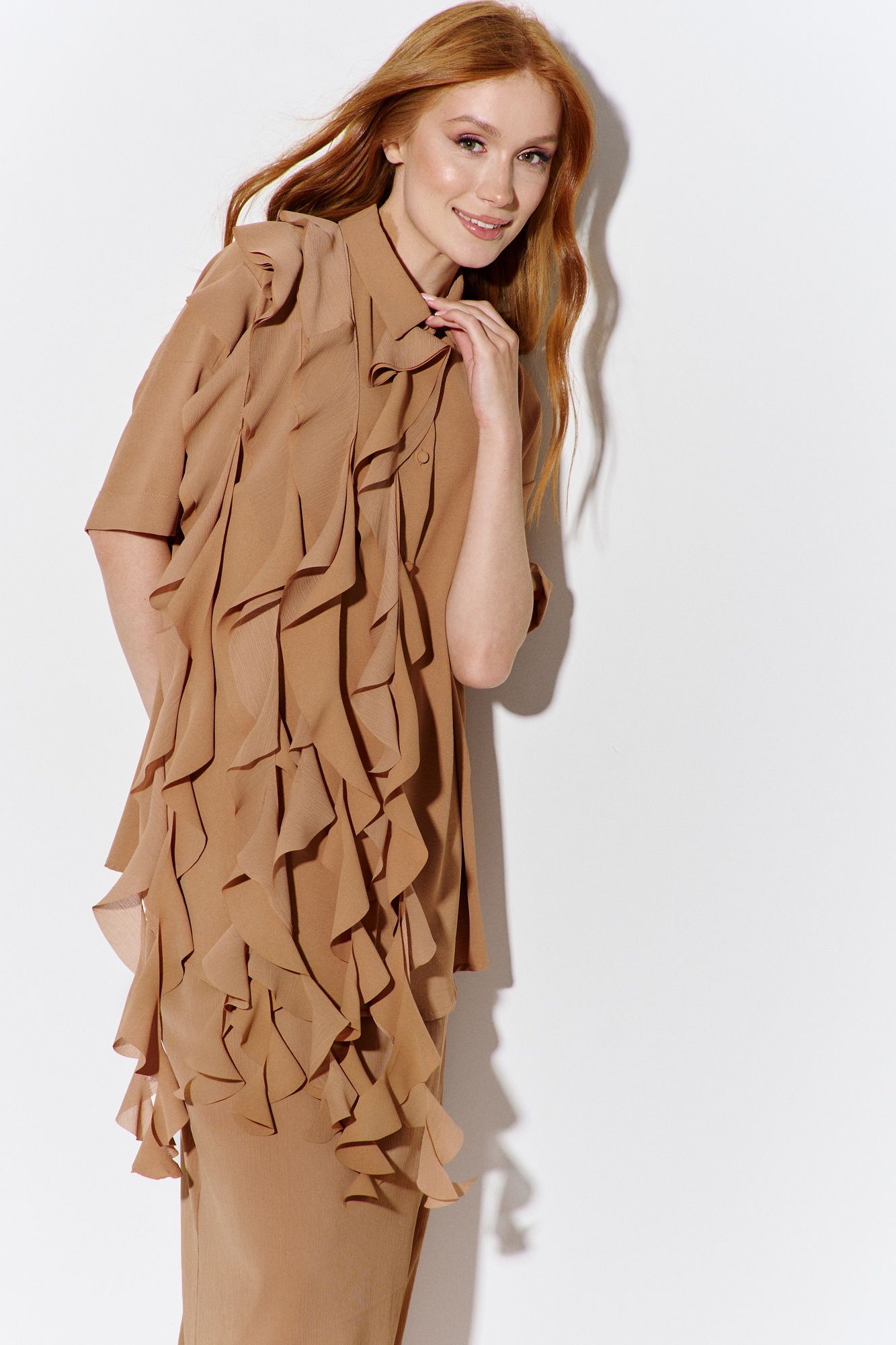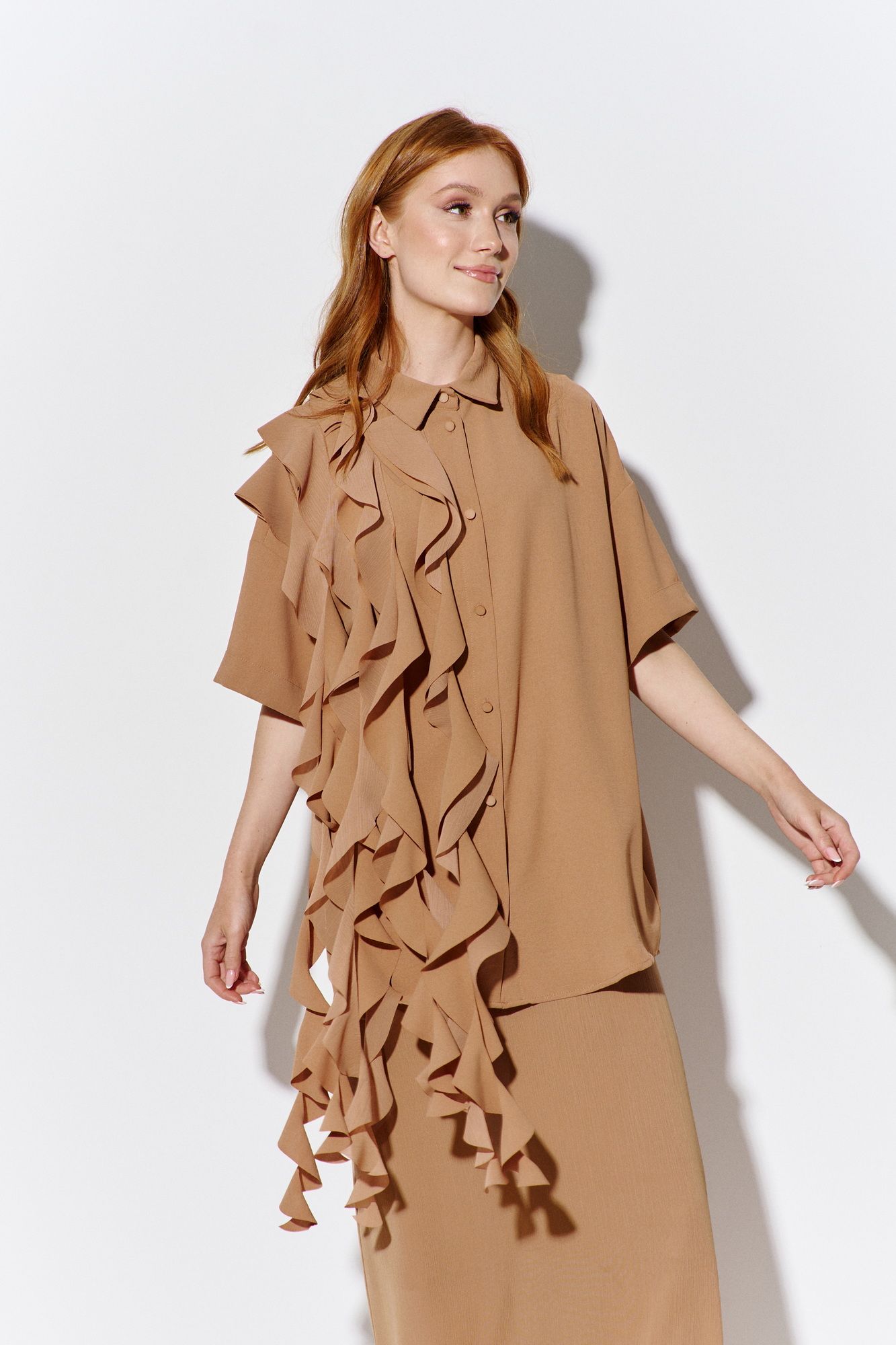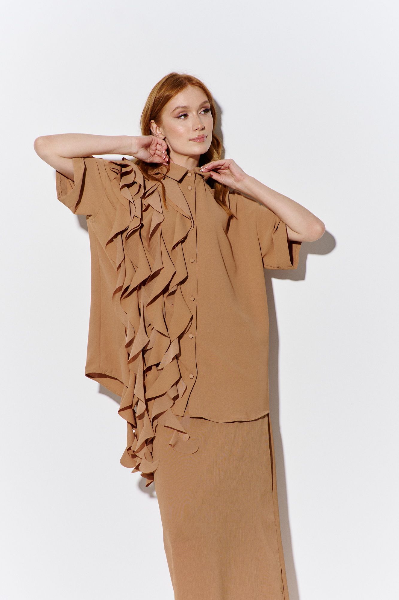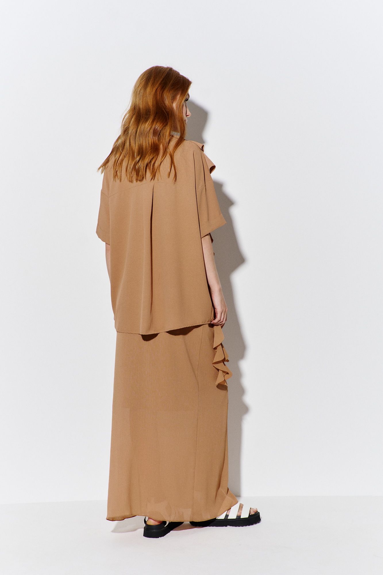 Комплект: рубашка и юбка. Рубашка свободного силуэта, выполнена из рубашечной ткани в карамельном цвете, центральная застежка на петли и пуговицы, по полочкам декоративный элемент ввиде воланов, по спинке отрезная кокетка и складка. Длина рубашки по переду 76 см, длина рукава 17 см. Юбка прямого силуэта в длине макси, выполнена из шифона-крэш в карамельном цвете, юбка на подкладке, пояс обработан эластичной тесьмой (резинкой). Длина юбки по боковому шву 100 см.