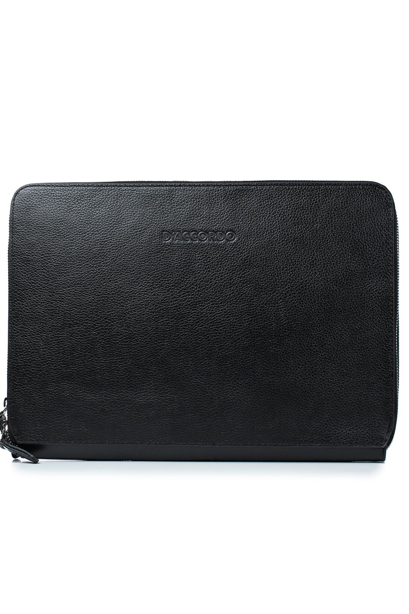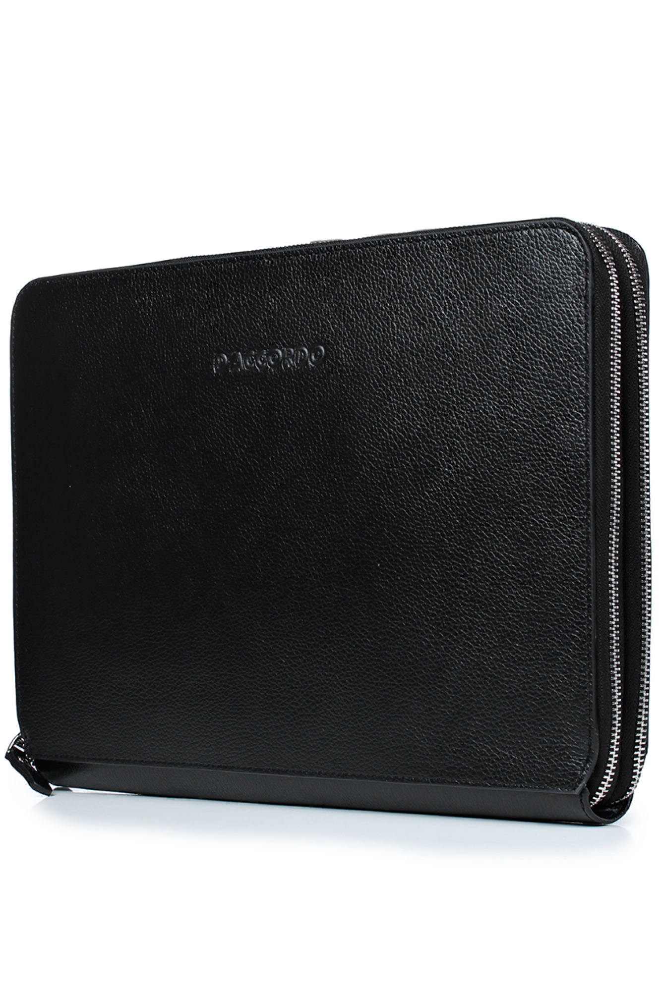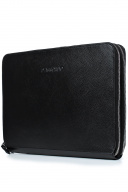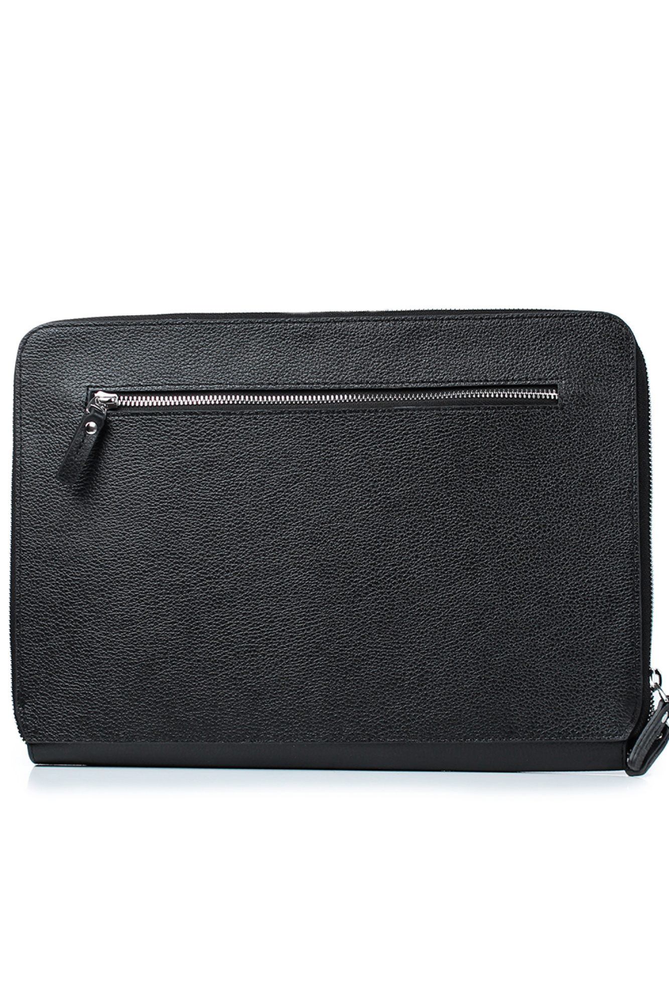 Папка на два отделения, закрывающиеся на застежку-молнию, на задней стенке карман, закрывающийся на застежку-молнию, с тиснением на передней стенке, с поводками на движках. Размеры: 330x235x40