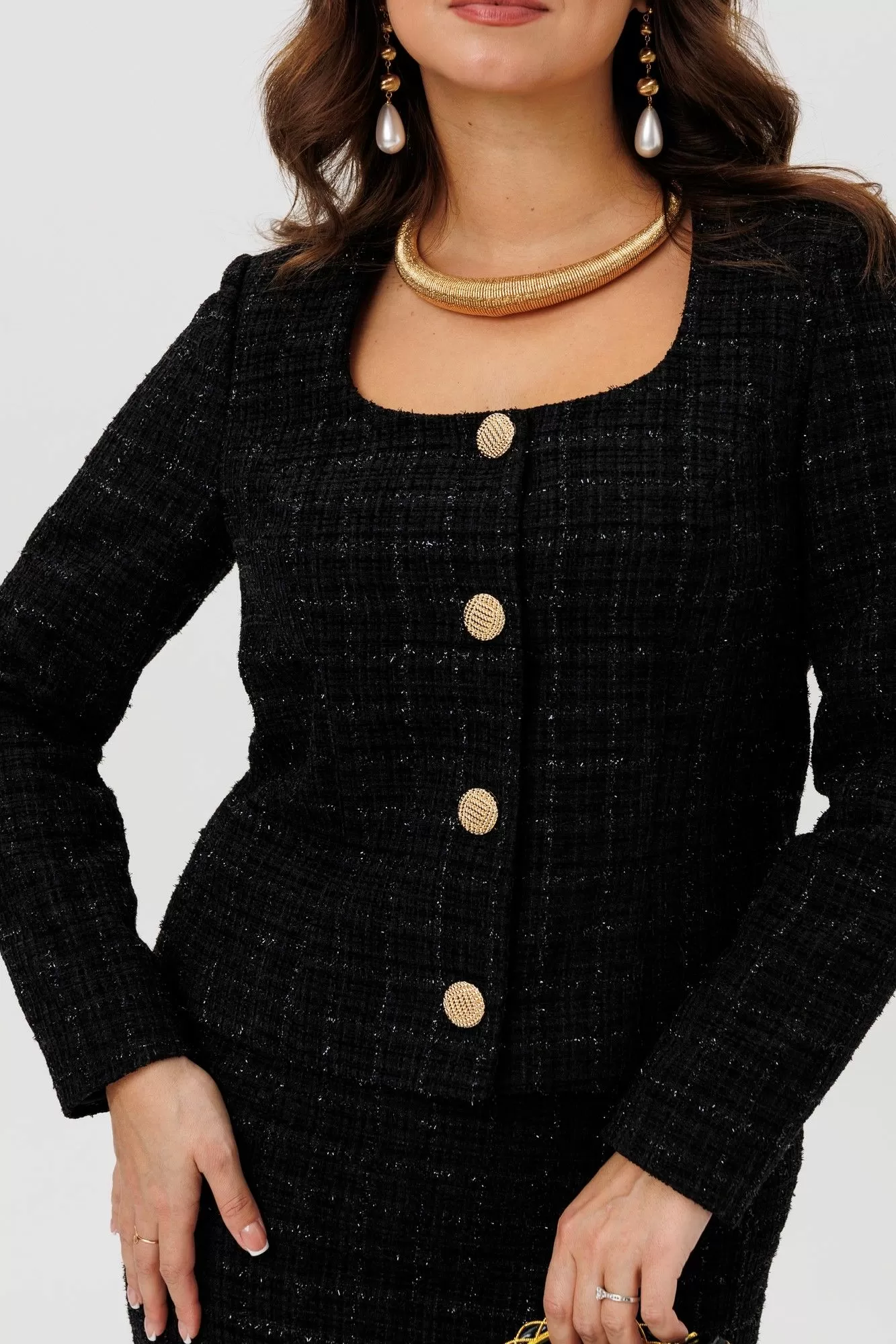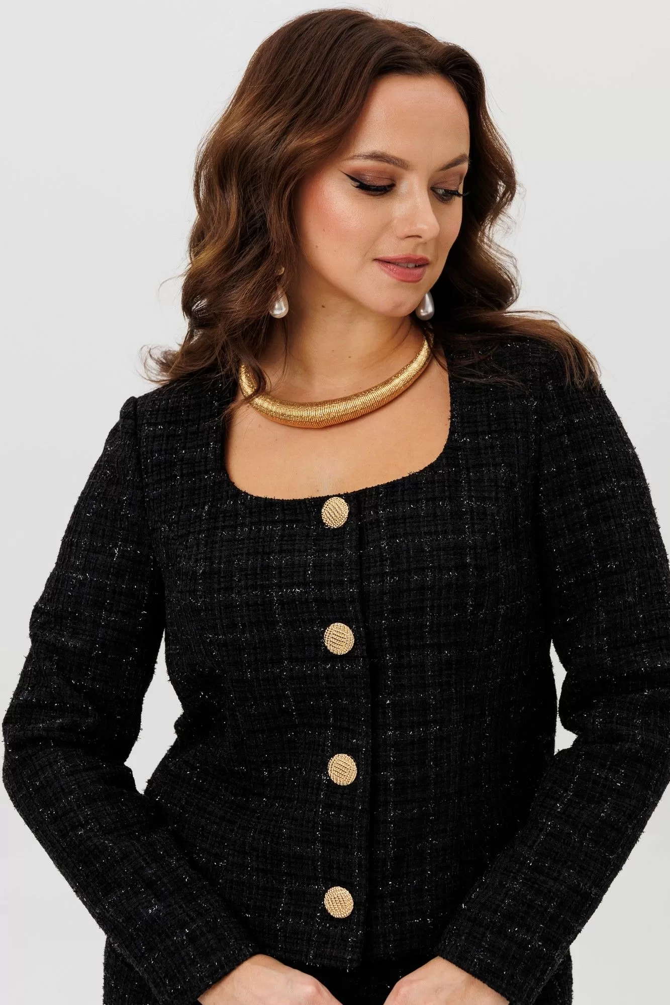 Жакет однобортный полуприлегающего силуэта, застёгивается на четыре петли пуговицы.По переду вырез. Спинка со средним швом и вытачками. Рукава двушонные, гладкие.