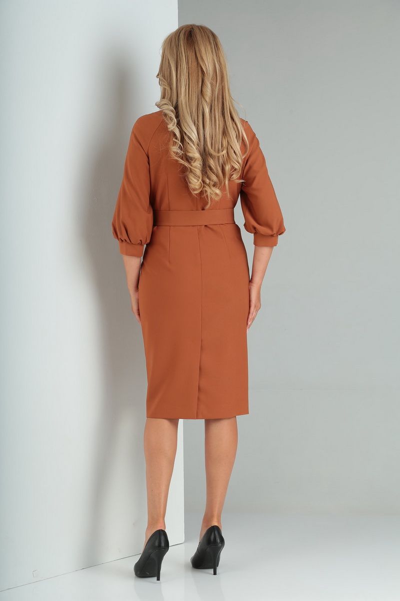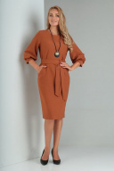 Платье полуприлегающего силуэта. Горловина круглая на обтачке, рукав реглан, 3/4. Низ рукава со сборкой с притачной манжетой. Карманы в рельефах полочки. Спинка с длинной молнией и шлицей в среднем шве. Пояс и кулон входят в комплект. длина платья 103см, длина рукава (от горловины) - 56см