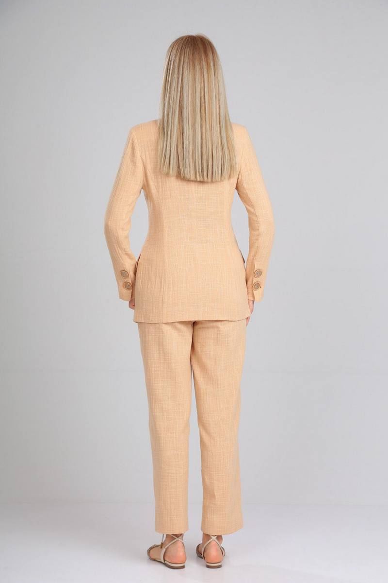 Комплект 2-х предметный. Жакет без подкладки, полуприлегающего силуэта, с фигурным круглым бортом. Большие пуговицы эффективно подчеркивают линию борта, делая на нем акцент. Карманы функциональные, с клапаном и рамками. Рукав втачной, двухшовный. В локтевом шве шлица функциональная, застегивается на две петли-пуговицы. Брюки на поясе со шлевками, карманы с отрезным бочком. длина жакета - 69см, длина рукава - 61см, ширина по низу брючин - 44см, длина брюк - 102см