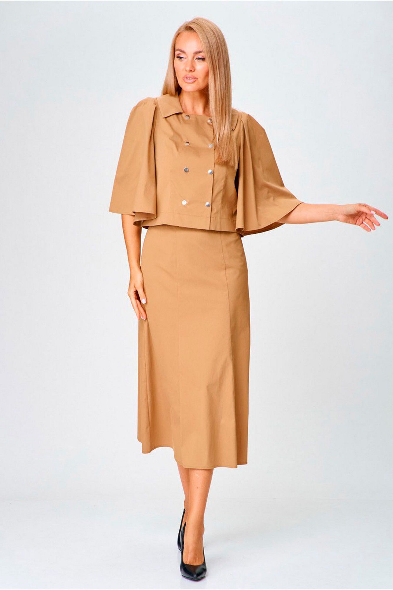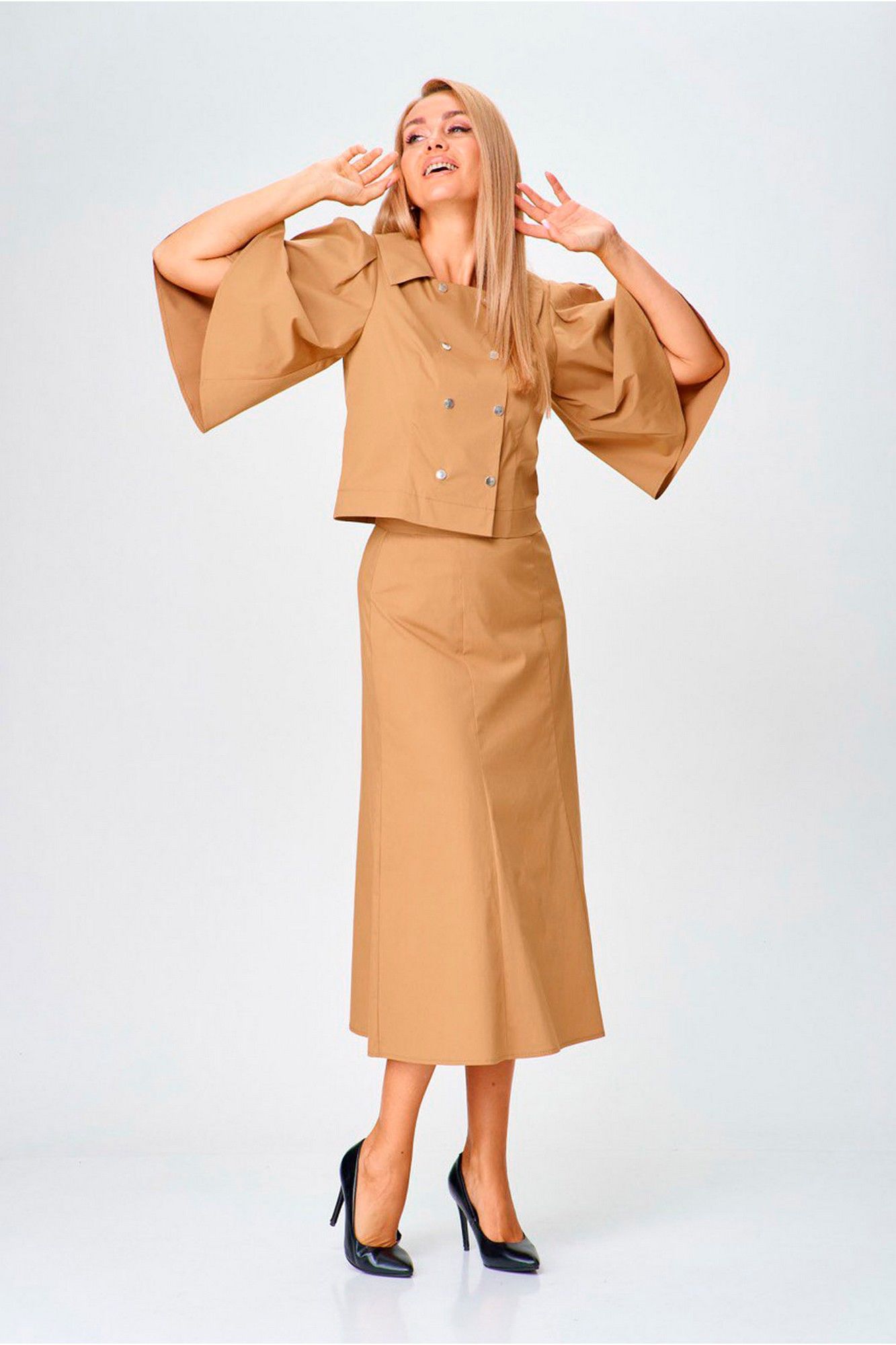Комплект 2-х предметный. Жакет без подкладки, двухбортный с застежской на кнопке. Горловина оформлена плосколежащим воротником. Жакет прямого силуэта, на полочке с выточкой от низа под грудь. Главную роль в жакете играет втачной рукав, очень широкий, расклешонный со складками по окату. Спинка со средним швом и талиевыми вытачками. Юбка на подкладке, "шестиклинка" красивого расширенного к низу силуэта. Верх юбки оформлен притачным поясом, с застежкой на кнопку. Потайная молния в левом боковом шве.