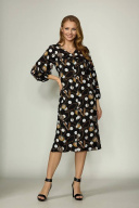 Платье прямое из хлопковой ткани. По переду платья средний шов с нагрудными вытачками, вырез горловины V-образный, рукав 3/4 длины, расширенные к низу на резинке. По боковым швам разрезы. Длина изделия р.42-44 - 113 см, р.46-50 - 114 см, р.52-56 - 115см, р.58-62 - 116см Длина рукава р.42-44 - 60 см, р.46-50 - 60 см, р.52-56 - 61см, р.58-62 -61см