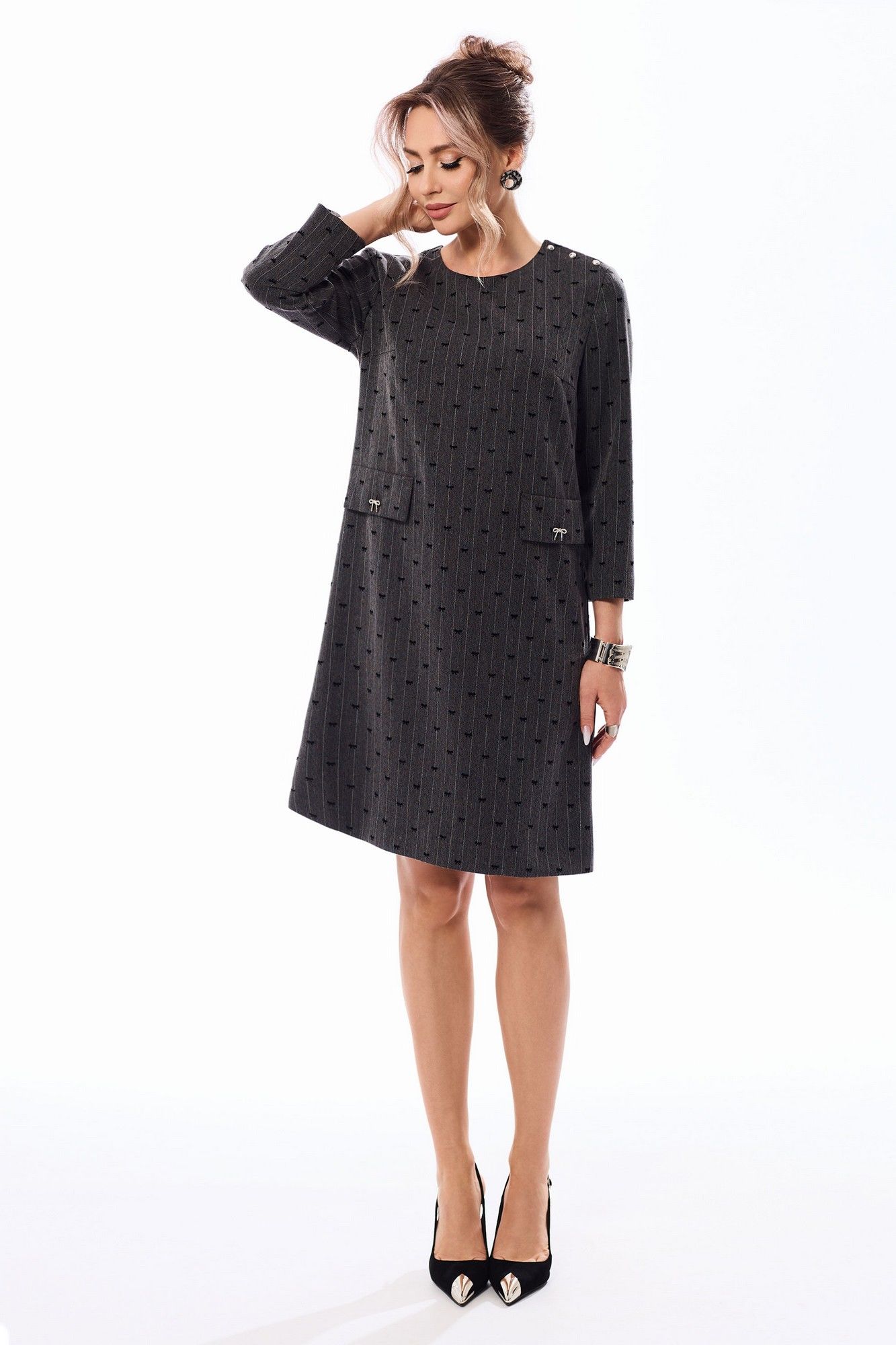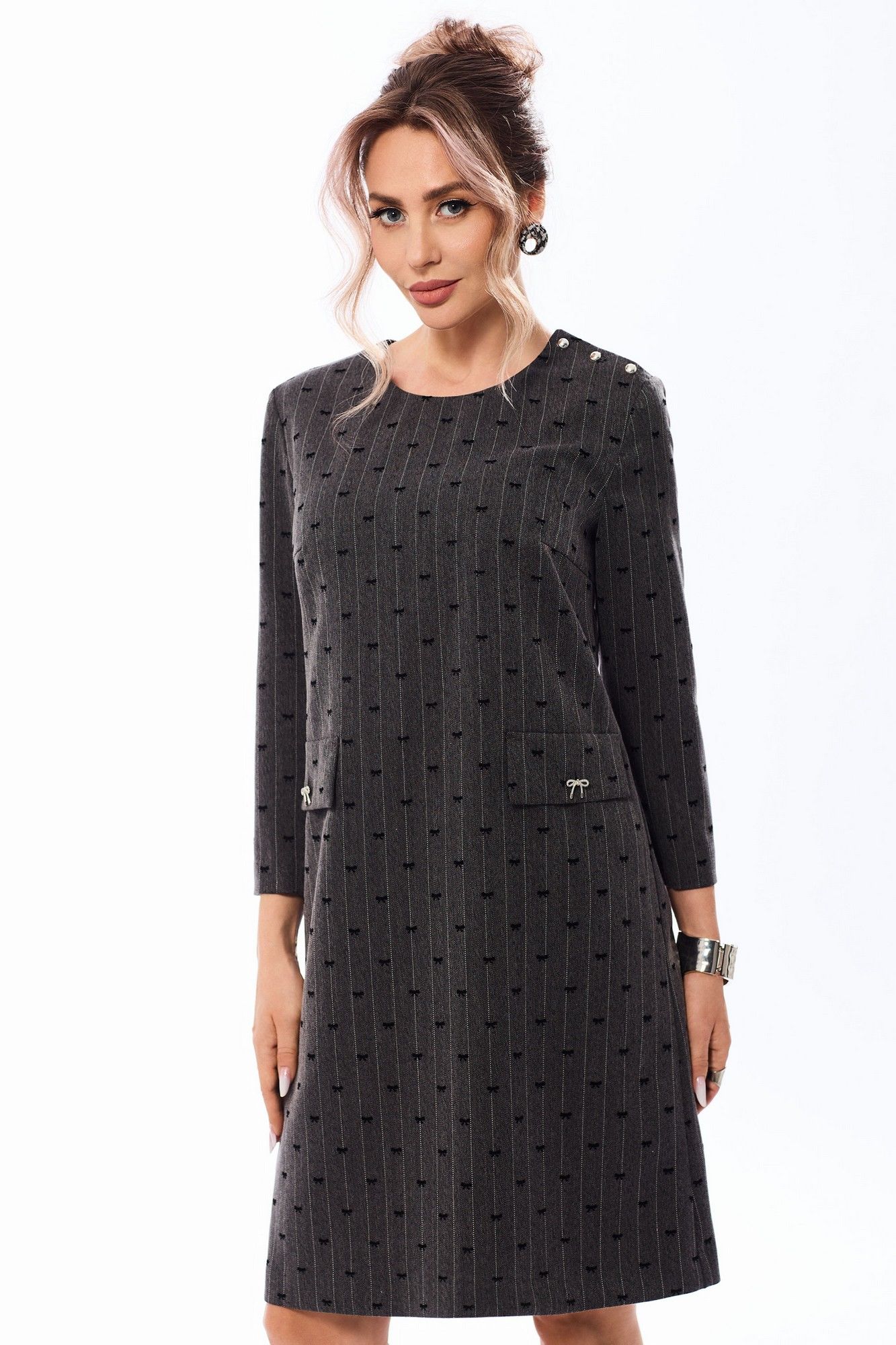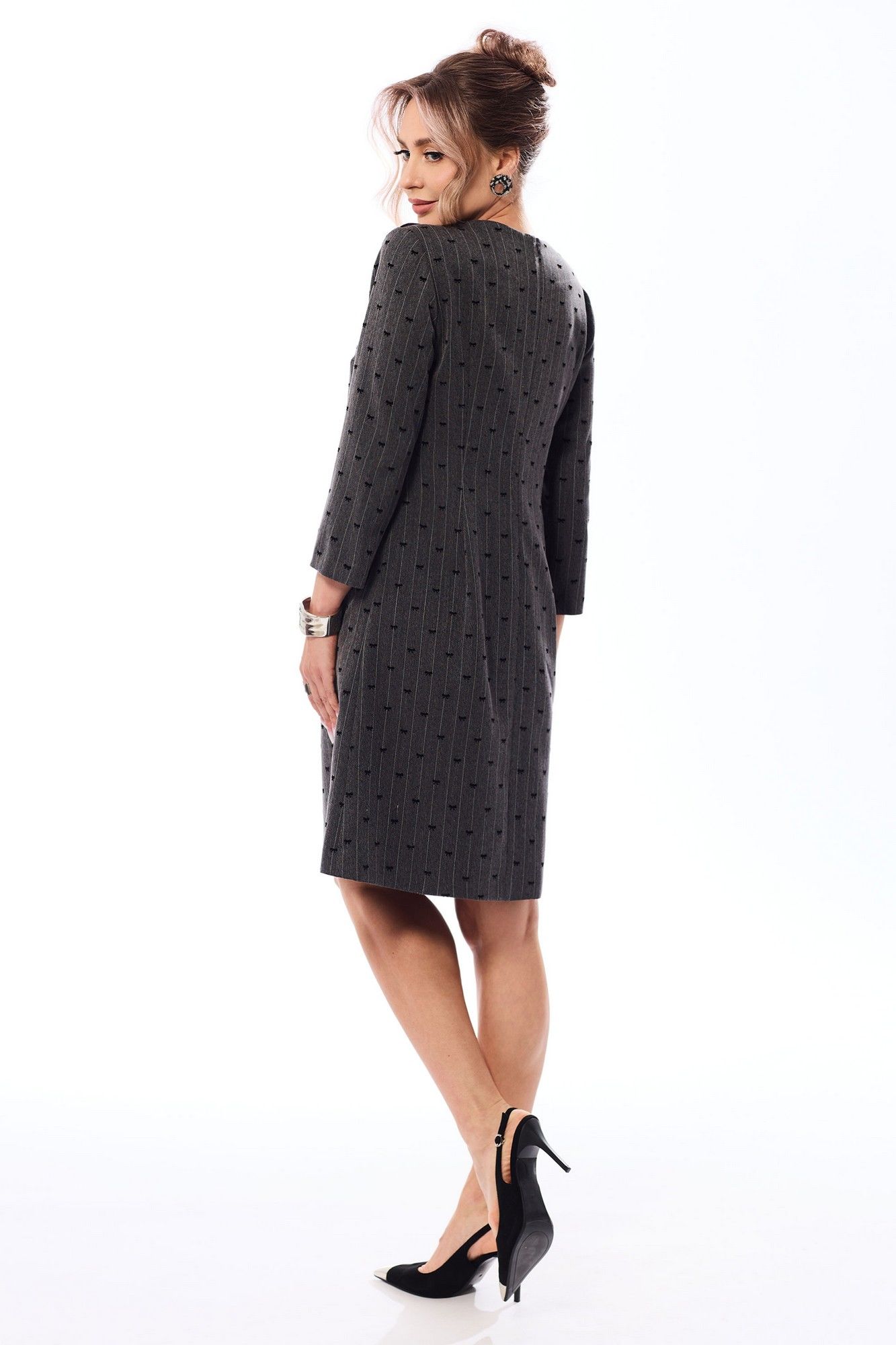 Платье с застежкой на потайную молнию в среднем шве спинки, без воротника, с круглым вырезом горловины, и дополнительной застежкой на петли и пуговицы по левому плечевому шву. По переду с нагрудными вытачками. На уровне линии бедер расположены отделочные клапаны, зафиксированные к платью петлей и пуговицей. Спинка со средним швом, талиевыми вытачками. Рукав втачной, 3/4. платье на подкладке