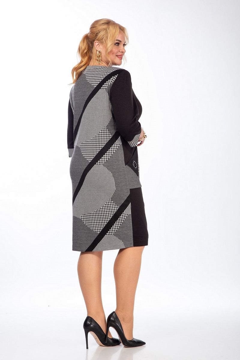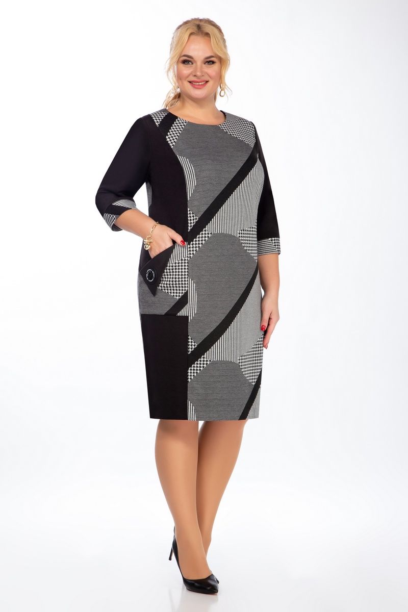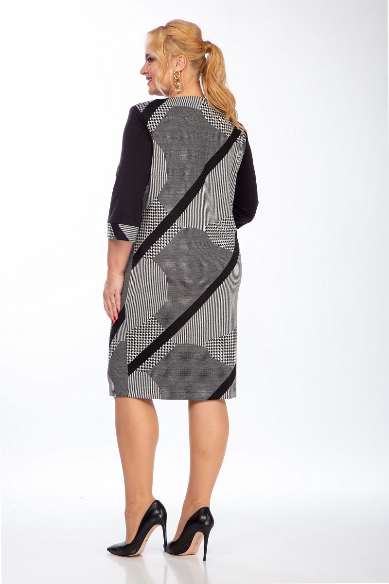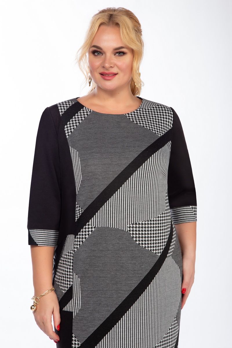 Платье женское из трикотажной ткани, полуприлегающего силуэта, с круглым вырезом горловины. Перед ассиметричный. С правой стороны переда бочок из однотонного трикотажа с накладным карманом. На кармане пришита декоративная нашивка. С левой стороны переда нагрудная вытачка, идущая из бокового шва. Рукава втачные, три четверти из однотонного трикотажа с цветными манжетами.