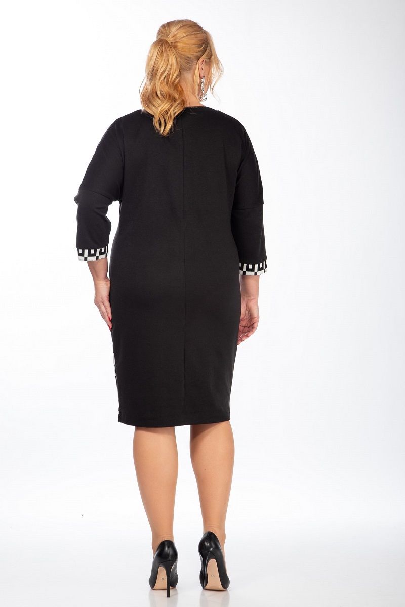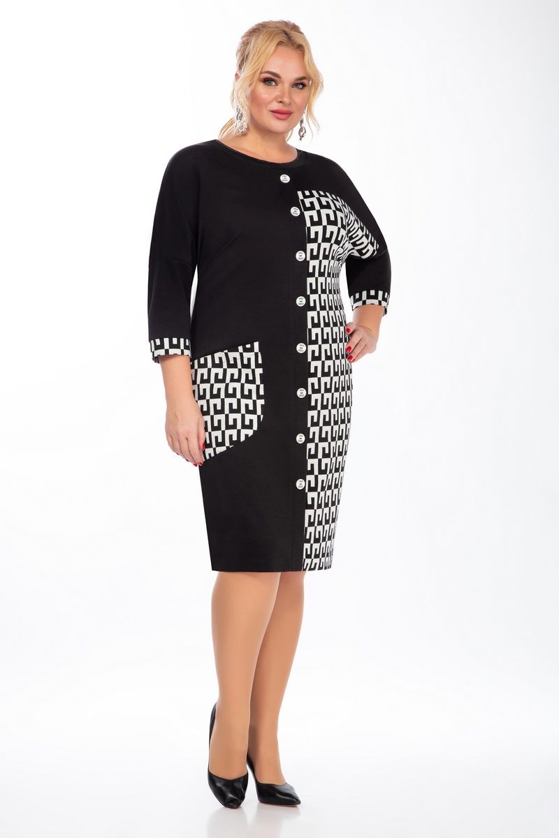 Платье женское из трикотажной ткани, полуприлегающего силуэта, с круглым вырезом горловины. Горловина обработана довязом. Платье с нагрудными вытачками, идущими из бокового шва к центру груди. Перед ассиметричный , с правой стороны переда расположен накладной карман. С левой стороны отрезная кокетка переда. По центру переда расположена декоративная планка с отделочными пуговицами. Спинка со средним швом., плечо спущено, рукав длиной 3\4 с манжетой.