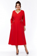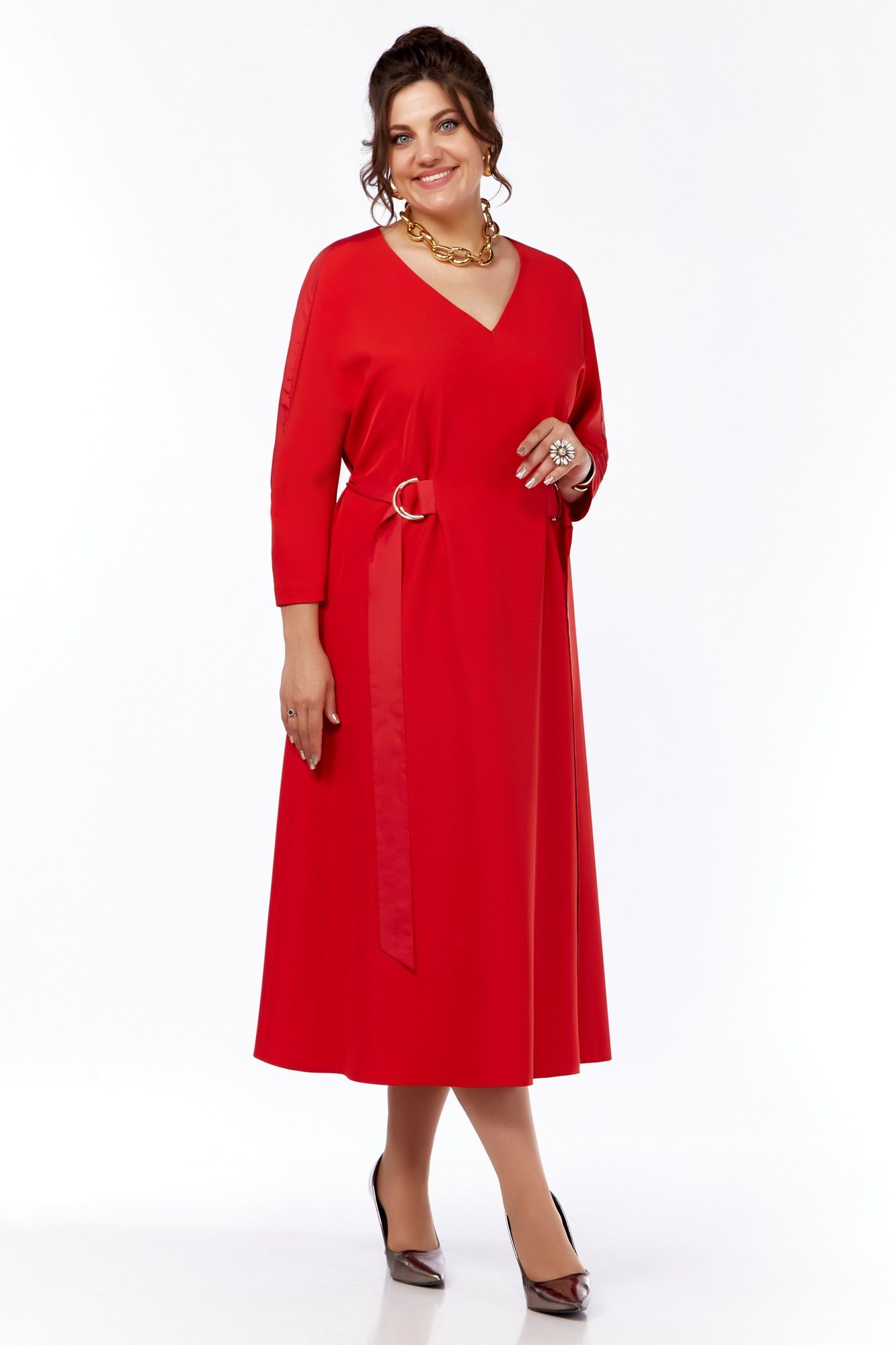 Платье женское, А-образного силуэта, с цельнокроенным рукавом. Перед без нагрудных вытачек, по талии в складках, расположены пряжки для пояса.Спинка со средним швом. В боковых швах расположены карманы. Горловина V-образная . В плечевых швах расположены отделочные детали из плащевки, пояс так же выполнен из плащевки.