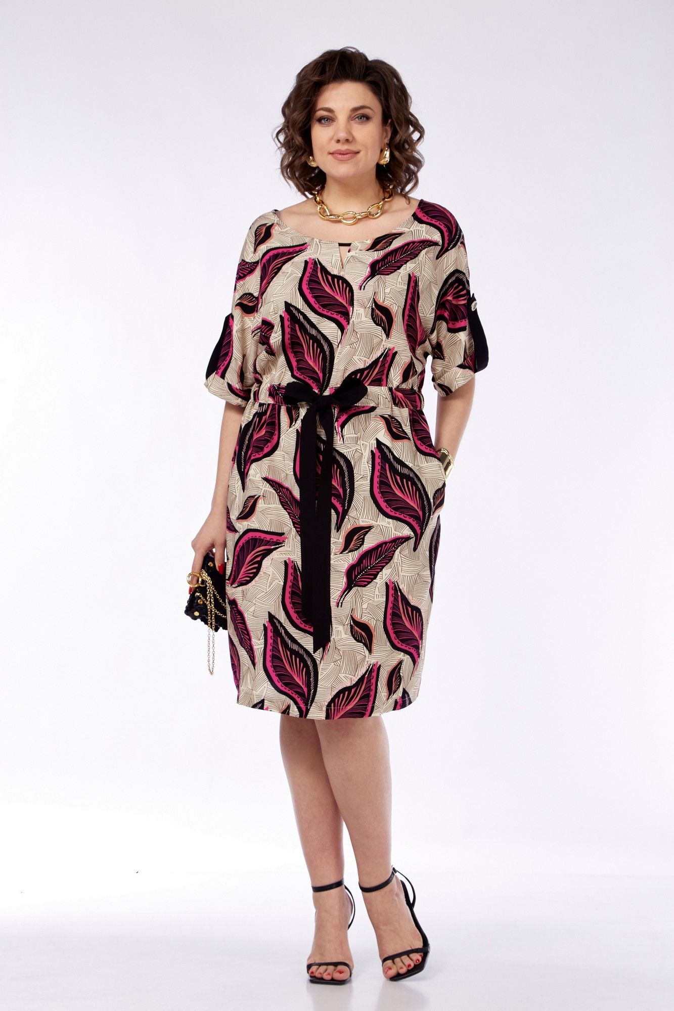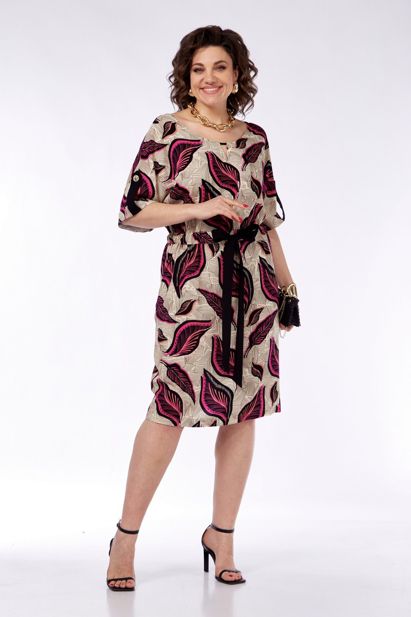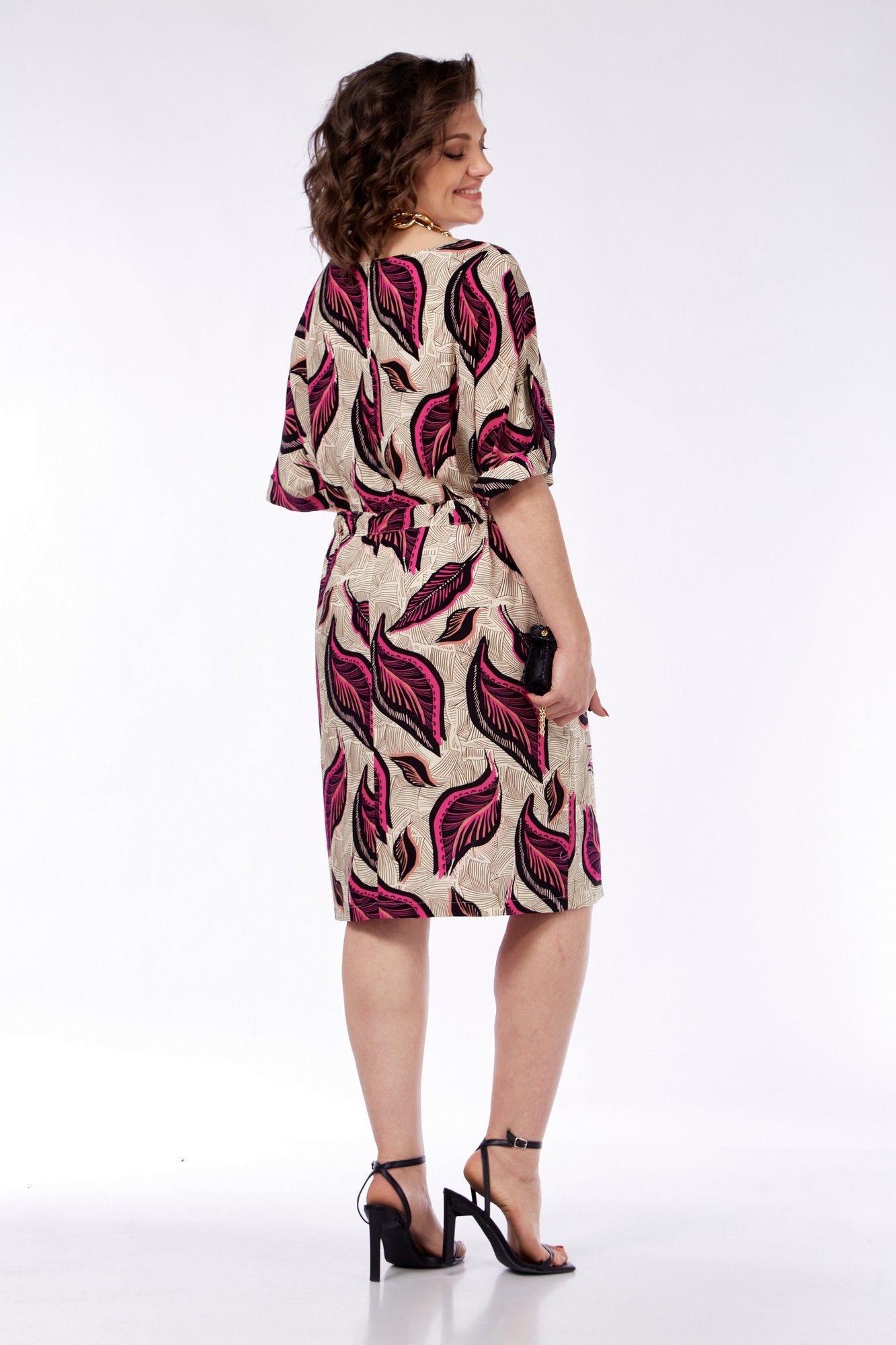 Платье женское, полуприлегающего силуэта, без нагрудных вытачек, со спущенным плечом. Спинка со средним швом. Горловина круглая с мысиком, обработана окантовкой. Платье по талии с кулисой, затягивается поясом, из отделочной ткани. В боковых швах расположены карманы. Низ рукава обработан манжетой и патой из отделочной ткани.