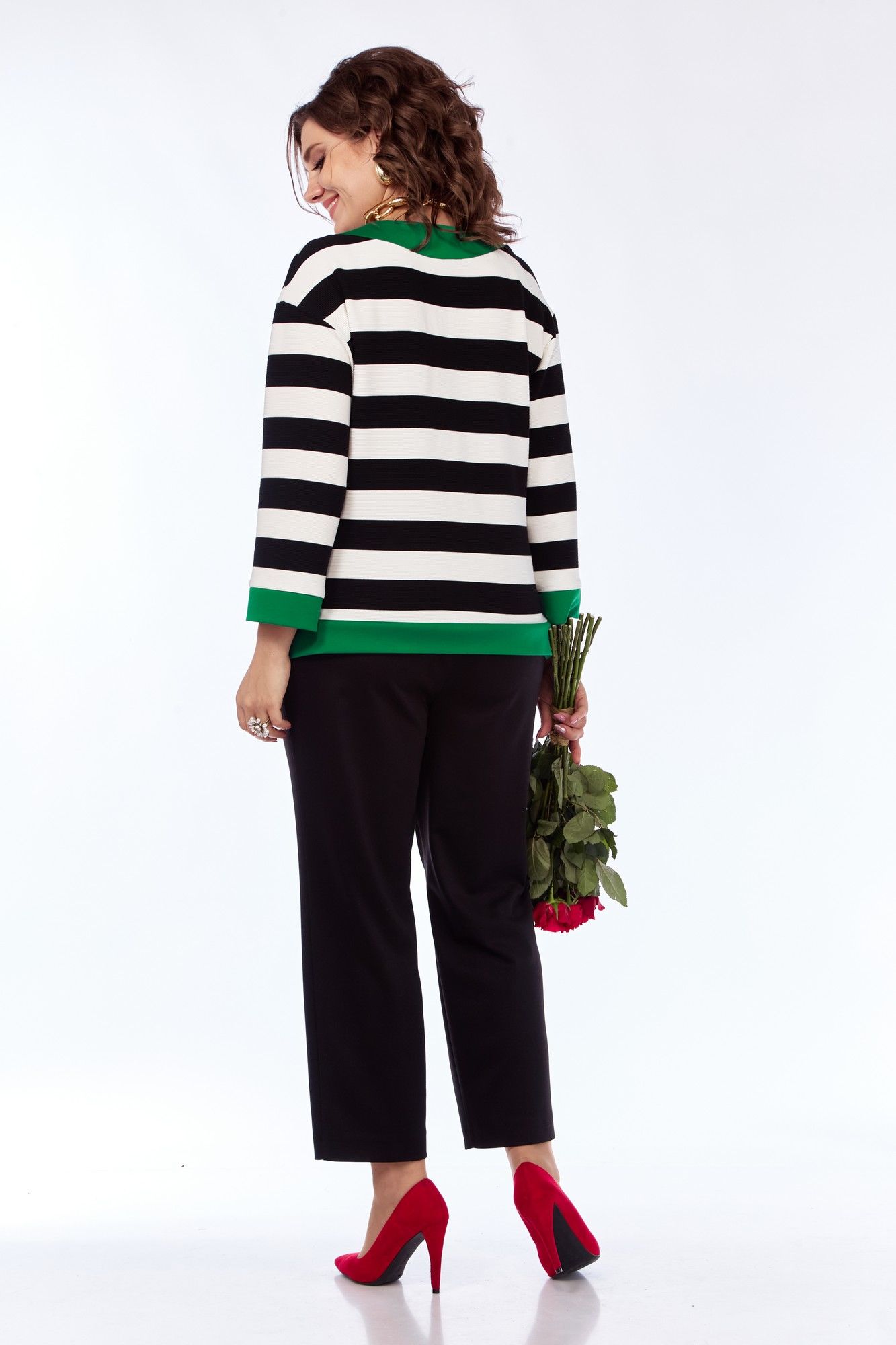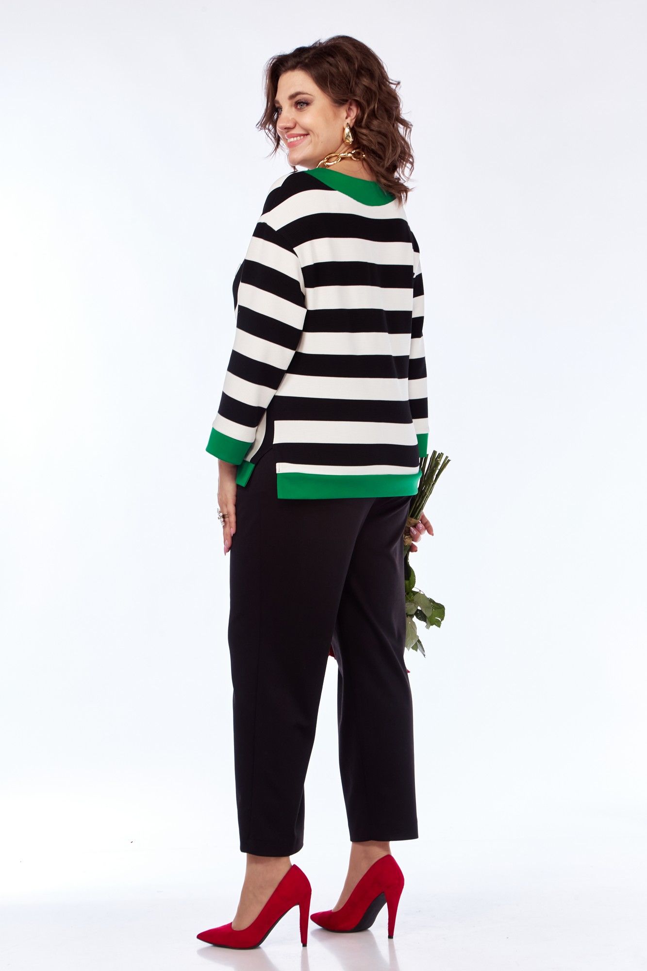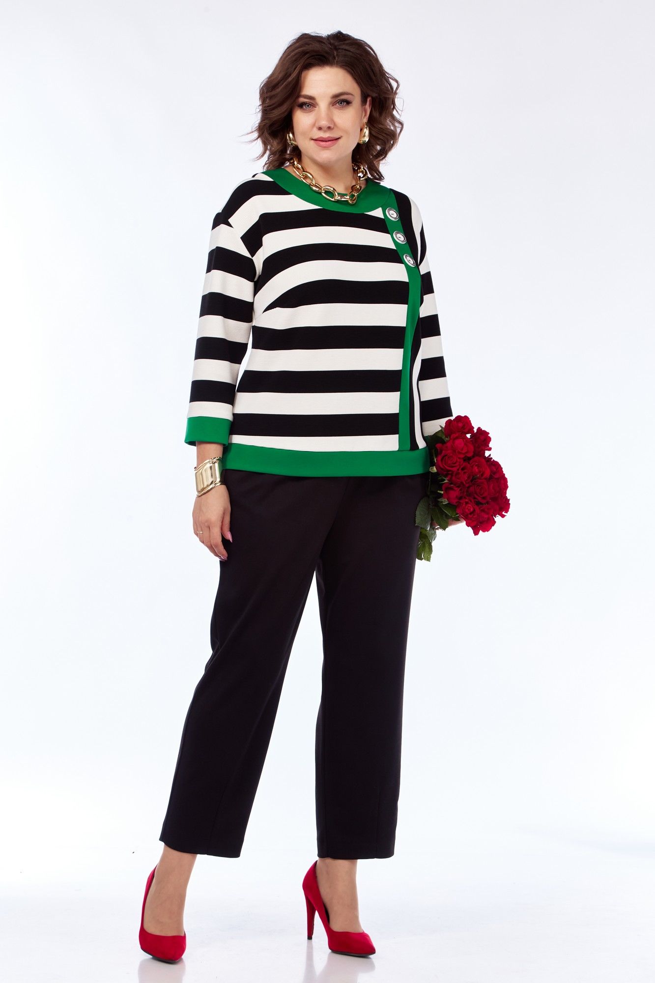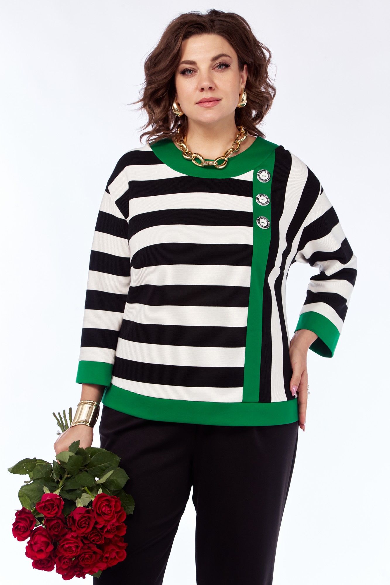 Комплект женский 2-х предметный, состоящий из кофты и брюк. Кофта: прямого силуэта из трикотажного полотна в полоску и отделкой из зеленого однотона. Кофта со спущенным плечом, перед с нагрудными вытачками, идущими от центра груди к боковым швам . Горловина обработана отделочными деталями. Перед ассиметричный, в левой части переда принт, который располагается вдоль бочка. По переду распложена планка из отделочной ткани с тремя декоративными пуговицами. По низу переда и спинки так же расположена отделочная деталь, в боковых швах имеются разрезы. Спинка без среднего шва. Рукава 3\4, с манжетой из отделочной ткани. Брюки: Из трикотажной ткани, на поясе с резинкой. Передняя часть брюк со складками, идущими от пояса, с наклонными, боковыми карманами. По низу расположена вытачка. Задняя часть брюк без талиеывх вытачек.
