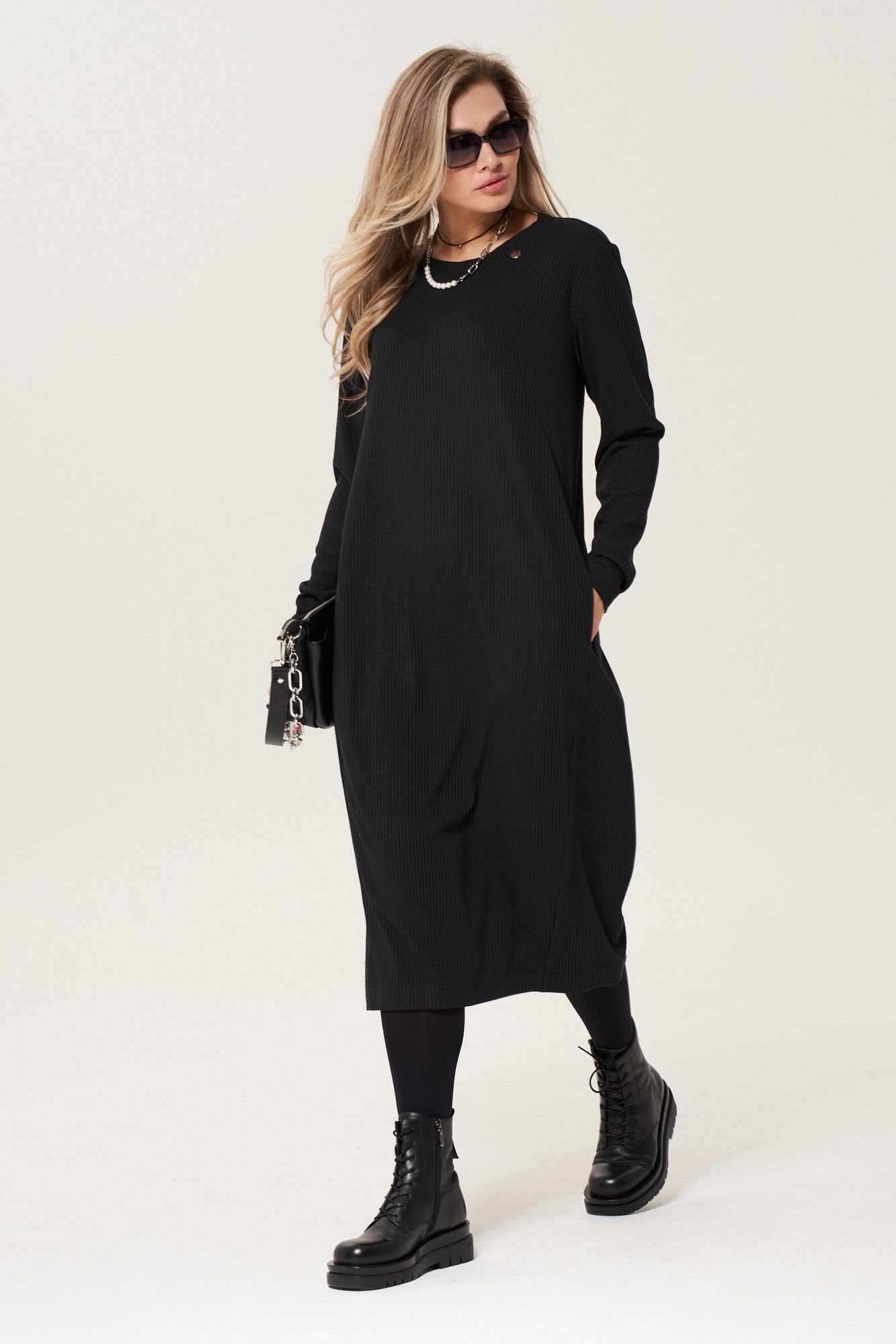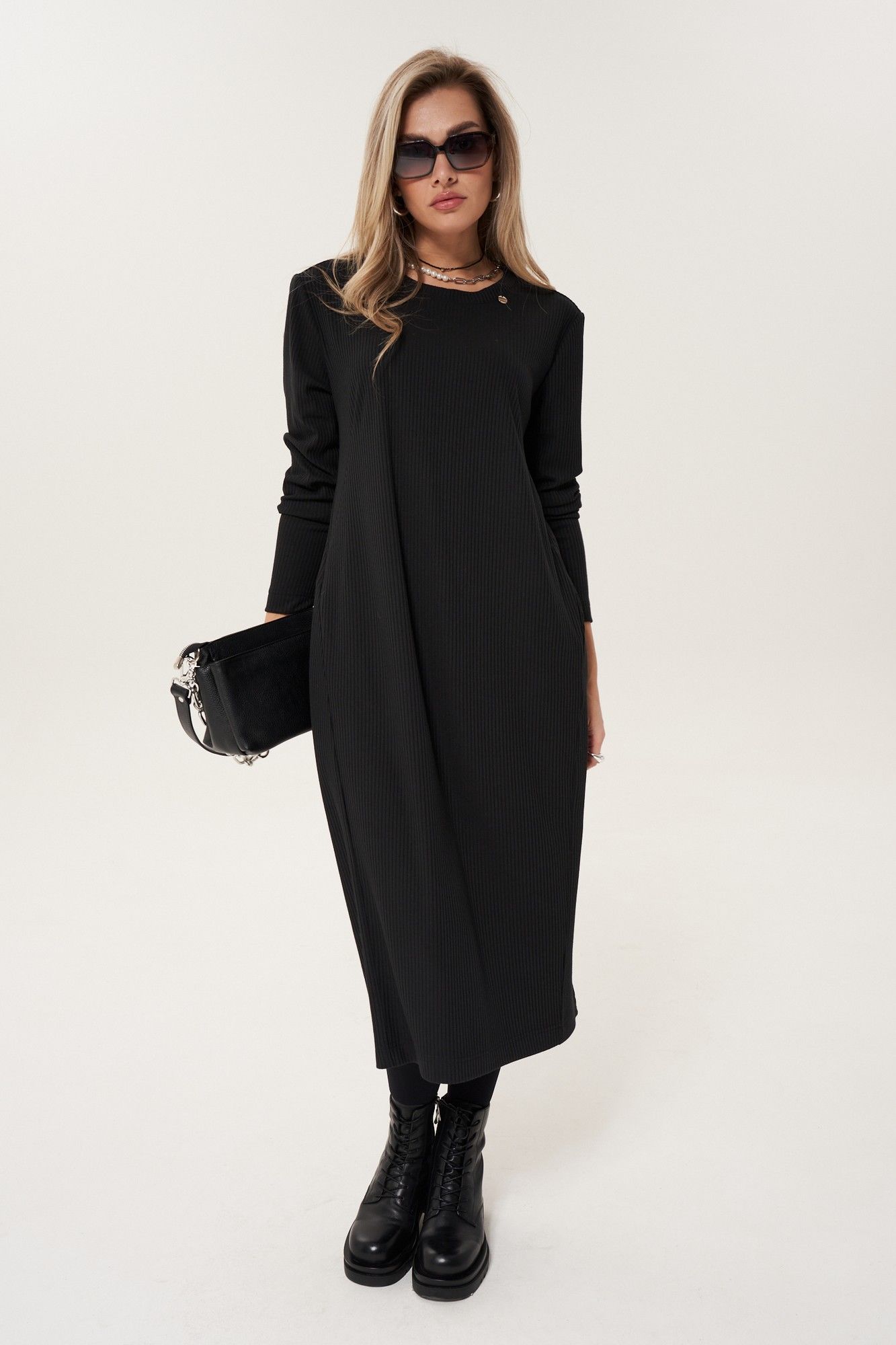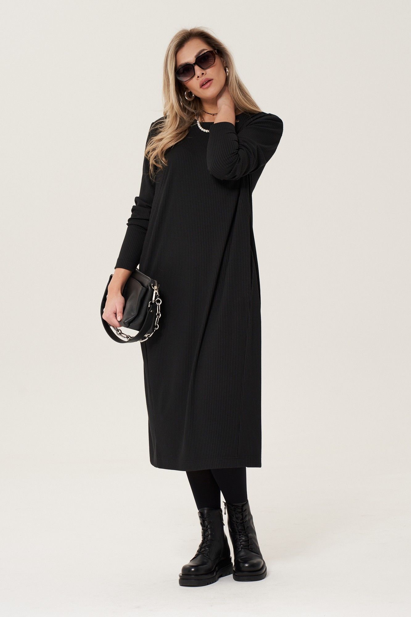 Платье прямого кроя из мягкого трикотажа с ребристой текстурой идеально сочетает комфорт и стиль. Модель отличается универсальным дизайном с длинными рукавами и круглым вырезом, что делает ее подходящей для любого сезона. Лаконичный фасон позволяет создавать разнообразные образы – от строгого делового до расслабленного городского стиля. Плотная ткань приятна к телу, а свободный силуэт обеспечивает комфорт в движении. Платье дополнено небольшими декоративными элементами, которые придают ему индивидуальность.