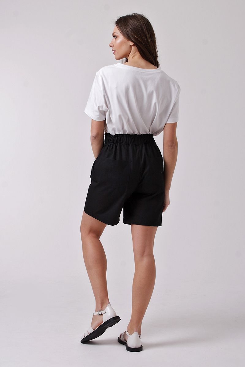 1. Шорты женские, удлиненные. Бермуды 2. Без застежки, выполнена имитация, пояс обработан резинкой. 3. На спинке обработаны накладные карманы 4. На переде-боковые карманы с отрезным бочком 5. Длина шагового (внутреннего шва)-18 см. 6. Бережная стирка при 30 градусах