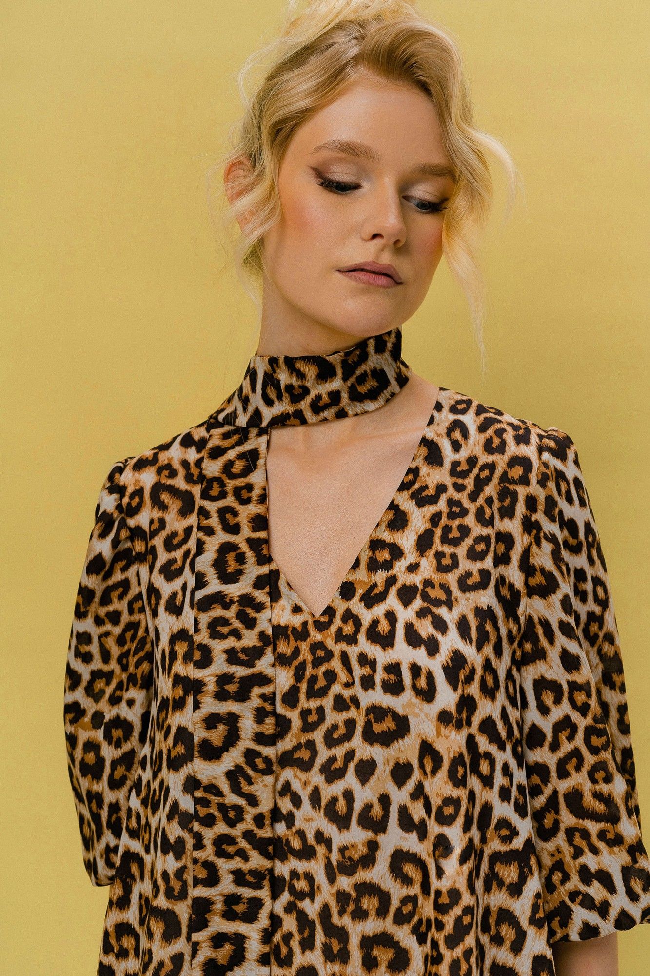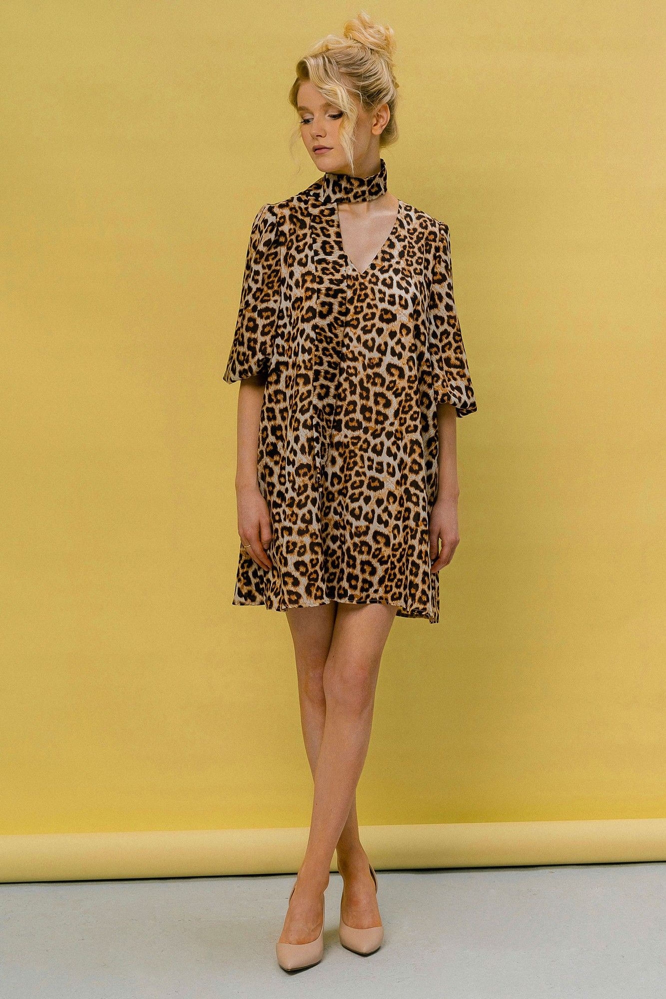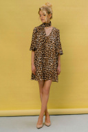 Платье молодежное из нат. ткани с печатным рисунком леопард с расклешением к низу,на подкладке,без застежки,рукав рубашечного типа со сборкой по окату и по низу с эластичной тесьмой.карманы в боковых швах.Горловина V образной формы. Платье длина 86 см ширина на уровне глубины проймы 52см (42-46рр) ширина на уровне бедер 55см ширина на уровне талии 53см Длина рукава 48см