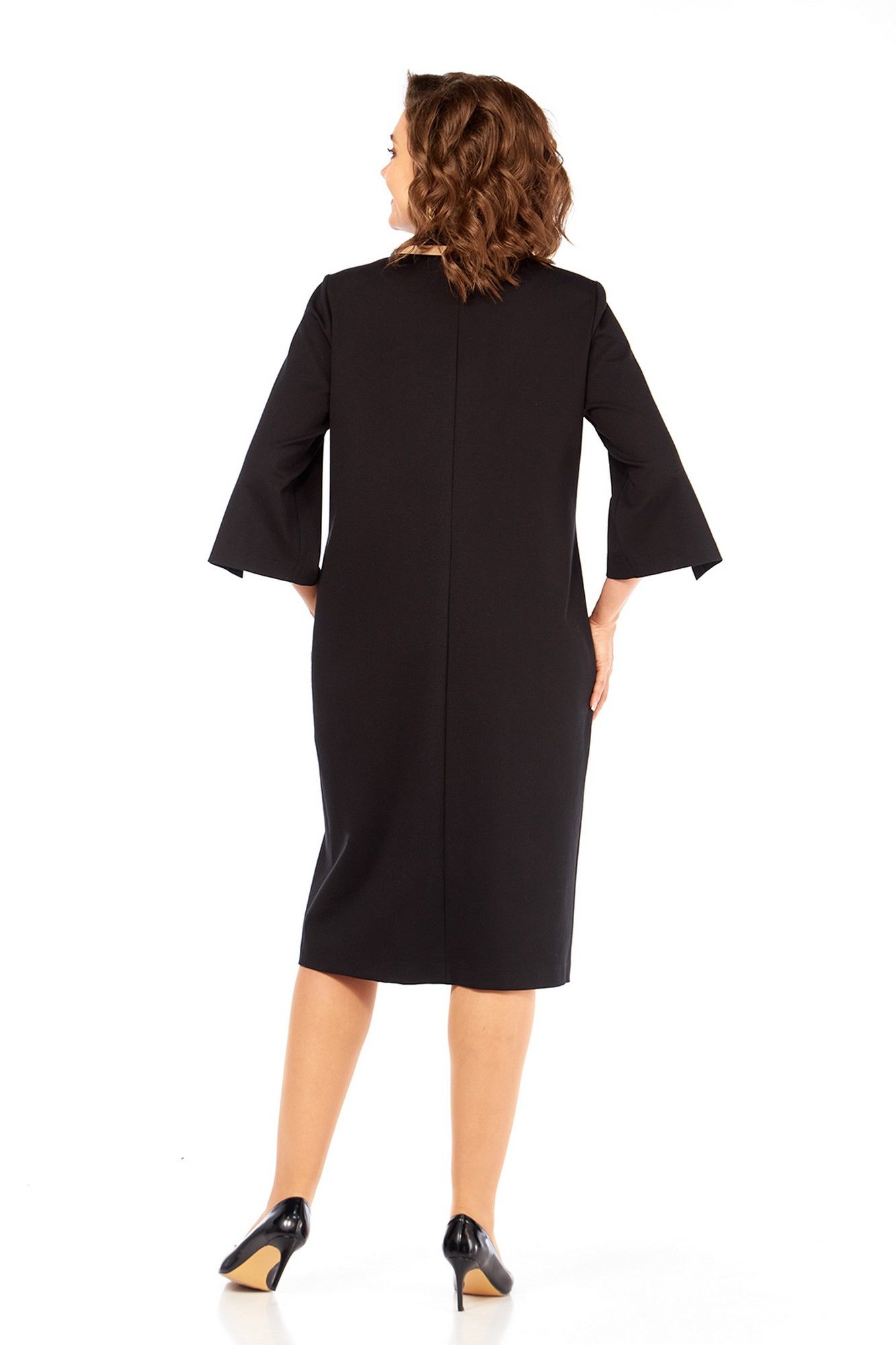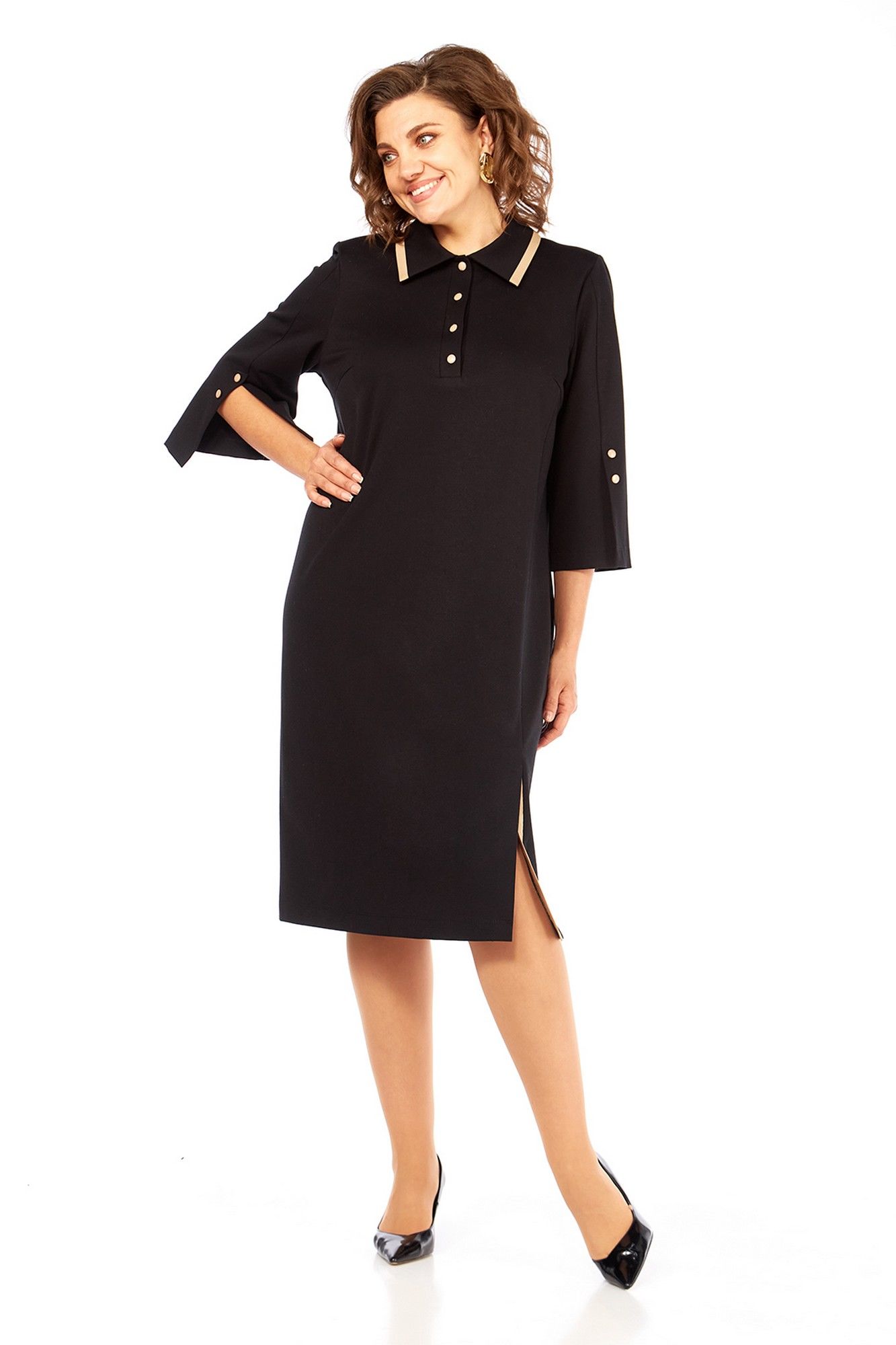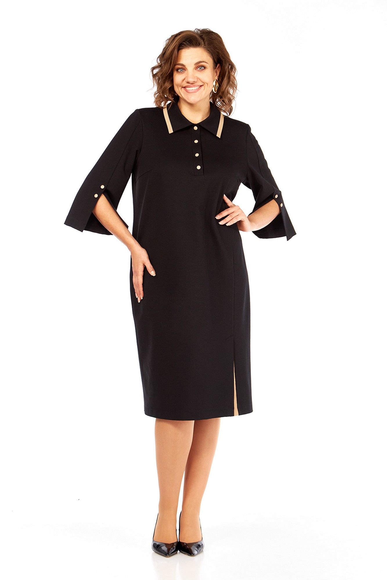Платье женское, прямого силуэта, выполнено из трикотажного полотна. Горловина обработана стояче-отложным воротником и планкой с застежкой на петли и пуговицы. По переду нагрудные вытачки и асимметричный рельеф, в котором обработана шлица. Спинка со средним швом и талиевыми вытачками. Рукава втачные, в передних швах обработаны декоративные шлицы с пуговицами. По краю воротника и шлице вставки из отделочной ткани. Длина платья по спинке — 106 см, длина плеча — 13 см, длина рукава — 47 см. р.50 — ПОГ 54 см ПОБ 56 см, р.52 — ПОГ 56 см ПОБ 58 см, р.54 — ПОГ 58 см ПОБ 60 см.