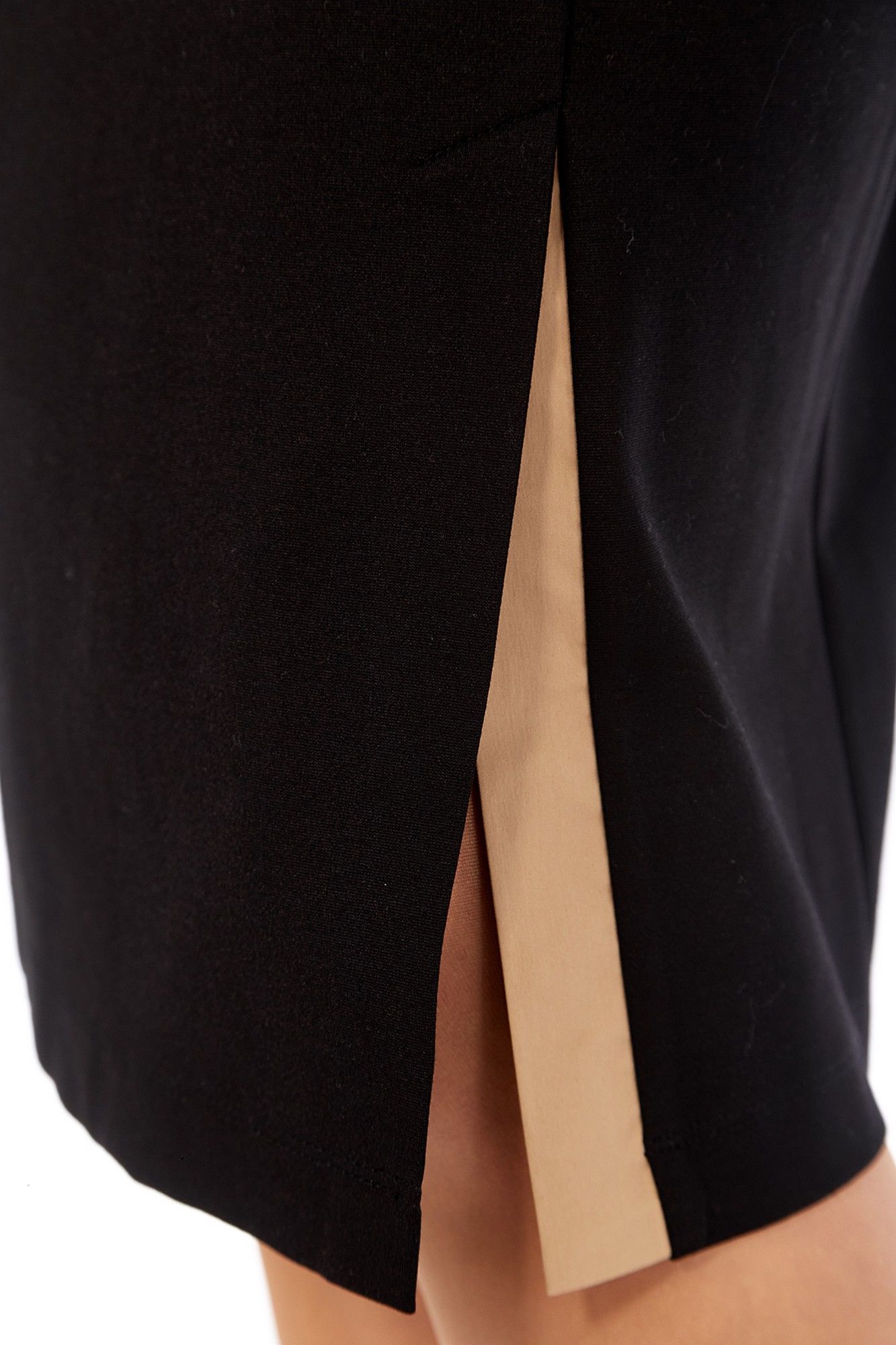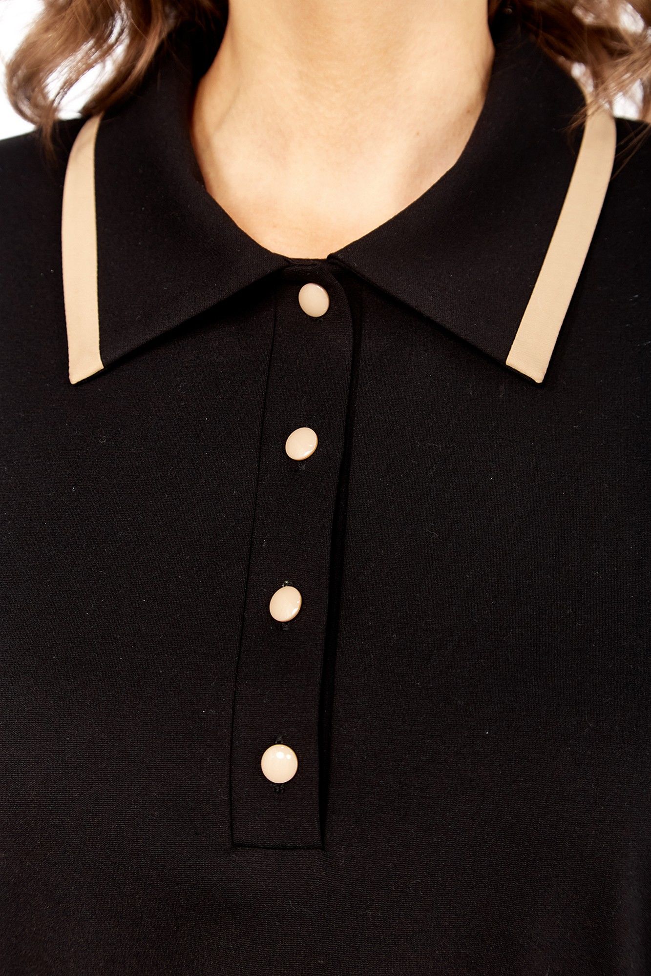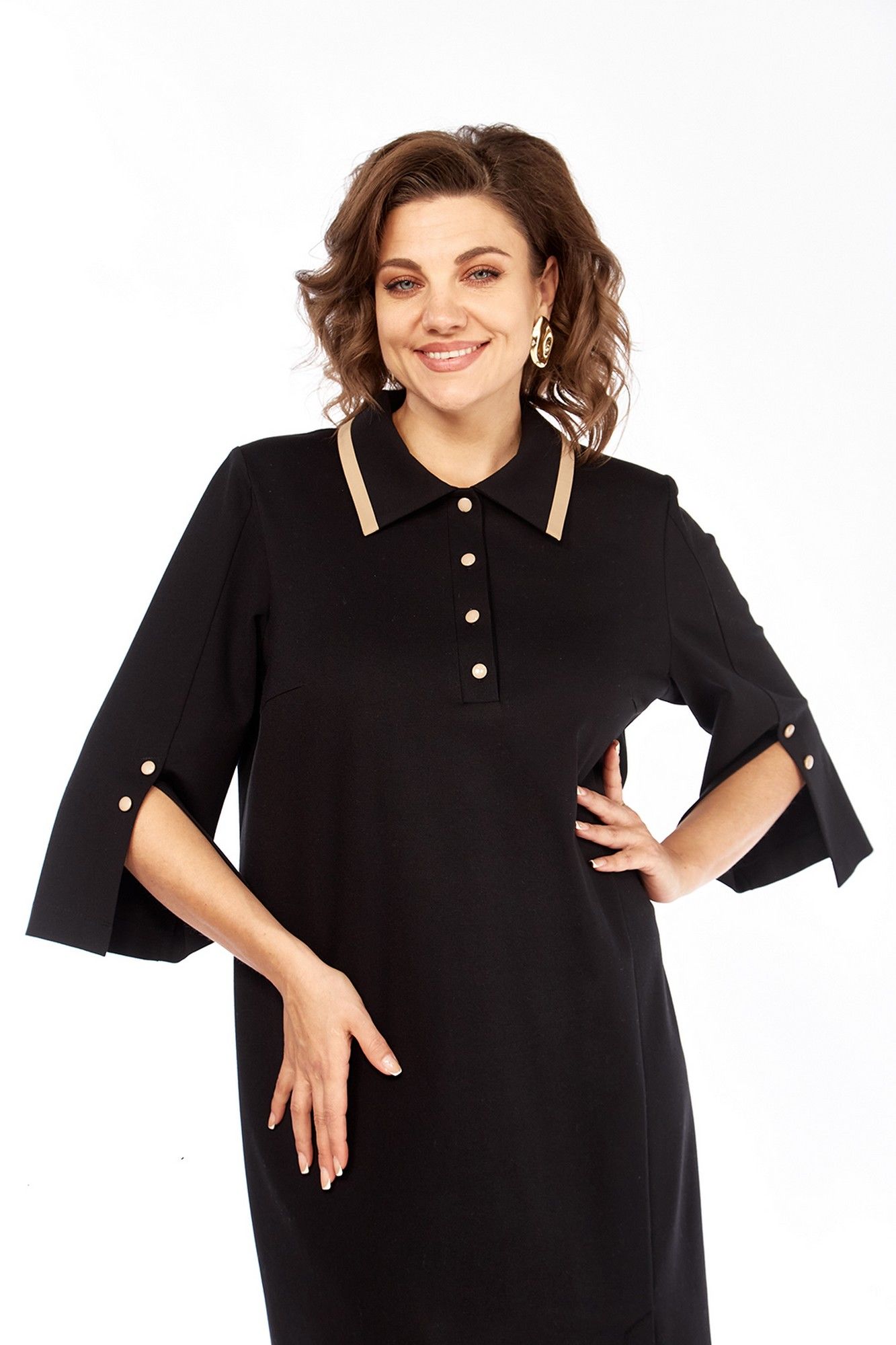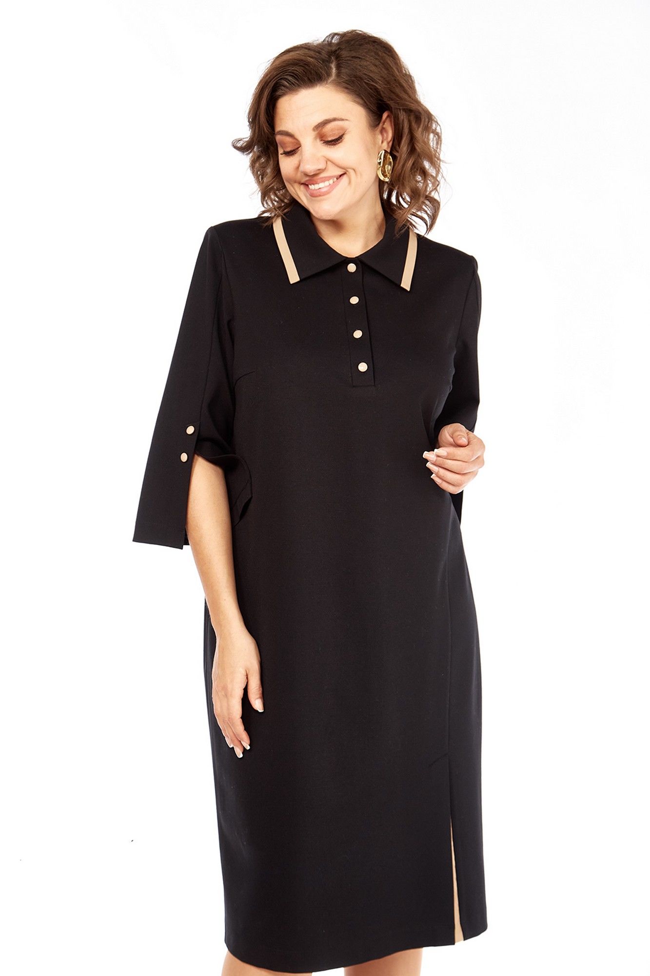 Платье женское, прямого силуэта, выполнено из трикотажного полотна. Горловина обработана стояче-отложным воротником и планкой с застежкой на петли и пуговицы. По переду нагрудные вытачки и асимметричный рельеф, в котором обработана шлица. Спинка со средним швом и талиевыми вытачками. Рукава втачные, в передних швах обработаны декоративные шлицы с пуговицами. По краю воротника и шлице вставки из отделочной ткани. Длина платья по спинке — 106 см, длина плеча — 13 см, длина рукава — 47 см. р.50 — ПОГ 54 см ПОБ 56 см, р.52 — ПОГ 56 см ПОБ 58 см, р.54 — ПОГ 58 см ПОБ 60 см.