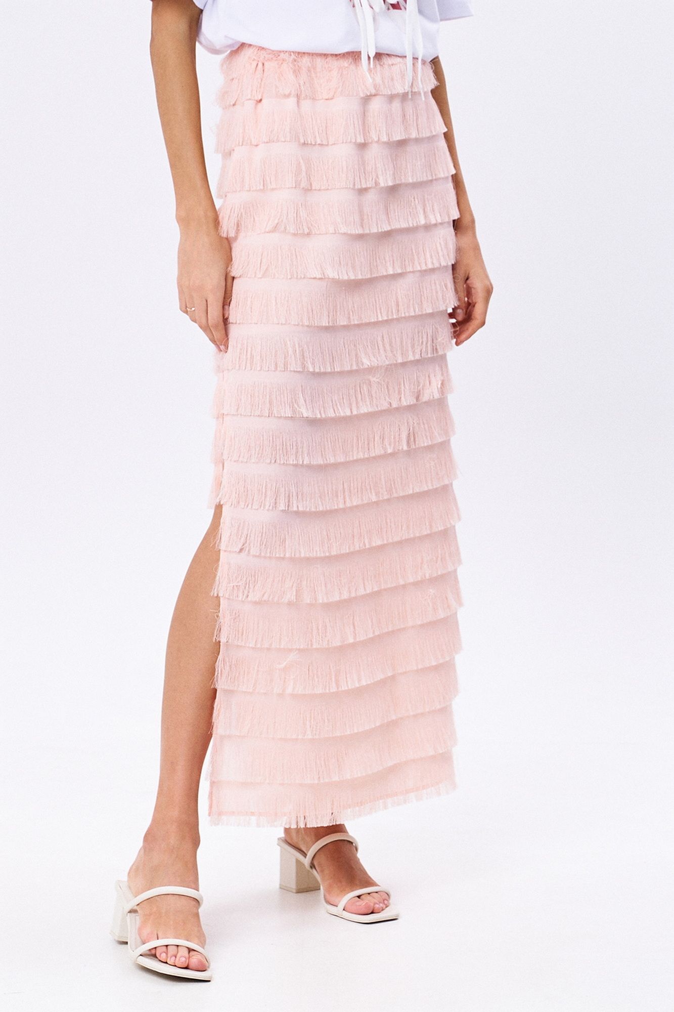 Юбка прямого силуэта длины макси на резинке по талии с разрезами по бокам.