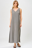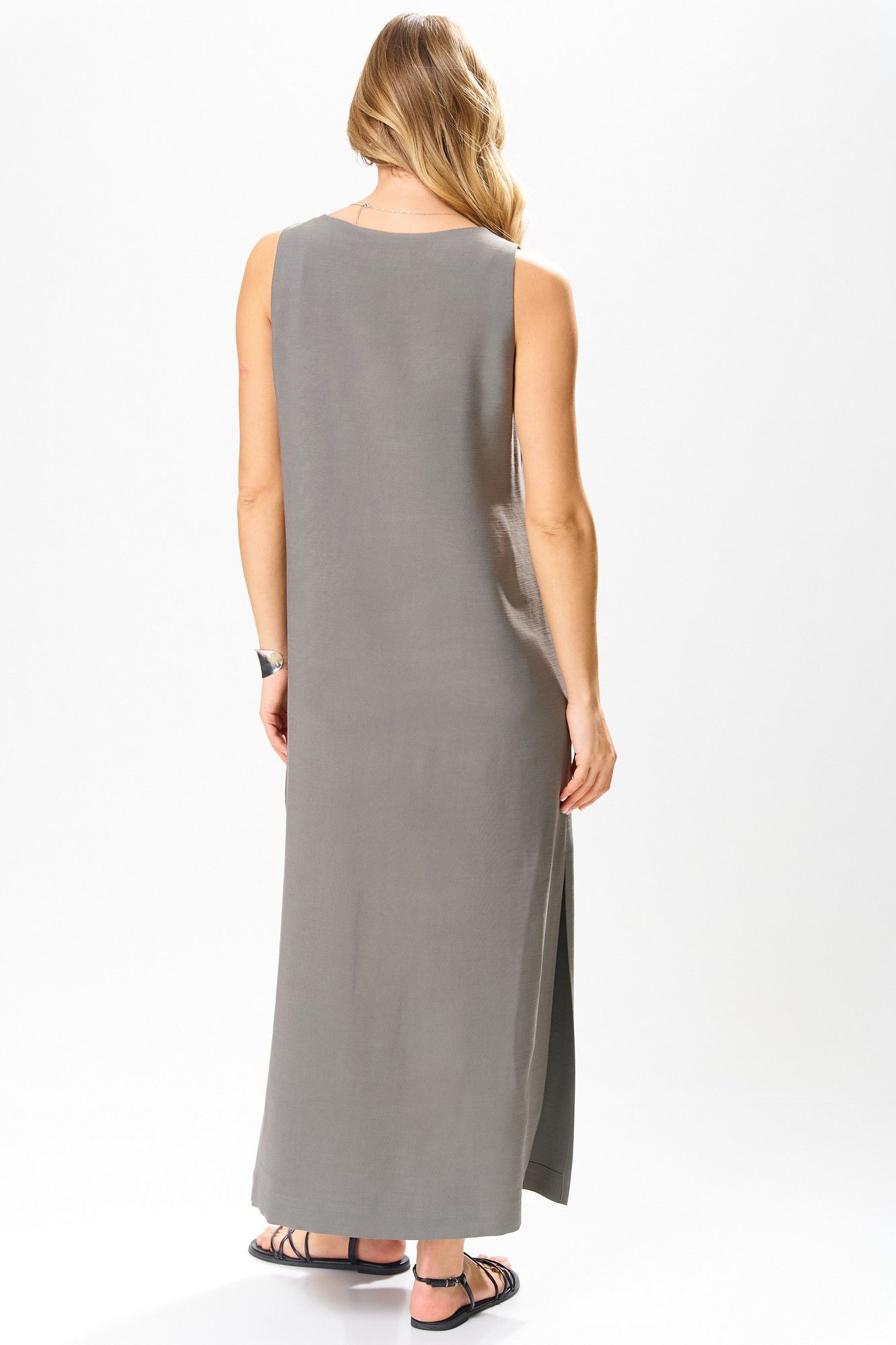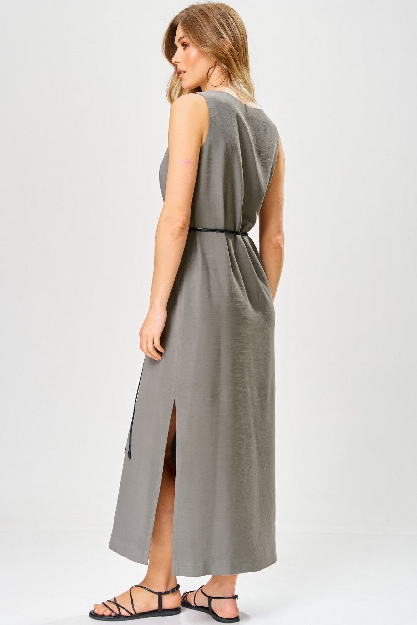 Платье женское из вискозной ткани, полуприлегающего силуэта,прямое книзу, длиной до середины икр, в боковых швах обработаны разрезы, со съемным поясом из декоративной тесьмы. Деталь переда платья с нагрудными вытачками. Вырез горловины – «V-образной» формы. Платье: длинасередины спинки – 130см.