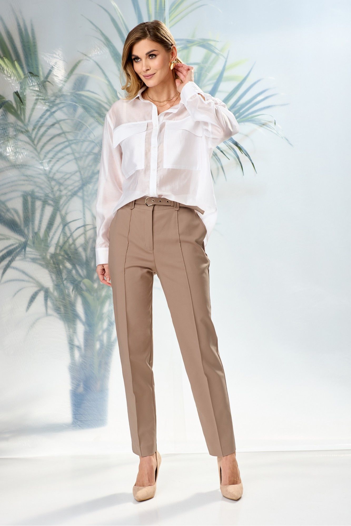 Блузка женская из нежнейшей ткани ""вуаль"", полуприлегающего силуэта, со спущено линией плеча, с втачными рукавами, с втачным воротником, с центральной сквозной застежкой на 6 петель и 6 пуговиц и 1 петлю и пуговицу на стойке воротника. Детали переда блузки с кокетками, на нижних частях расположены накладные карманы, в шов соединения с кокетками вставлены клапаны. Деталь спинки с кокеткой, на нижней части по центру шва соединения обработана складка. Рукава втачные одношовные, с притачными манжетами, с застежкой на 1 петлю и 1 пуговицу. Разрезы рукавов обработаны окантовкой. Брюки на бедрах из облегченной костюмной ткани, плотно облегающие вверху и зауженные к низу, с притачным поясом-кокеткой, со съемным поясом. Застежка на тесьму-молнию, 1 потайной крючок и 1 потайную петлю и пуговицу. На передних половинках в боковых швах обработаны наклонные карманы с планками. На задних частях брюк обработаны по 2 вытачки на каждой половинке. На передних половинках брюк застрочены «канты», на задних - заутюжены. На поясе-кокетке прикреплены 4 шлёвки фигурной формы.