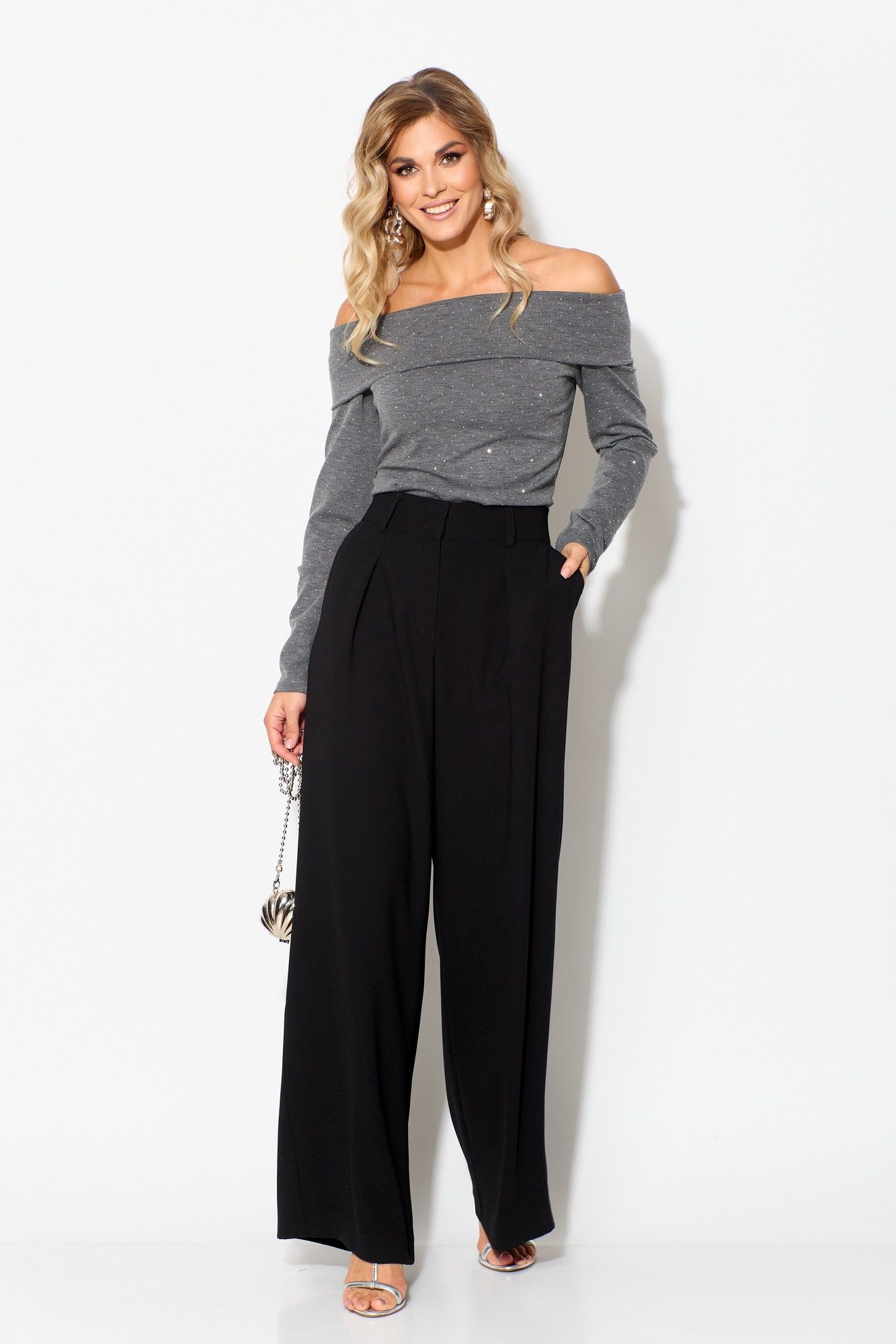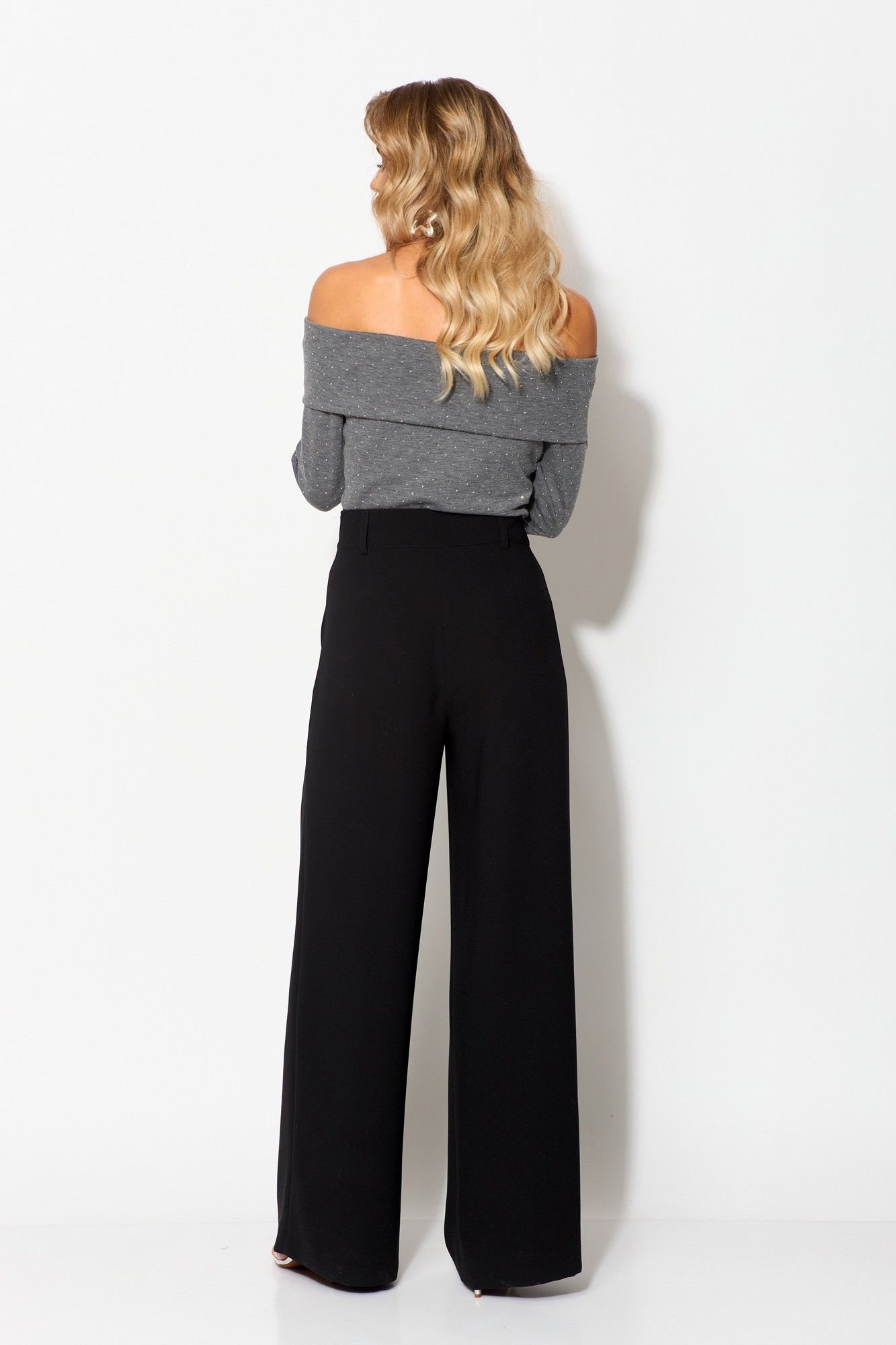 Джемпер женский, полуприлегающего силуэта, из трикотажного полотна, длиной до линии бедер, с втачными рукавами, с открытой линией плеча, с притачной декоративной планкой вверху, по шву соединения вставлена эластичная тесьма. Детали переда джемпера с нагрудными вытачками от верхнего подреза. Рукава втачные одношовные. Брюки на бедрах, плотно облегающие вверху и широкие к низу, с притачным поясом-кокеткой. Застежка на тесьму-молнию, 2 потайных крючка и 1 потайную петлю и пуговицу. В боковых швах обработаны наклонные карманы. На задних половинках брюк обработаны по 1 вытачке. На передних половинках брюк – по 1-ой складке. На поясе прикреплены 4 шлёвки. Декор может отличаться от представленного на фотографии. Джемпер: длина рукава - 54см, ширина рукава – 17см, длина спинки – 45см. Брюки: длина по боковому шву – 103см.