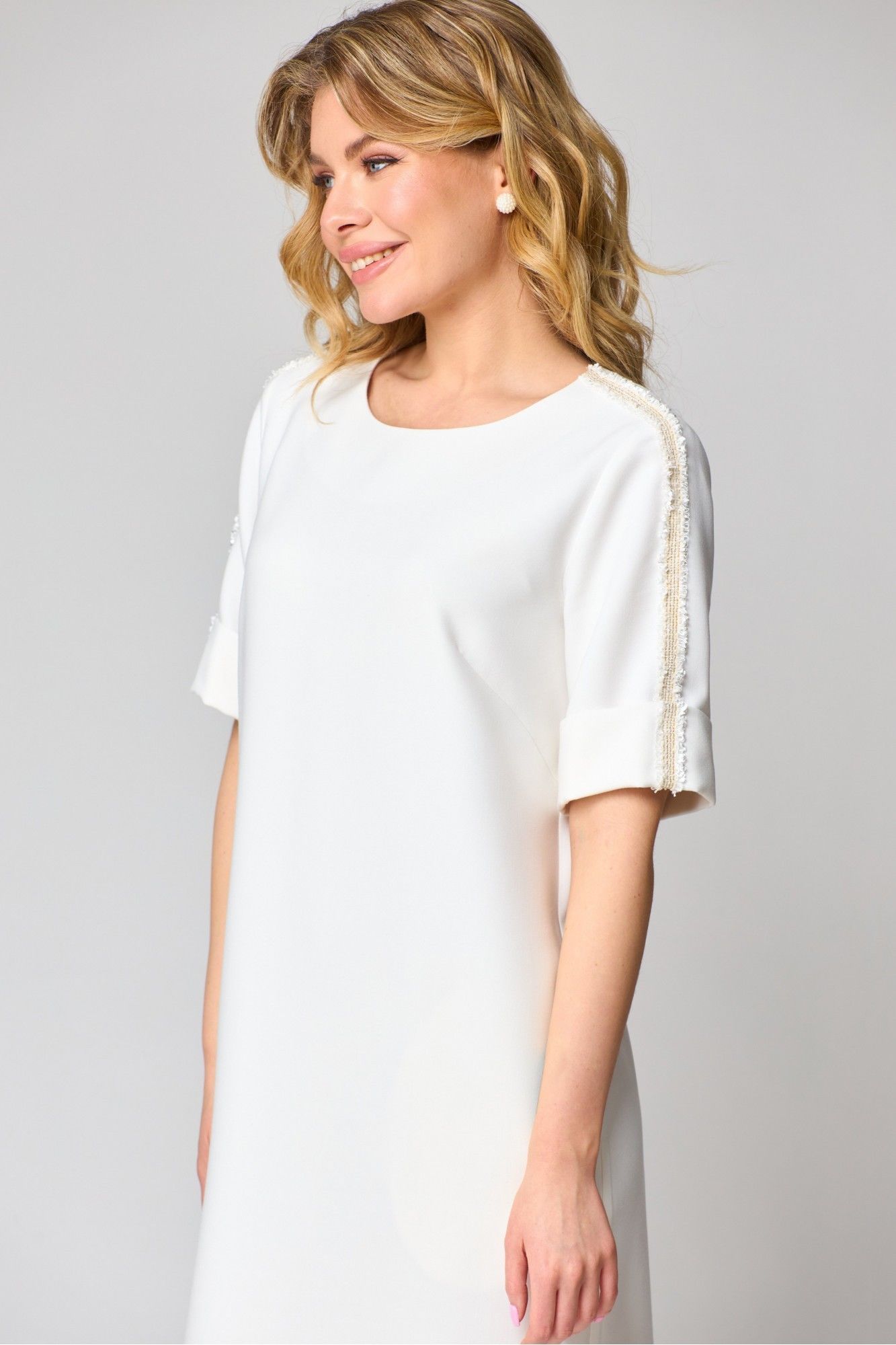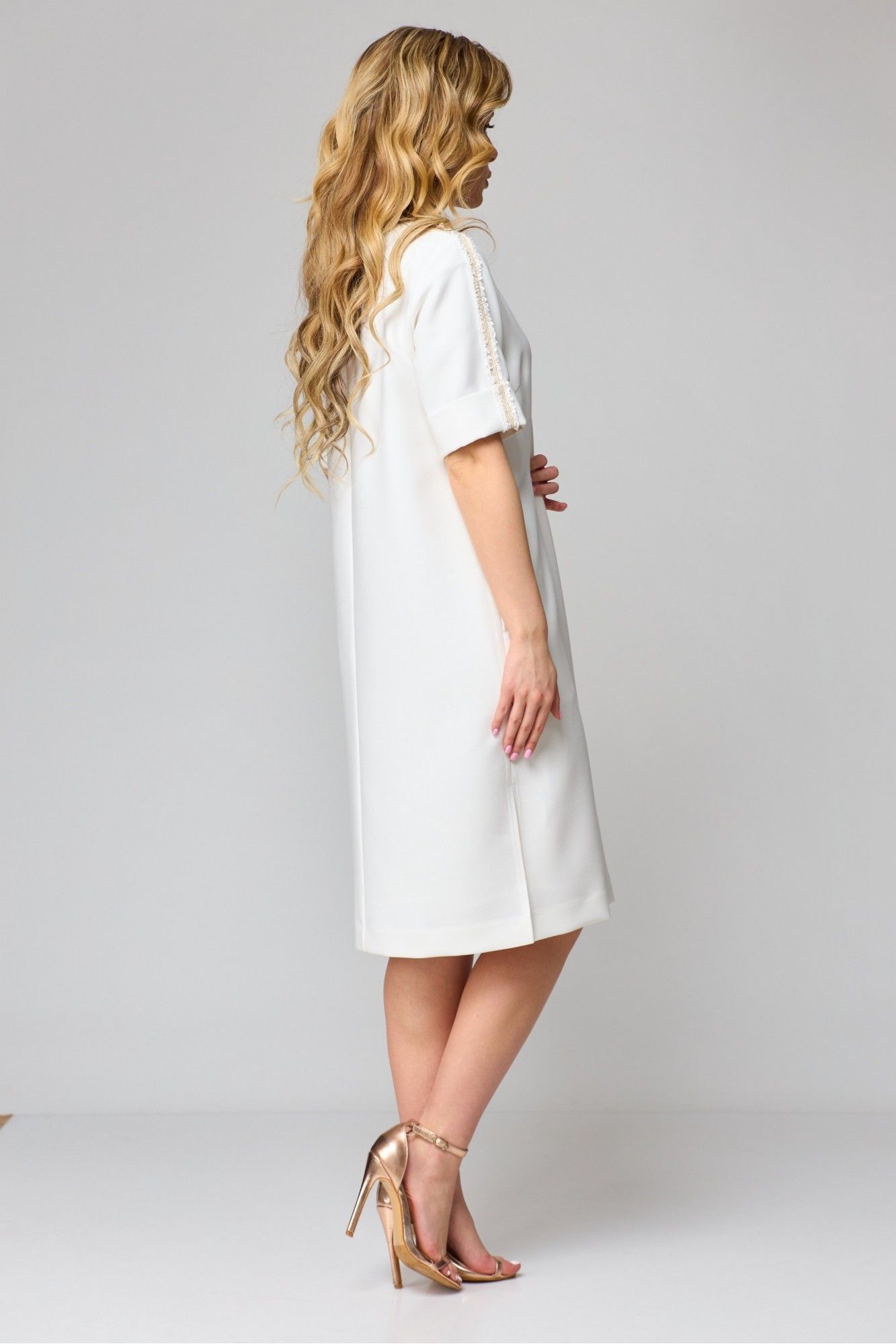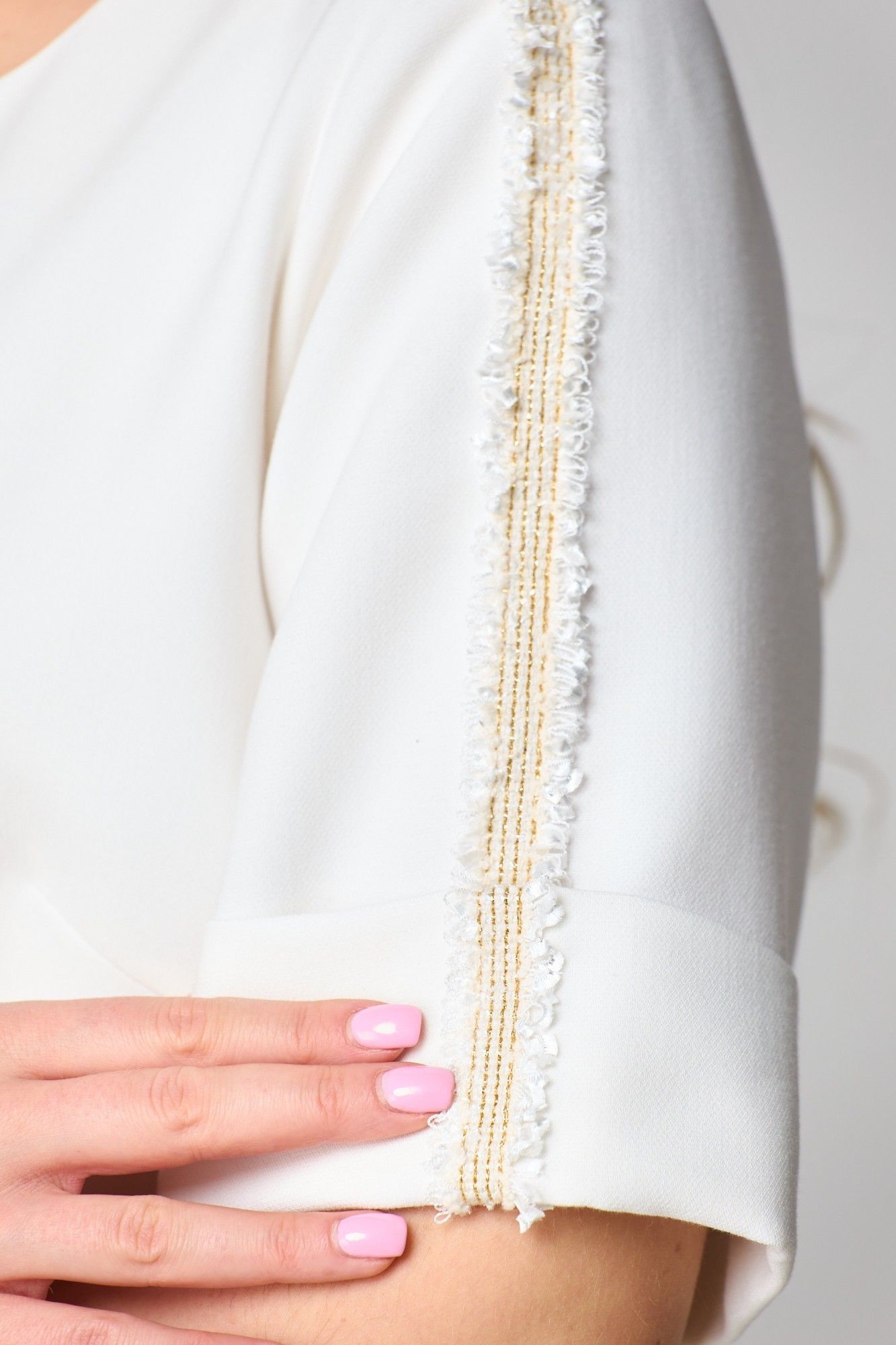 Платье женское, прямого силуэта, на подкладке, длиной ниже коленей, с втачными рукавами, с разрезами в боковых швах. Деталь переда платья с нагрудными вытачками. Деталь спинки платья со средним швом, вверху которого обработан разрез с застежкой на 1 петлю и навесную петлю. Рукава втачные одношовные, короткие, с отворотом. По плечевым швам и по центру рукавов вертикально настрочена декоративная тесьма. Вырез горловины платья округлой формы, обработан обтачкой. Платье: длина рукава - 28см, ширина рукава – 19см, длина спинки – 100см".
