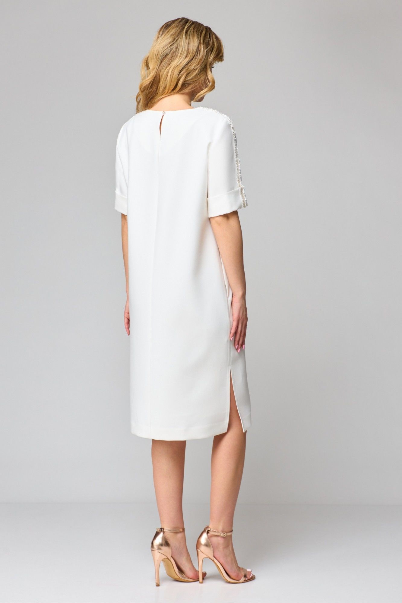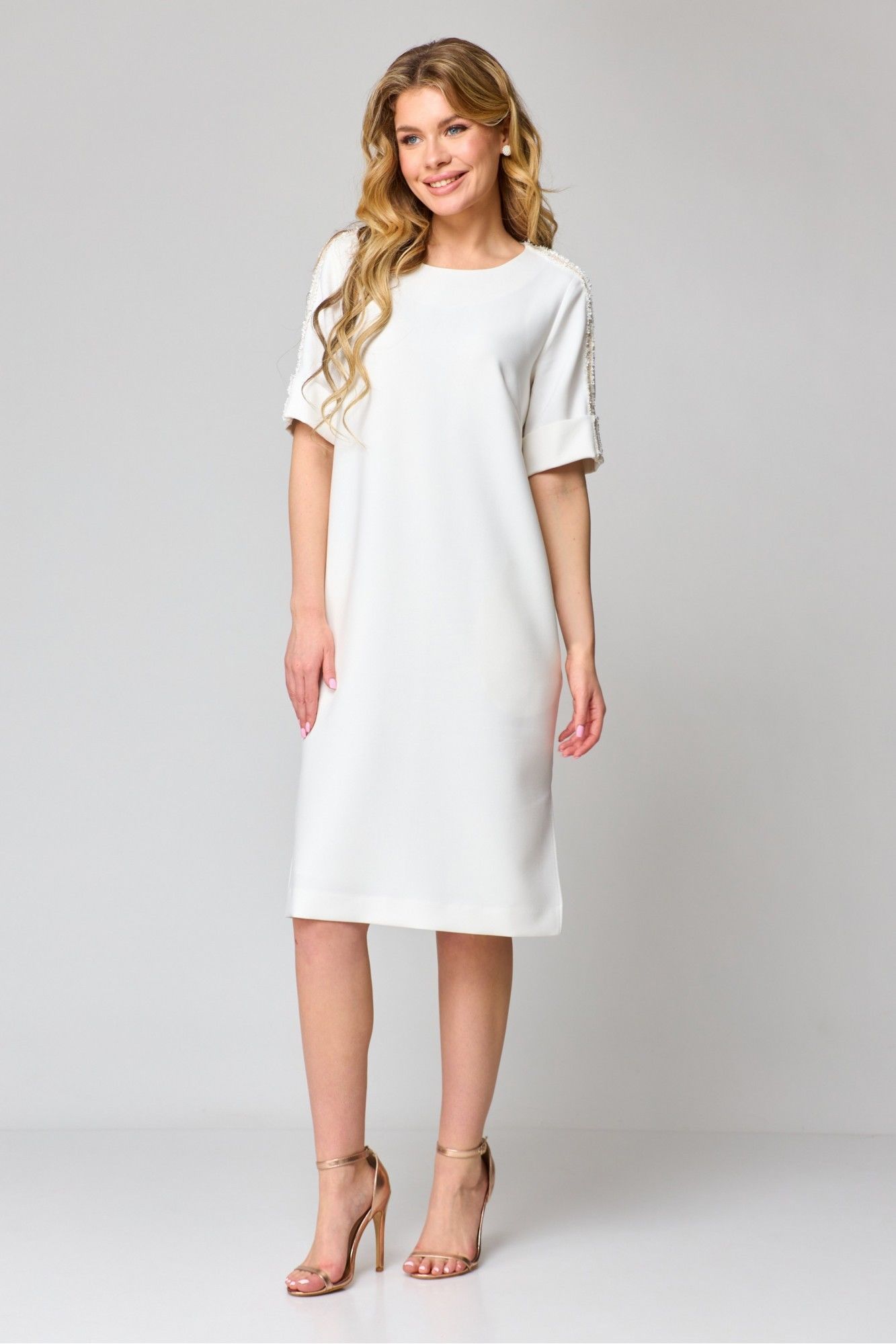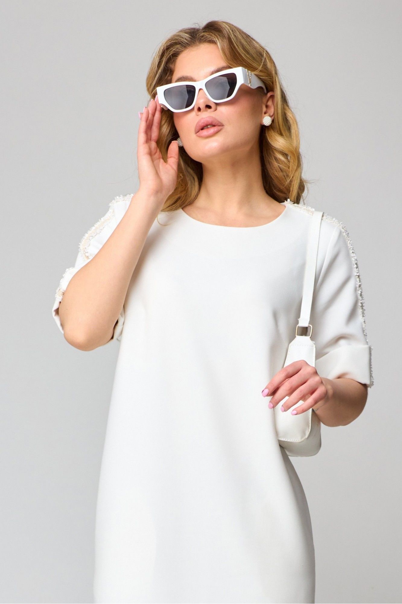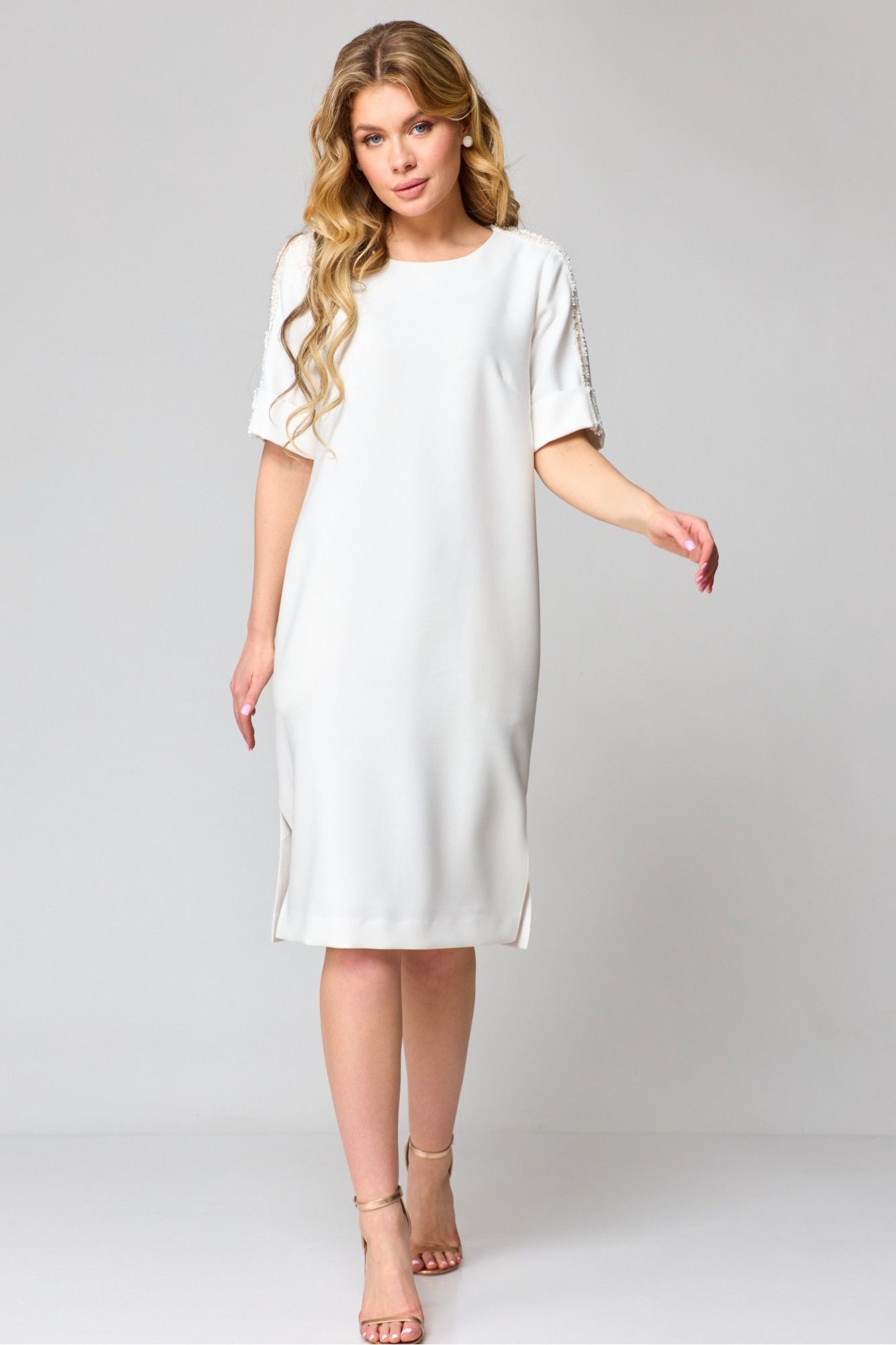 Платье женское, прямого силуэта, на подкладке, длиной ниже коленей, с втачными рукавами, с разрезами в боковых швах. Деталь переда платья с нагрудными вытачками. Деталь спинки платья со средним швом, вверху которого обработан разрез с застежкой на 1 петлю и навесную петлю. Рукава втачные одношовные, короткие, с отворотом. По плечевым швам и по центру рукавов вертикально настрочена декоративная тесьма. Вырез горловины платья округлой формы, обработан обтачкой. Платье: длина рукава - 28см, ширина рукава – 19см, длина спинки – 100см".