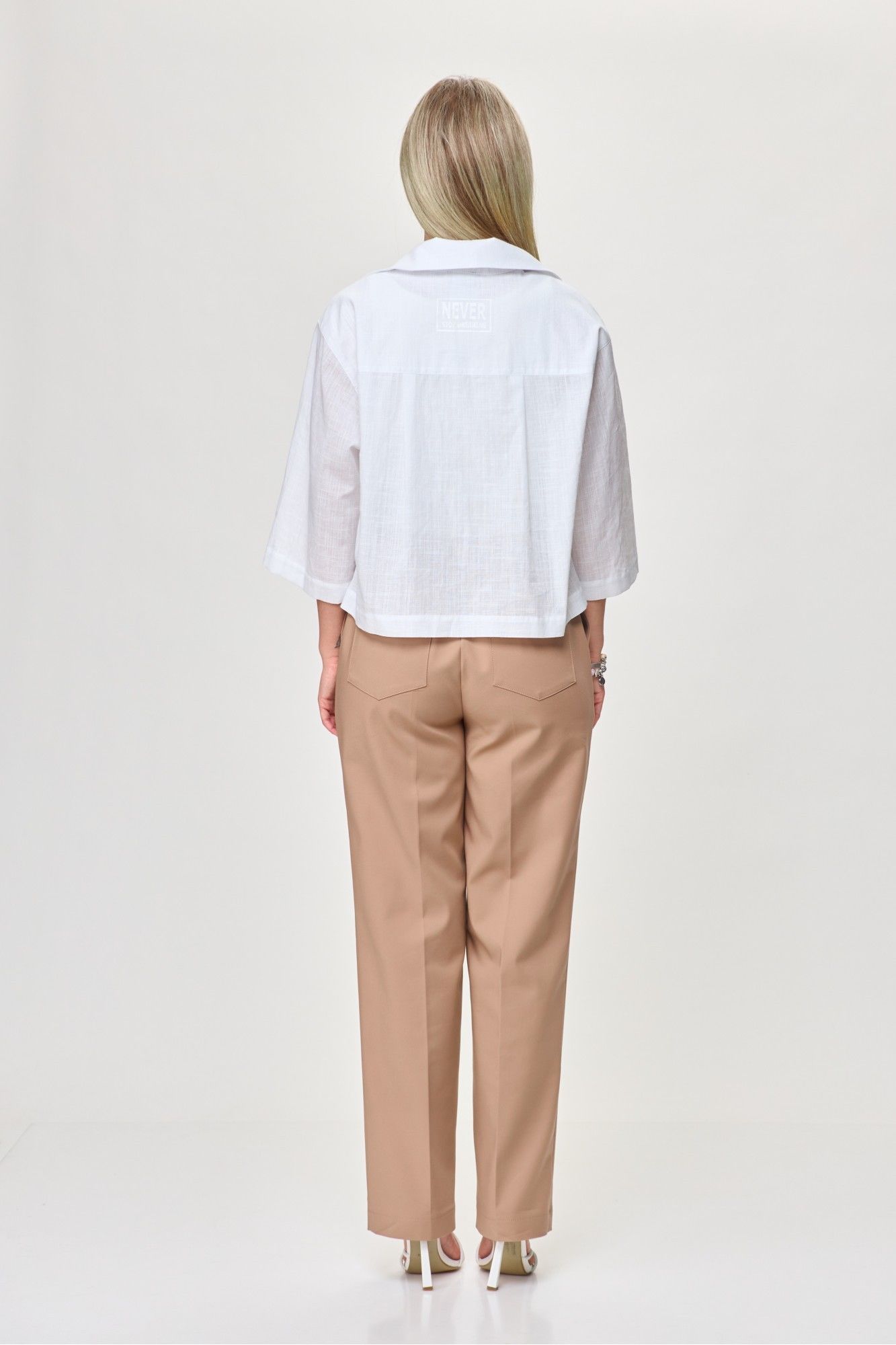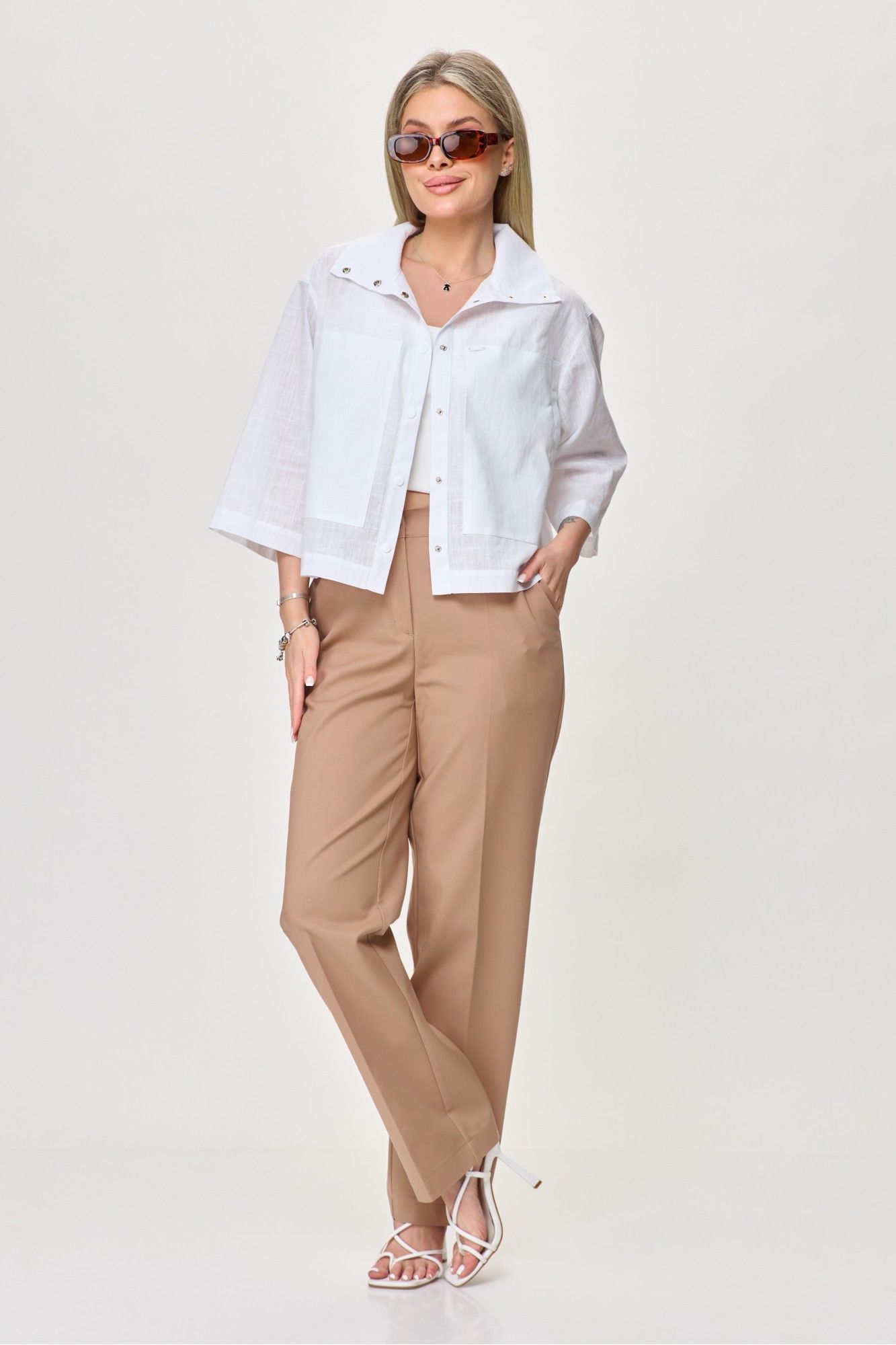 блузка: лен – 55%, вискоза – 45%. брюки: хлопок – 58%, полиамид– 37%, спандекс – 5%.