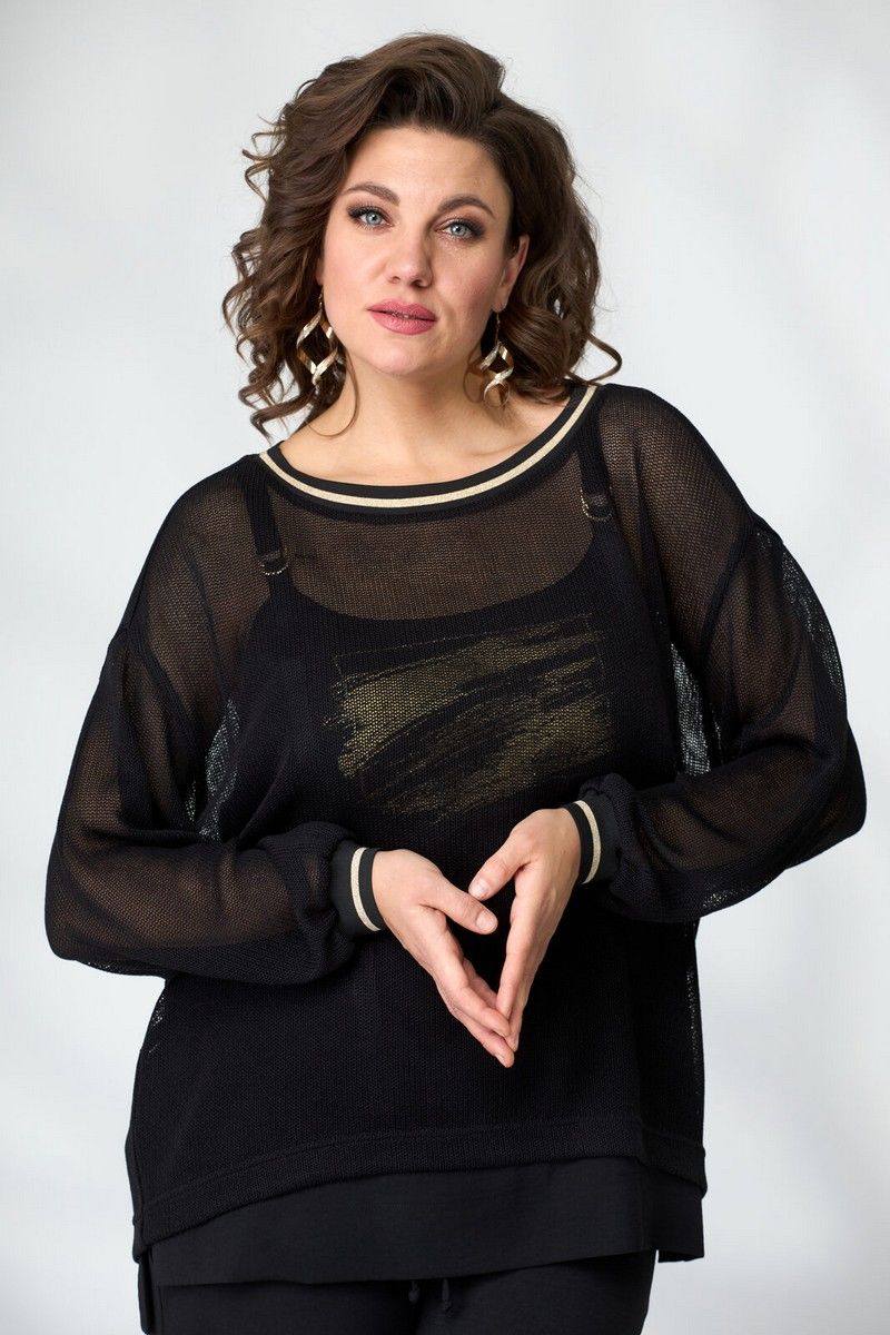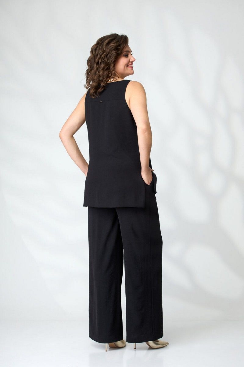 Комплект женский трехпредметный, состоящий из топа, туники и брюк. Туника свободного кроя с рукавом рубашечного типа. По горловине и низу рукава - отделочная эластичная тесьма. Топ прилегающего силуэта, по боковымшвам - разрезы. Спинка длиннее полочки на 5 см. По переду брители с застежкой на отделочные полукольца и репсовую тесьму. По полочке - печать. Брюки свободные, полной длины, прямые от бедра. В боковых швах обработаны карманы, пояс на резинке со шнурком.