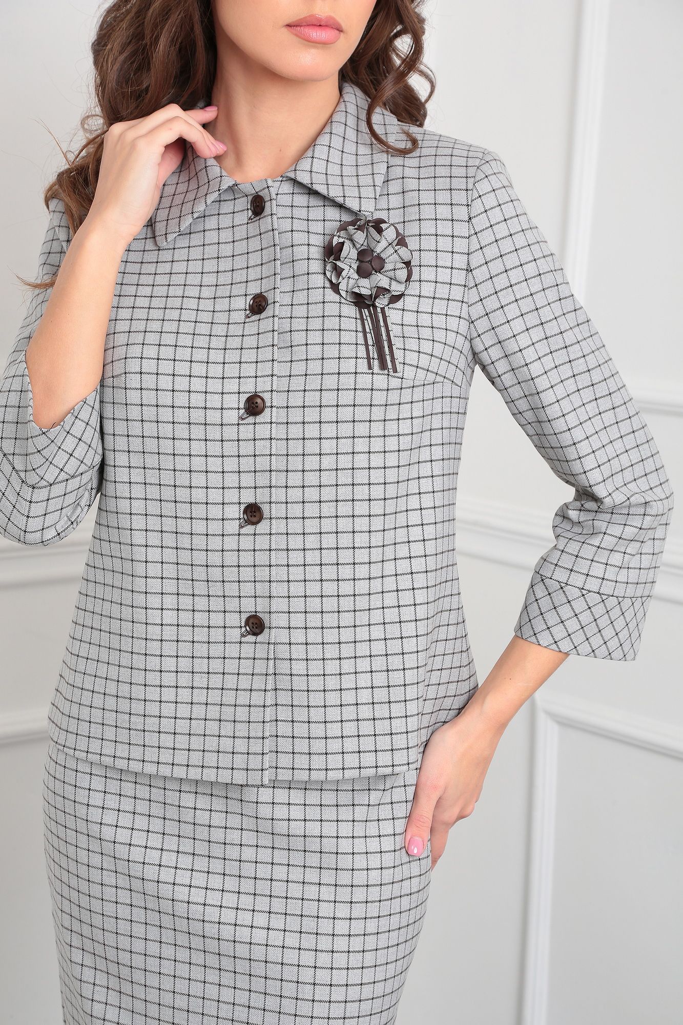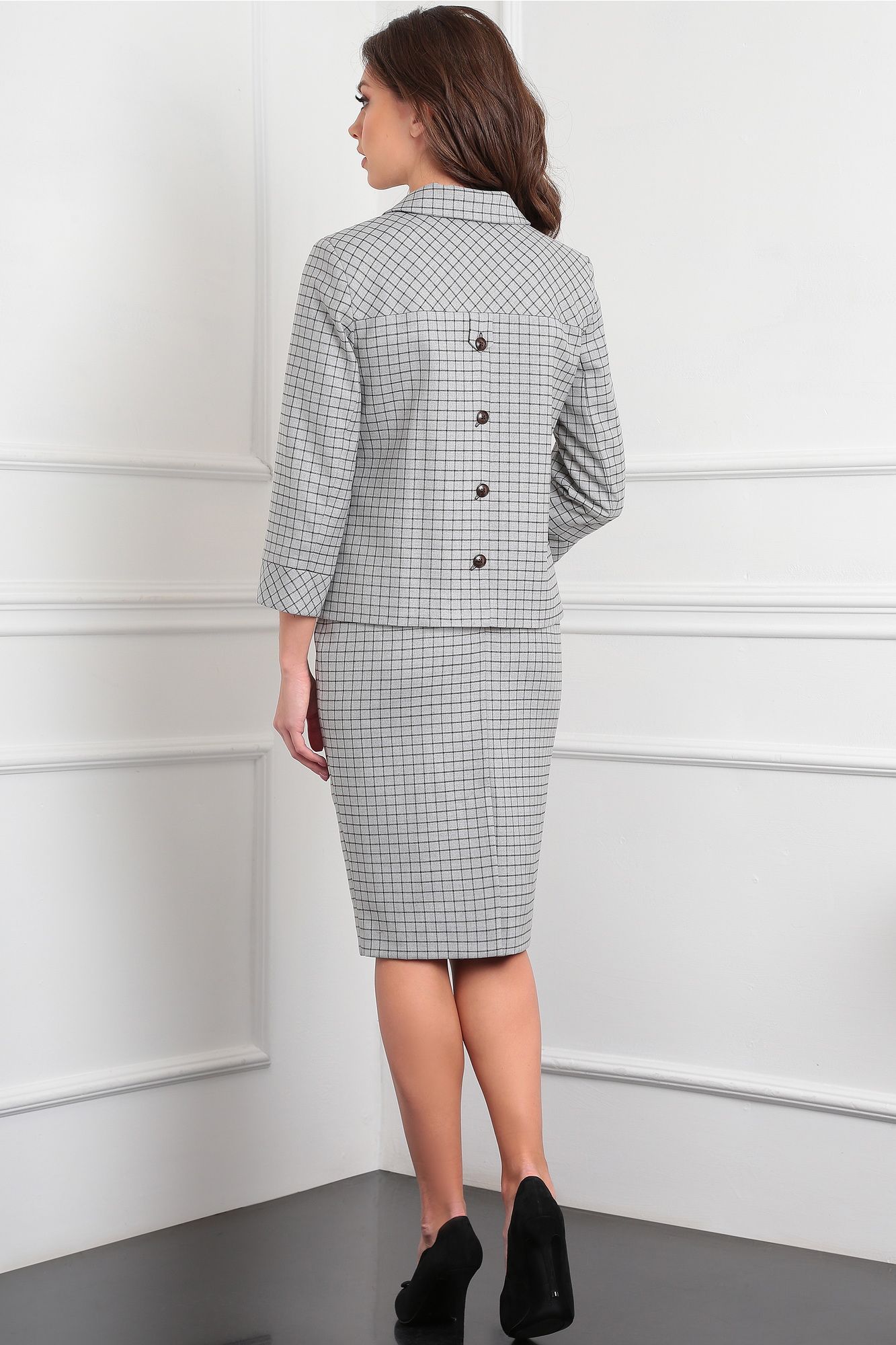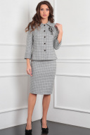 Комплект женский, состоящий из жакета и юбки. Жакет полуприлегающего силуэта на подкладке, воротник стояче-отложной, застежка центральная бортовая, на декоративные петли и пуговицы. Рукав втачной двухшовный. укороченный, с притачной манжетой по низу. По спинке отрезная кокетка и декоративная складка с петлями и пуговицами и хлястиком из кокетки. Юбка полуприлегающего силуэта на подкладке, со шлицей, зауженная к низу, пояс фигурный. Застежка на потайную тесьму молнию в среднем шве заднего полотнища. Модель идёт без броши
