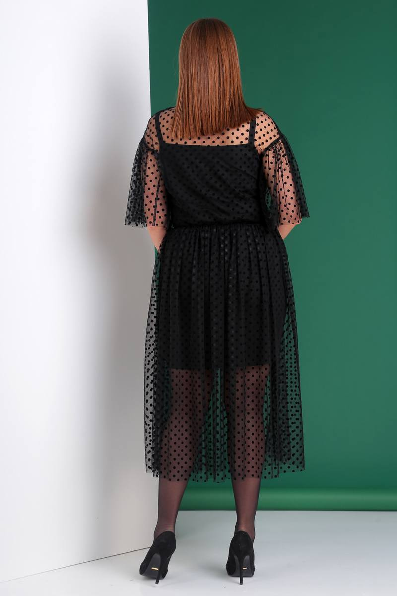 Нижнее платье выполнено из трикотажного крепа, верхнее из сетки с флоком. Длина нижнего платья от плеча: 89 см. Длина верхнего платья: 127 см.