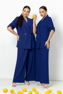Трендовый брючный костюм с широкими брюками и свободным двубортным жакетом настоящий хит. Двубортный жакет прямого силуэта мягкой формы с воротником пиджачного типа. Перед оформлен нагрудными вытачками из проймы и горизонтальными карманами в рамку с клапанами. Спинка со средним швом. Рукава втачные свободные с патами. Прямые широкие брюки средней посадки с отрезным поясом. В размерах 54,56,58 брюки с резинкой по талии. Застежка обработана как в брюках (гульфик с молнией и пуговица на поясе). Вся обработка выполнена как в классических итальянских костюмах перед и спинка жакета на х/б подкладке. ВОЗМОЖНА ЗАМЕНА ФУРНИТУРЫ НА АНАЛОГИЧНУЮ ТАКОГО ЖЕ КАЧЕСТВА.