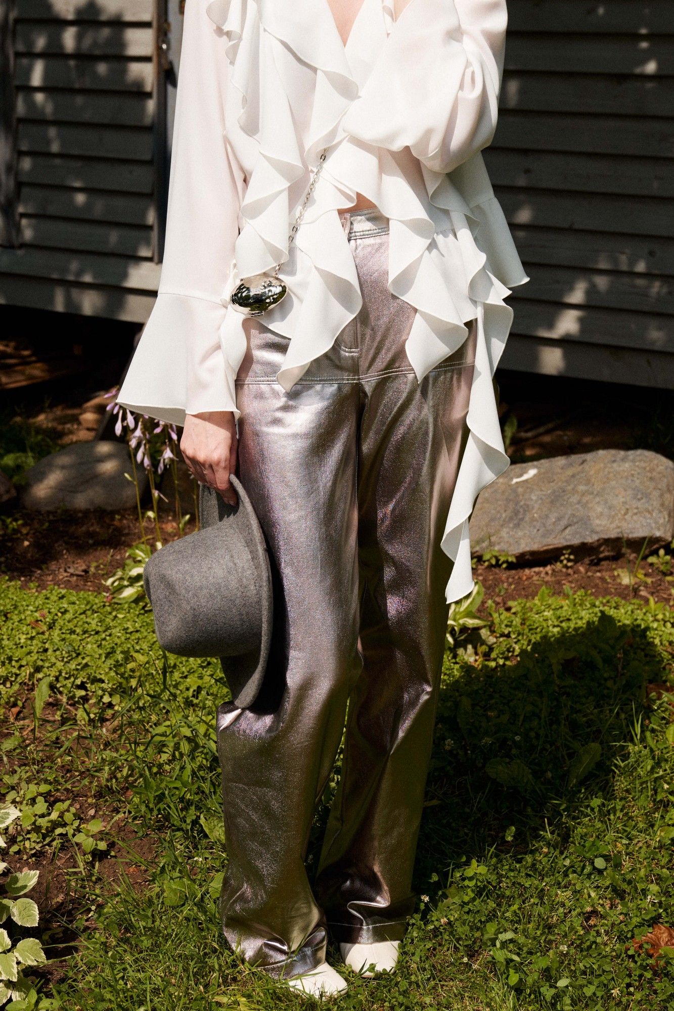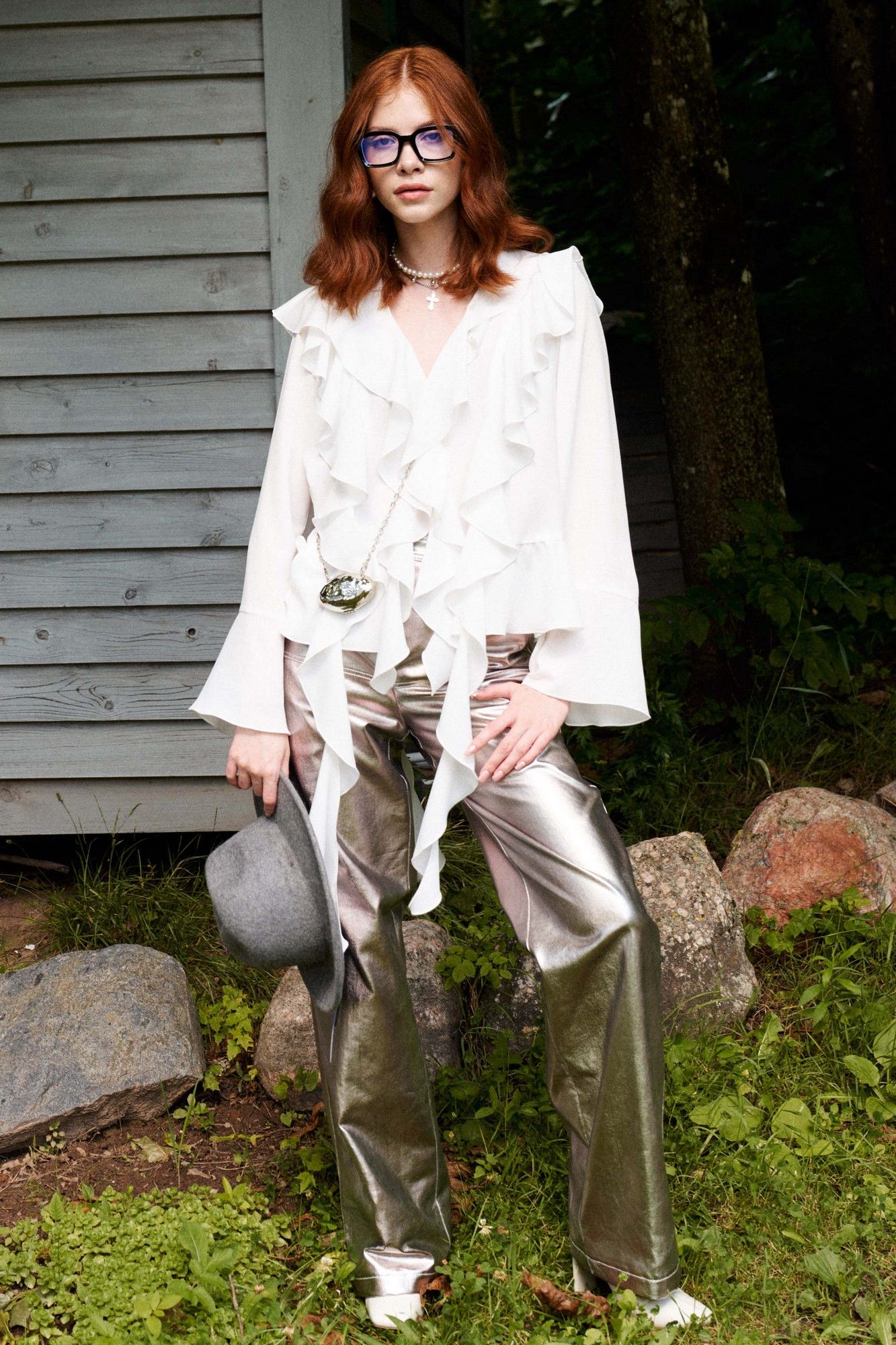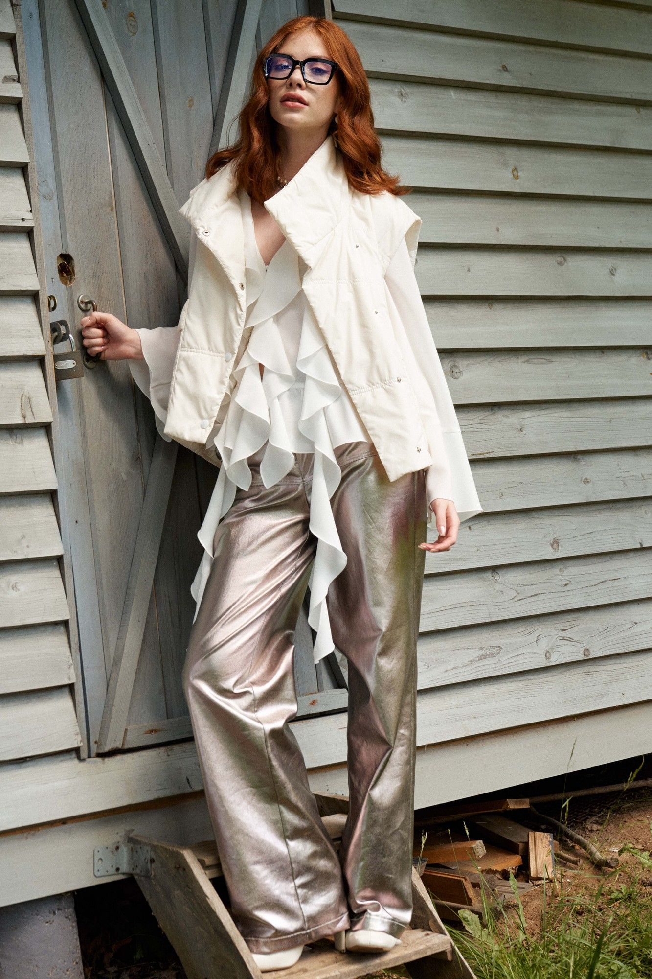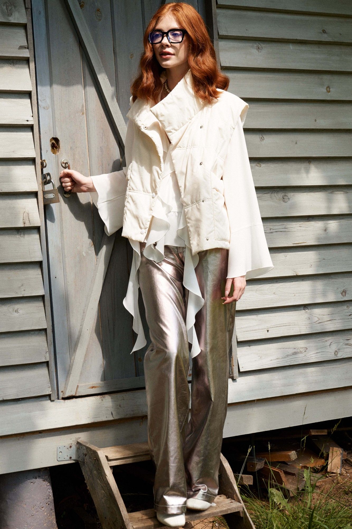 Брюки прямого силуэта на притачном поясе, в боковых швах карманы, застёжка на молнию. На задней половинке брюк накладные карманы фигурной формы, по передней и задней половинке брюк по линии бёдер подрез. Длина изделия: 114,5 см ОТ: 69-73-77-81 см (размер 42-44-46-48) ОБ: 92-96-100-104 см (размер 42-44-46-48)