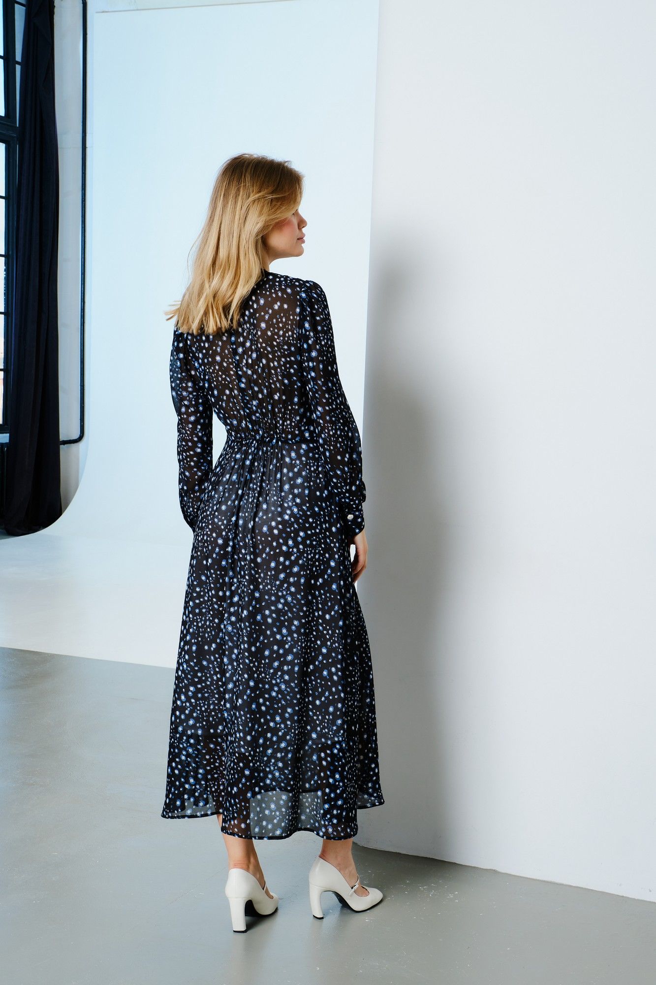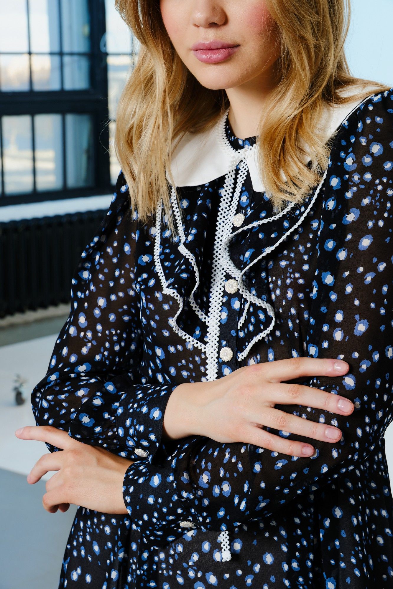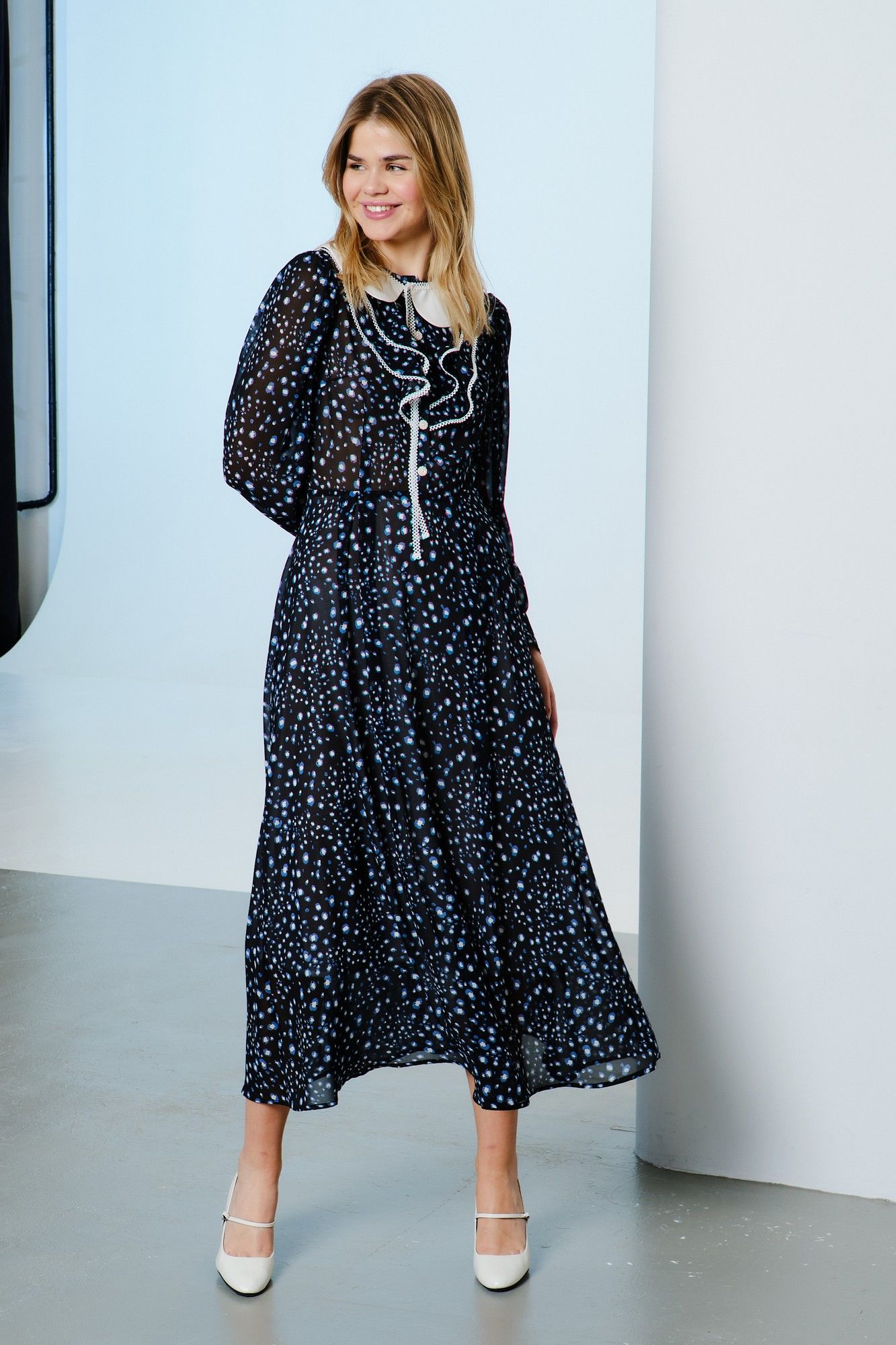 Платье полуприлегающего силуэта выполнено из шифона, по юбке трикотажная подкладка. Рукав втачной, по низу рукава манжета на застёжку петли и пуговицу. Округлый вырез горловины, воротник съёмный на завязку, по переду планка с рюшами с пришивным кружевом, застёжка на петли и пуговицы. Платье отрезное по линии талии, по спинке для удобства в носке в шов вставлена резинка. По линии талии юбка собрана на сборку. Длина по спинке от высшей точки горловины: 134 см Длина рукава: 62 см ОГ: 88-92-96-100 см (размер 42-44-46-48) ОТ: 68-72-76-80 см (размер 42-44-46-48)