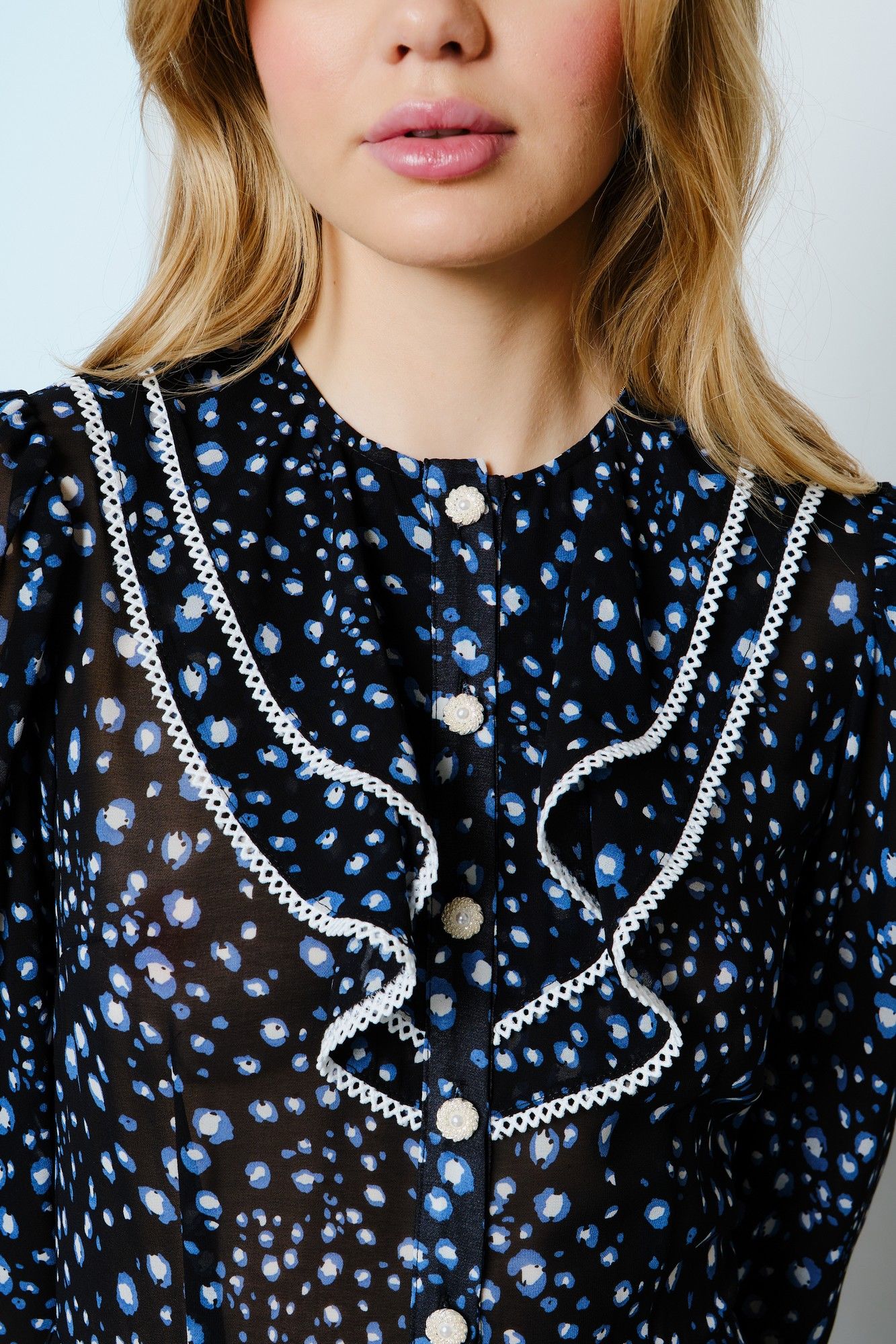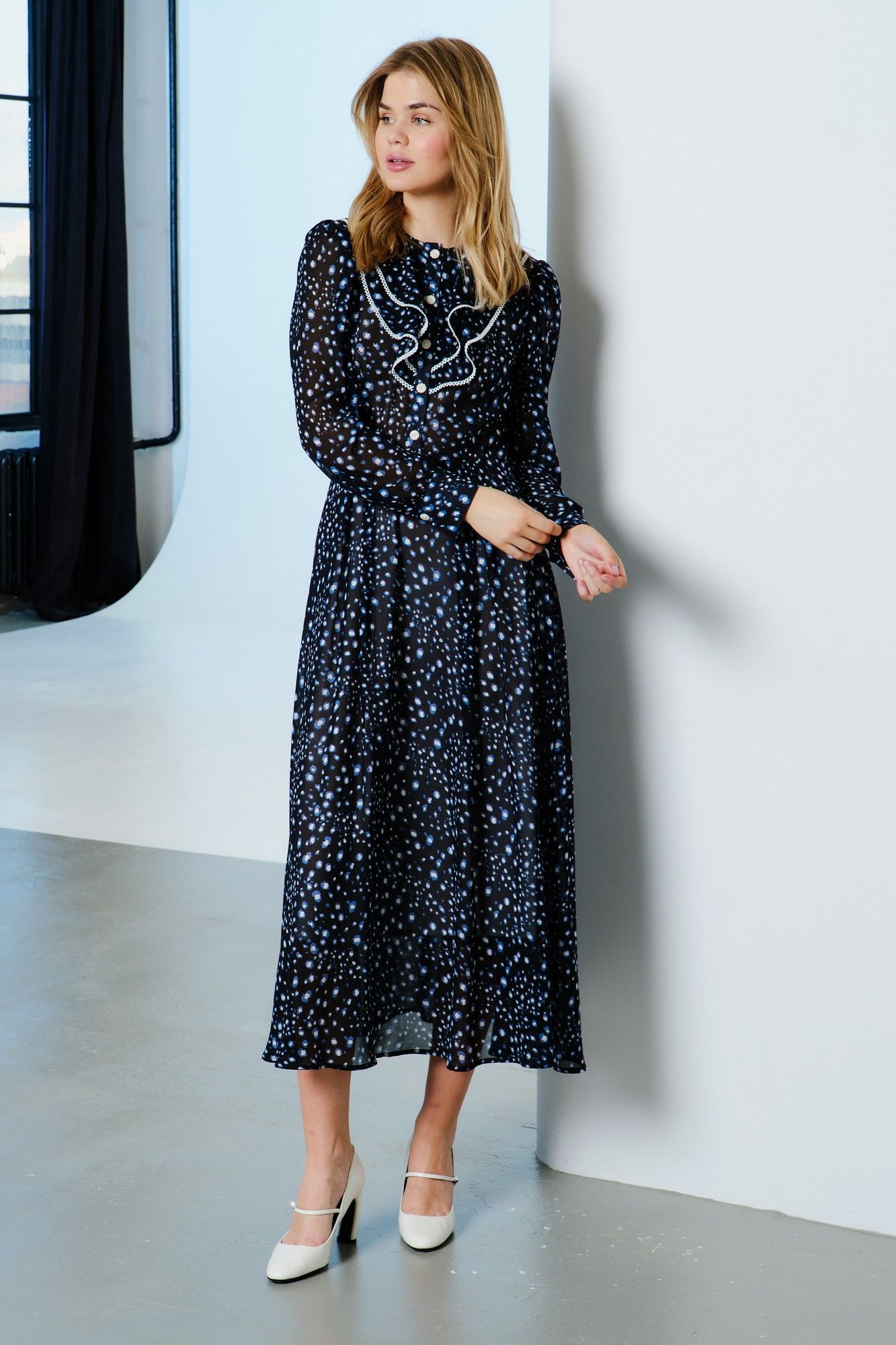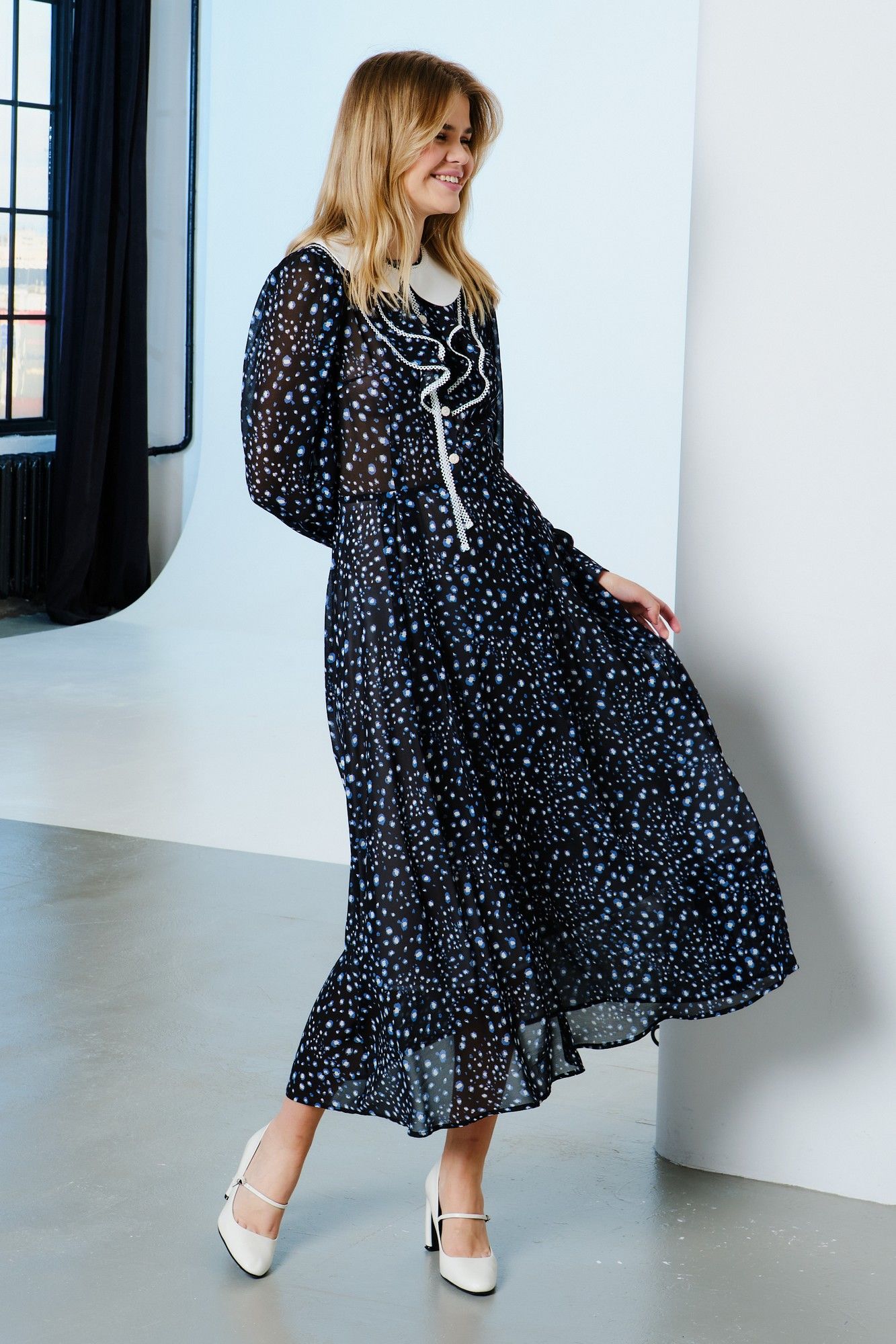 Платье полуприлегающего силуэта выполнено из шифона, по юбке трикотажная подкладка. Рукав втачной, по низу рукава манжета на застёжку петли и пуговицу. Округлый вырез горловины, воротник съёмный на завязку, по переду планка с рюшами с пришивным кружевом, застёжка на петли и пуговицы. Платье отрезное по линии талии, по спинке для удобства в носке в шов вставлена резинка. По линии талии юбка собрана на сборку. Длина по спинке от высшей точки горловины: 134 см Длина рукава: 62 см ОГ: 88-92-96-100 см (размер 42-44-46-48) ОТ: 68-72-76-80 см (размер 42-44-46-48)